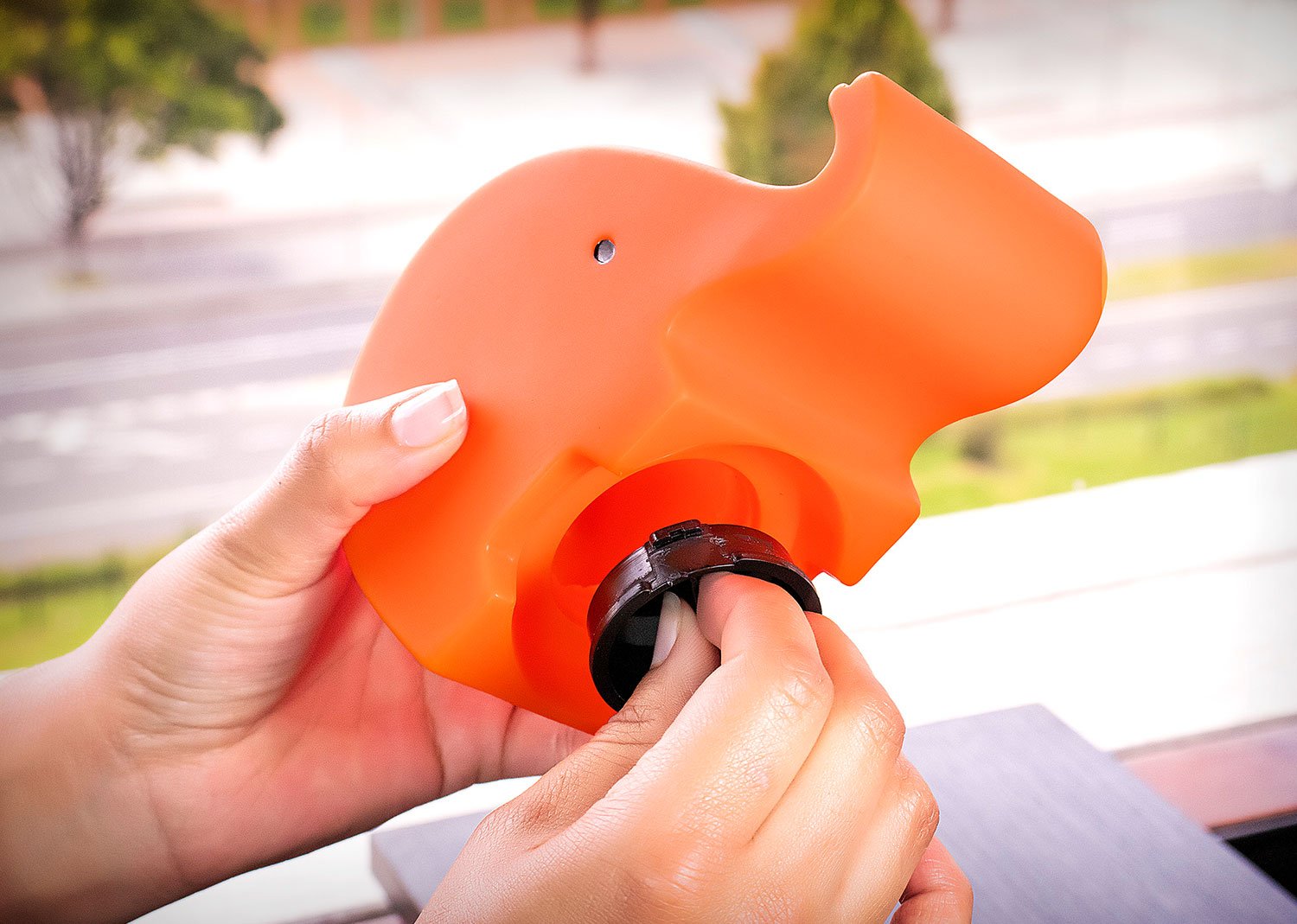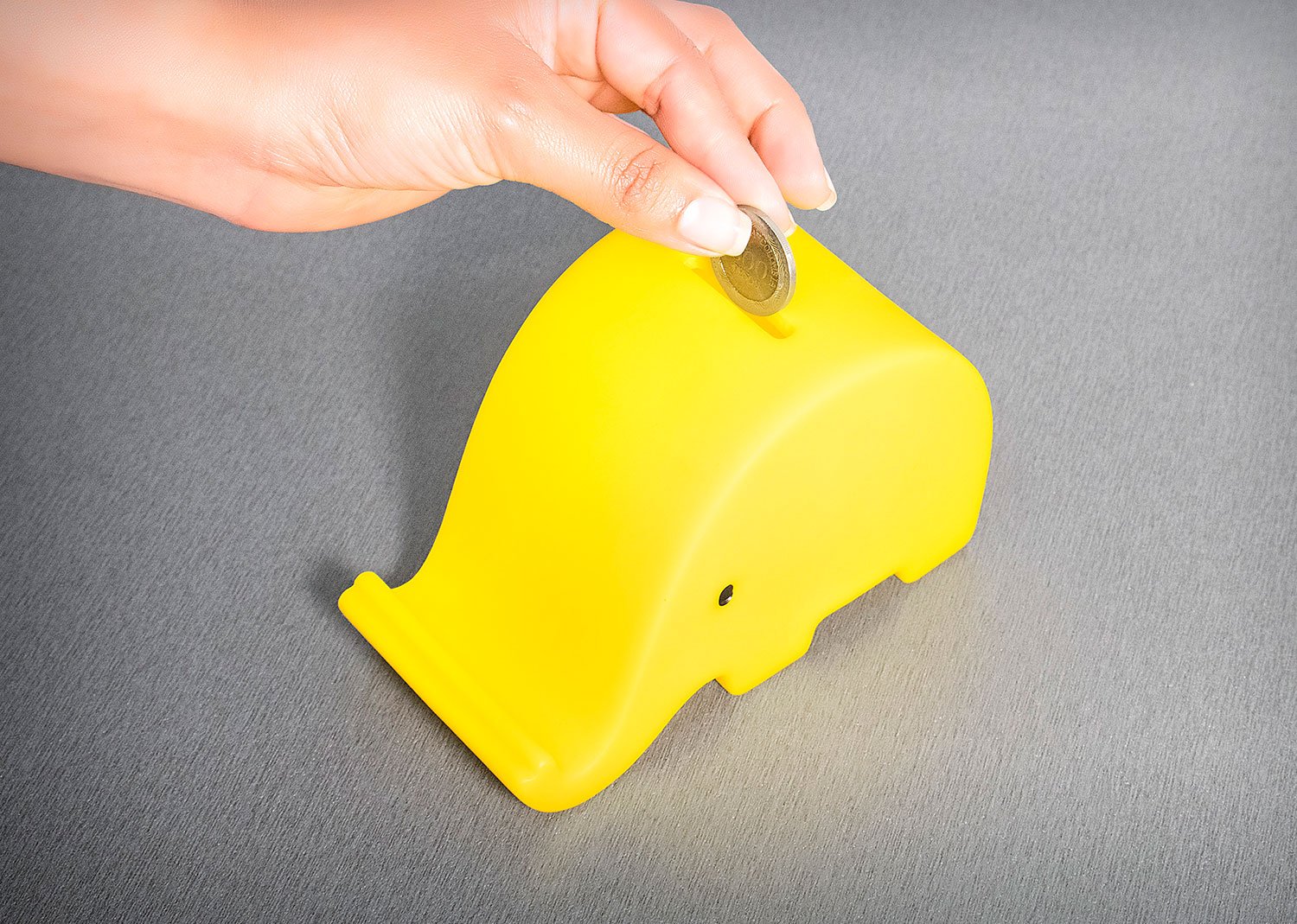 Alcancía con diseño de elefante. Su trompa sirve como holder para celular. Con tapón en la parte inferior para vaciar la alcancía.