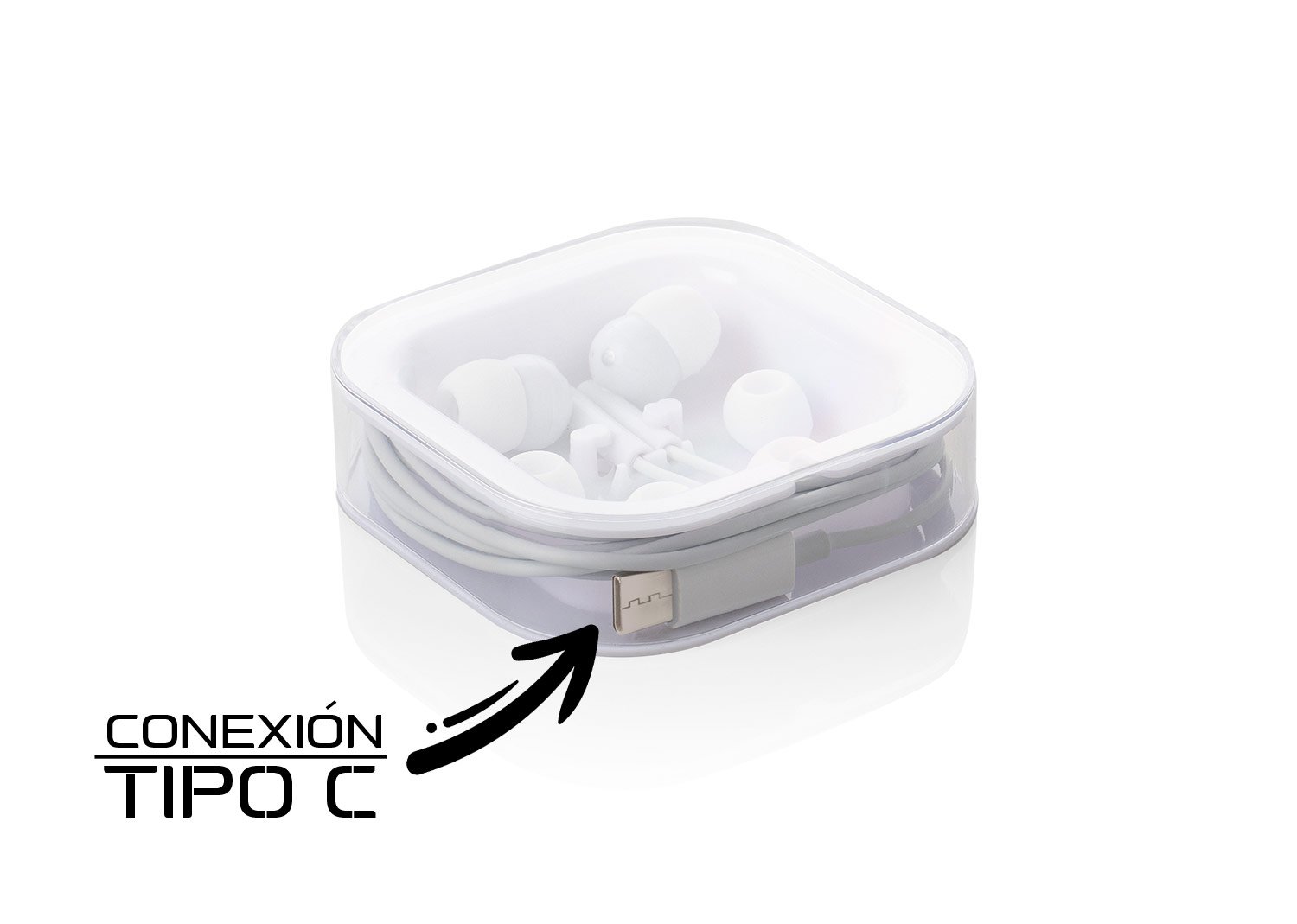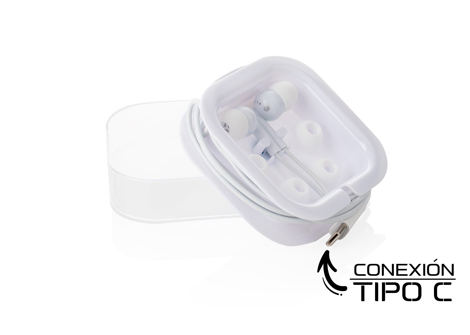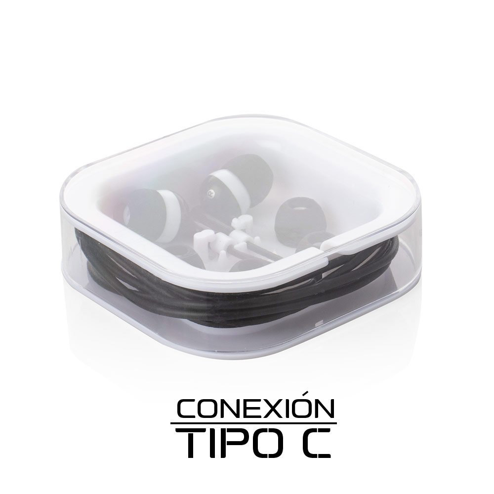 Audífonos con entrada tipo C en estuche cuadrado transparente a presión.