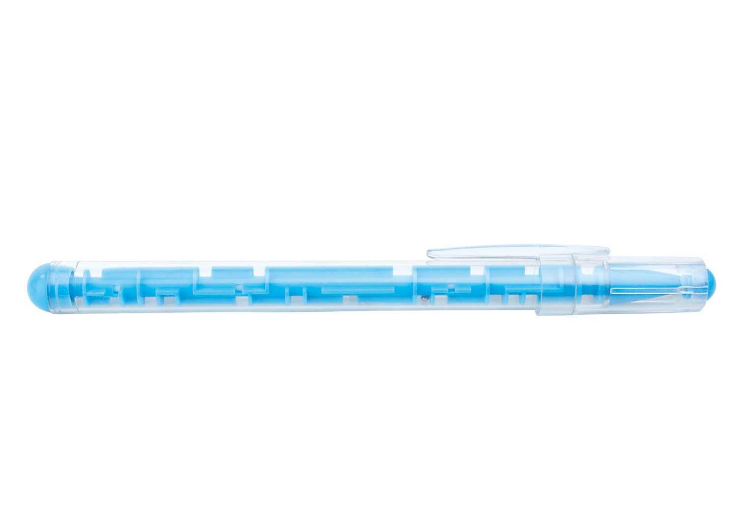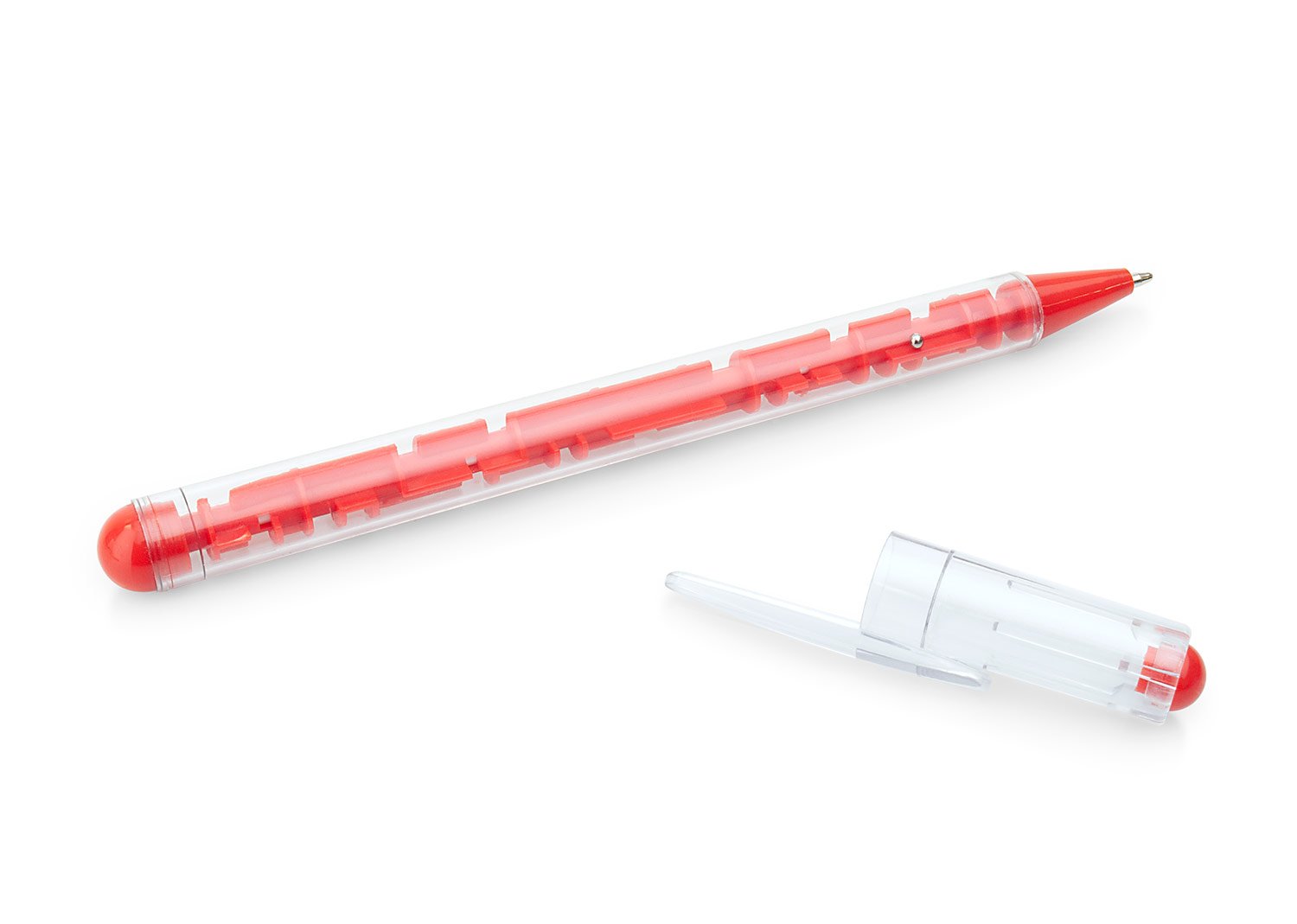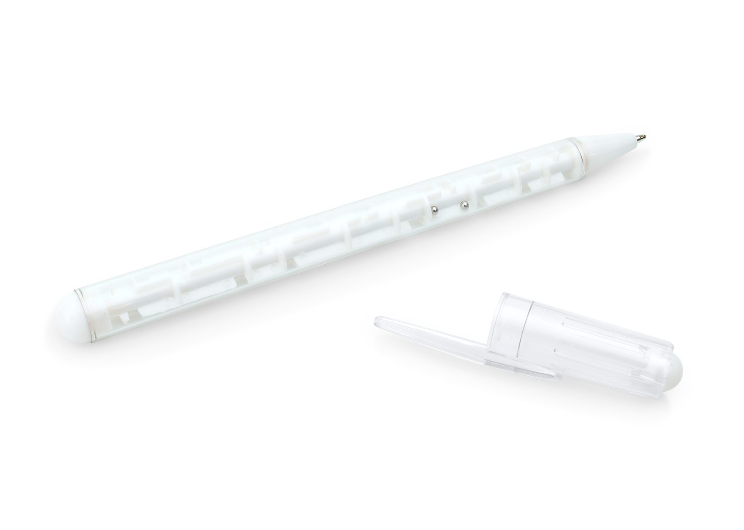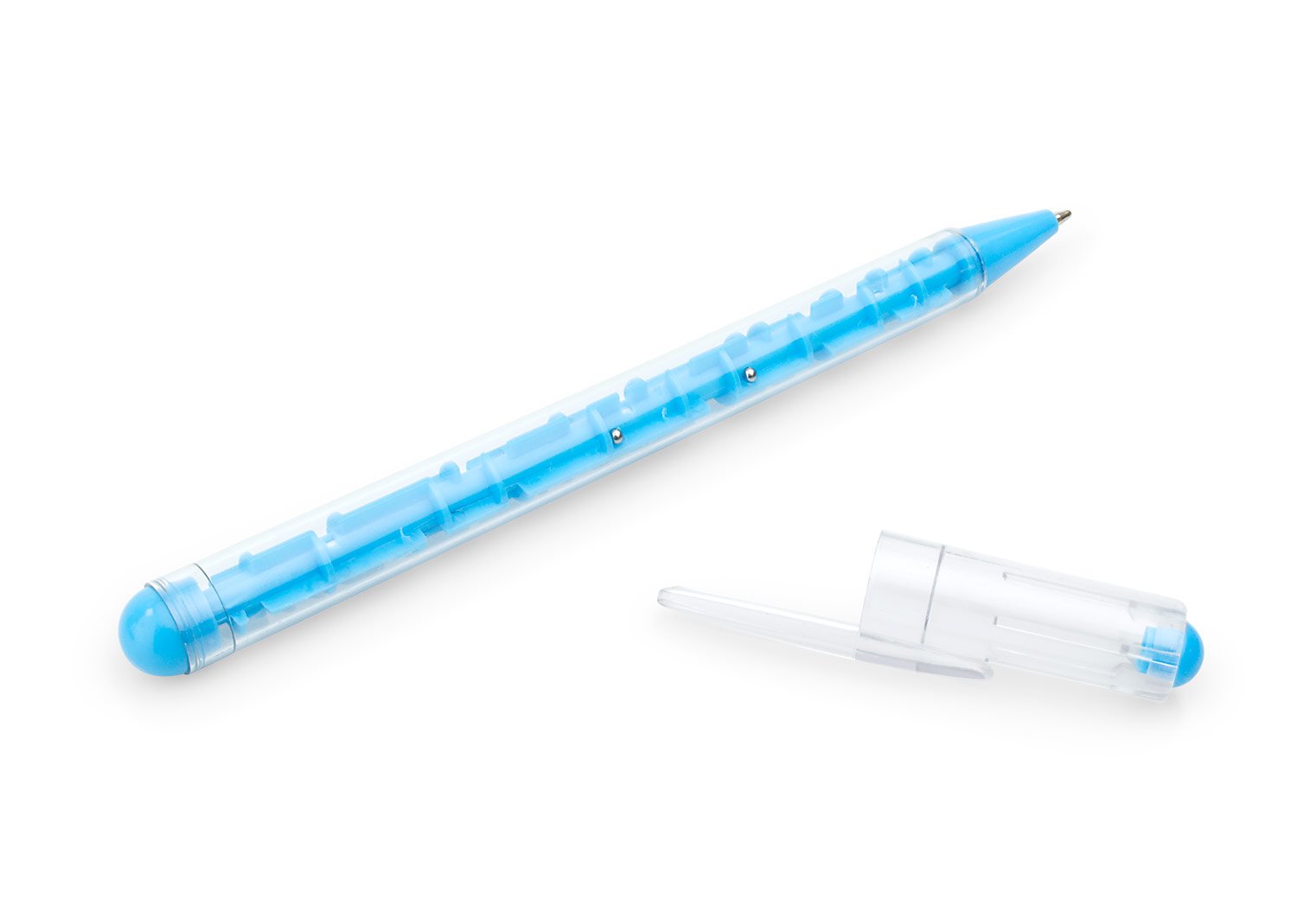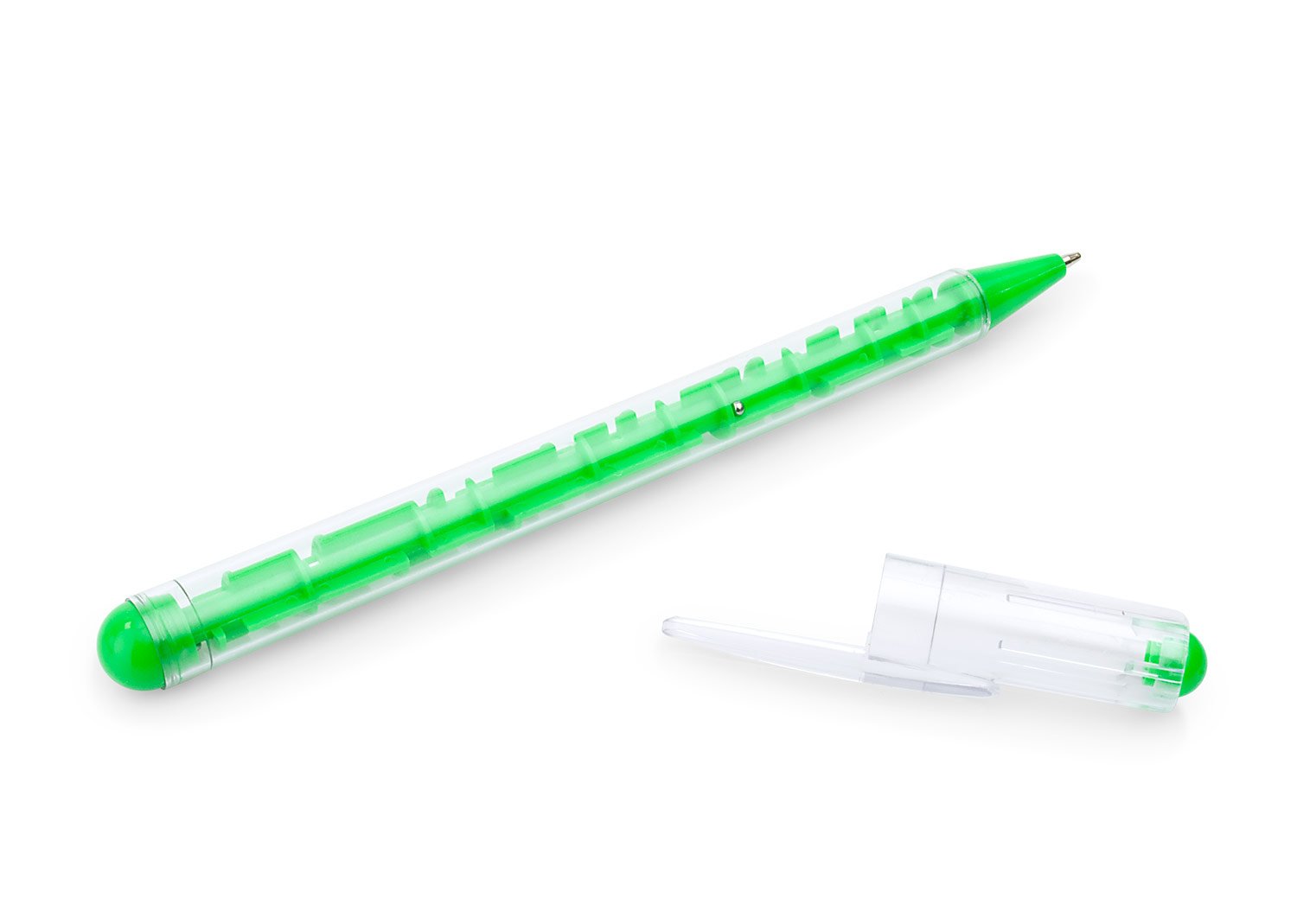 Bolígrafo plástico con tapa, en la parte interna tiene un jueego para disfrutar mientras se utiliza (Bolígrafo/Esfero)