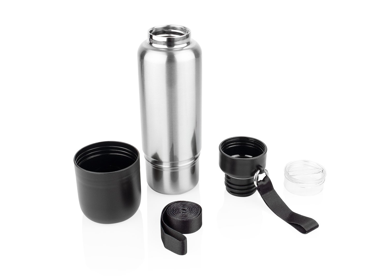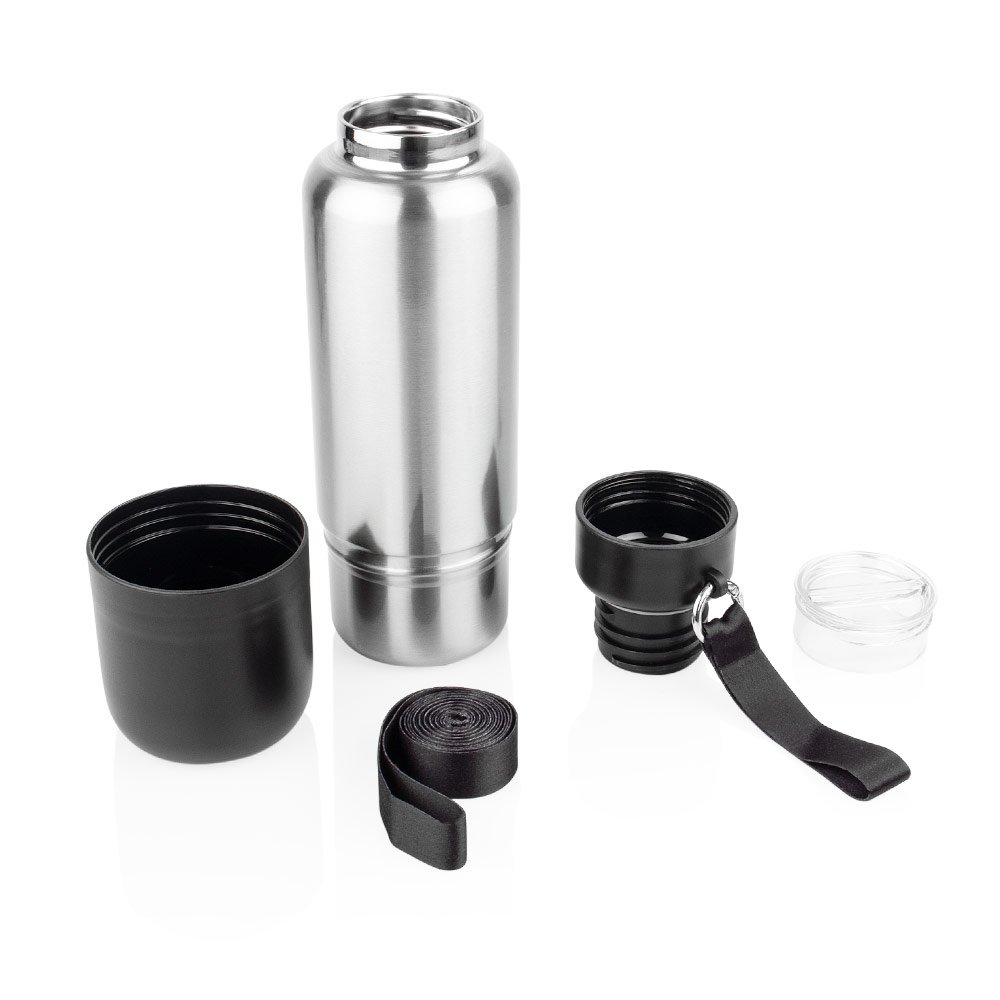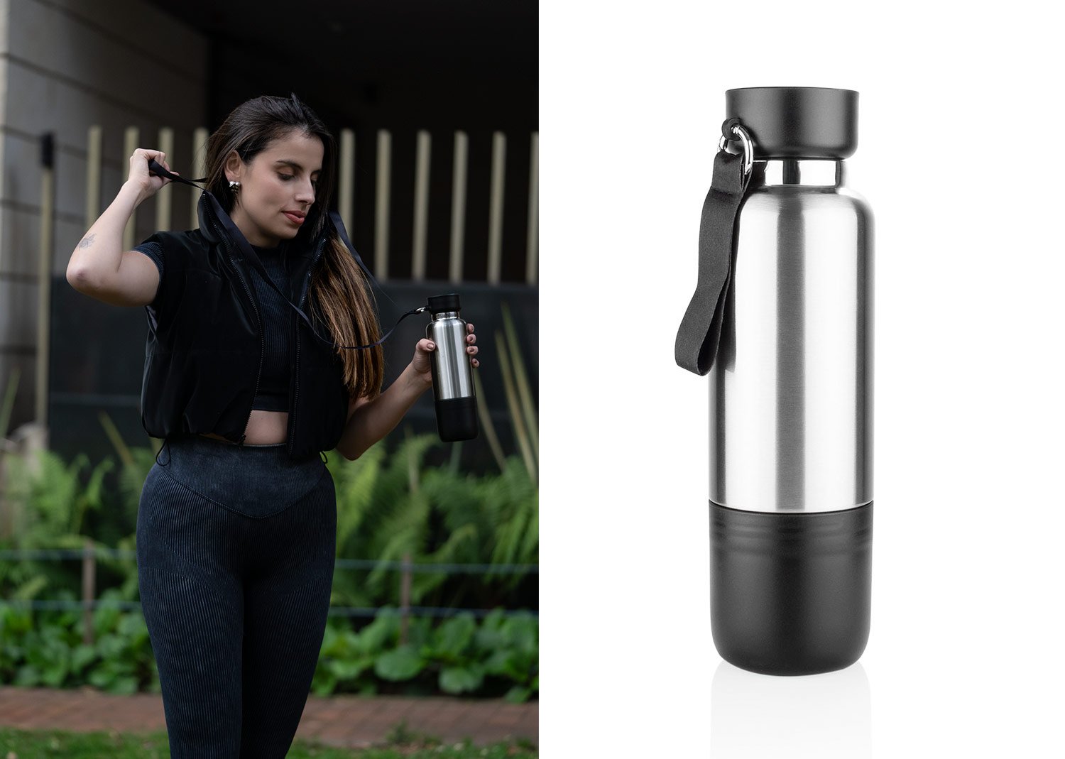 Botellas en AceroBotella Vacuum. Cuerpo de acero inoxidable de doble pared al vacío. Tapa de plástico con función de almacenamiento y cordón de 2 tamaños. Base de plástico extraíble con función de taza. Capacidad: 500 ml / 17 Oz.