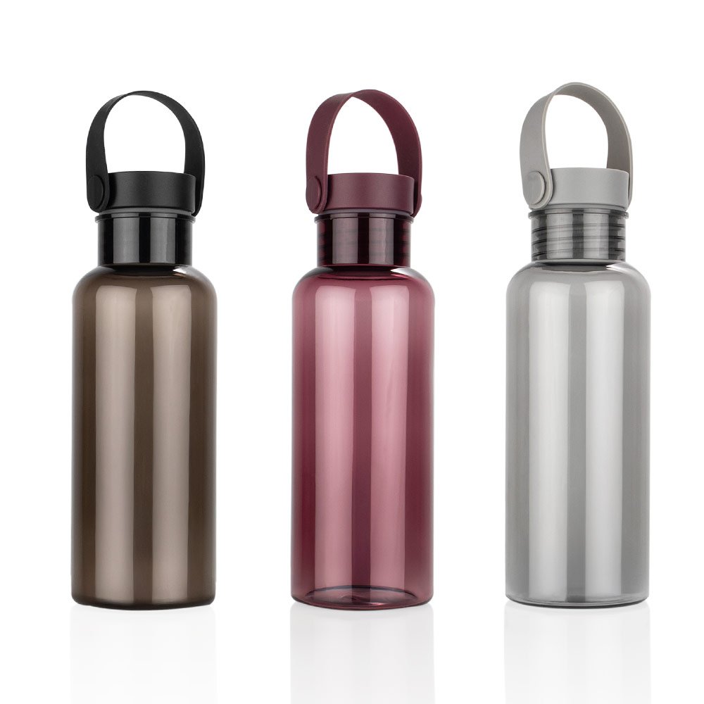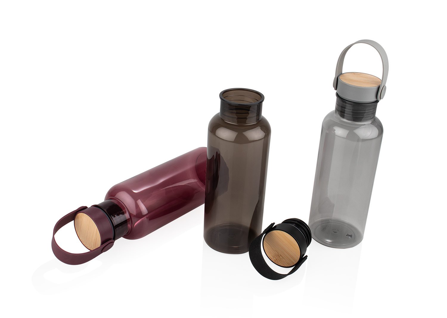 Botellas Deportivas PlásticasBotella de RPET con tapón de bambú PP. Incluye manija para transporte. Capacidad: 650 ml / 22 Oz .