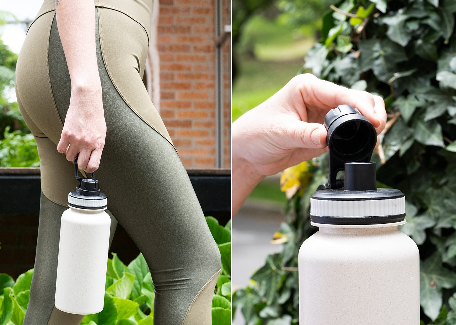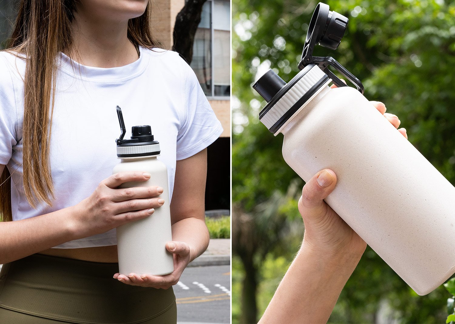 Botella elaborada con paja de trigo, un material sostenible y respetuoso con el medio ambiente. Cuenta con tapa de cierre giratorio y boquilla para facilitar el consumo de líquidos, además de una agarradera integrada que permite un transporte cómodo. Su diseño ecológico y funcional la convierte en una excelente opción para quienes buscan practicidad y compromiso ambiental. Capacidad: 1150 ml / 39 Oz.