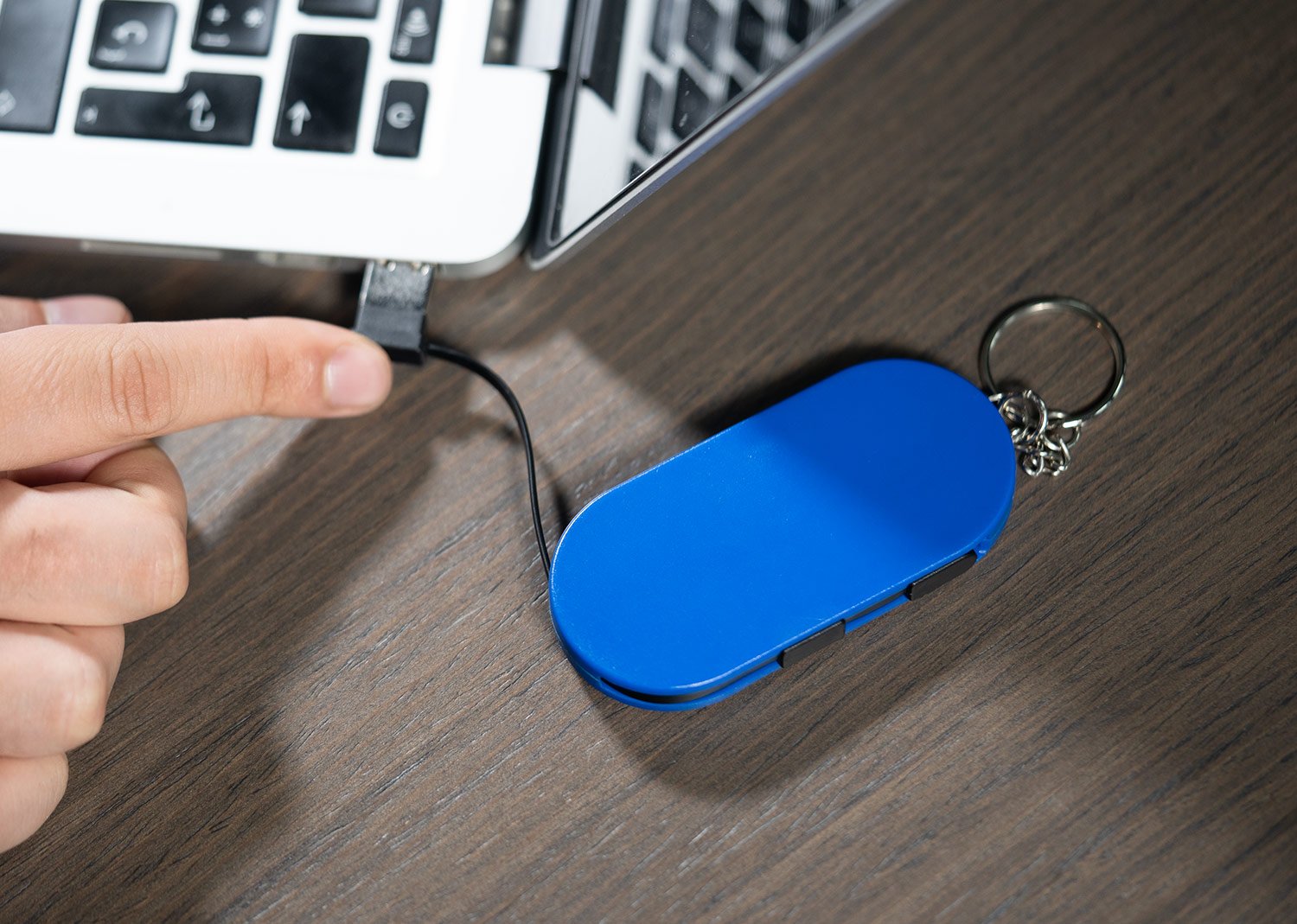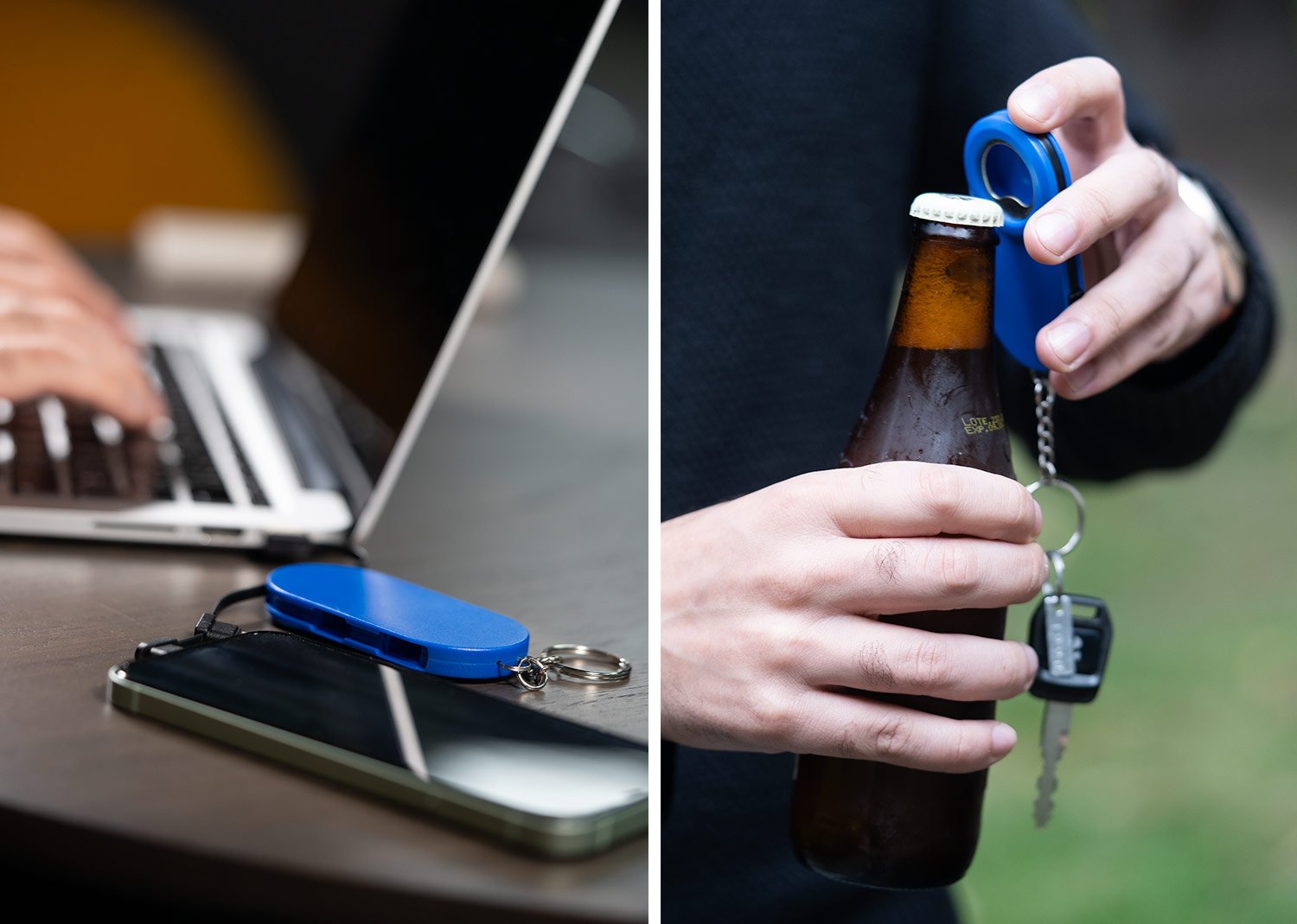 Cables y Adaptadores de CargaCable multifunción con forma ovalada que integra conectores USB, Lightning y Tipo C, además de destapador incorporado. Soporta carga de 5V/2A. Diseño compacto con llavero para fácil transporte.