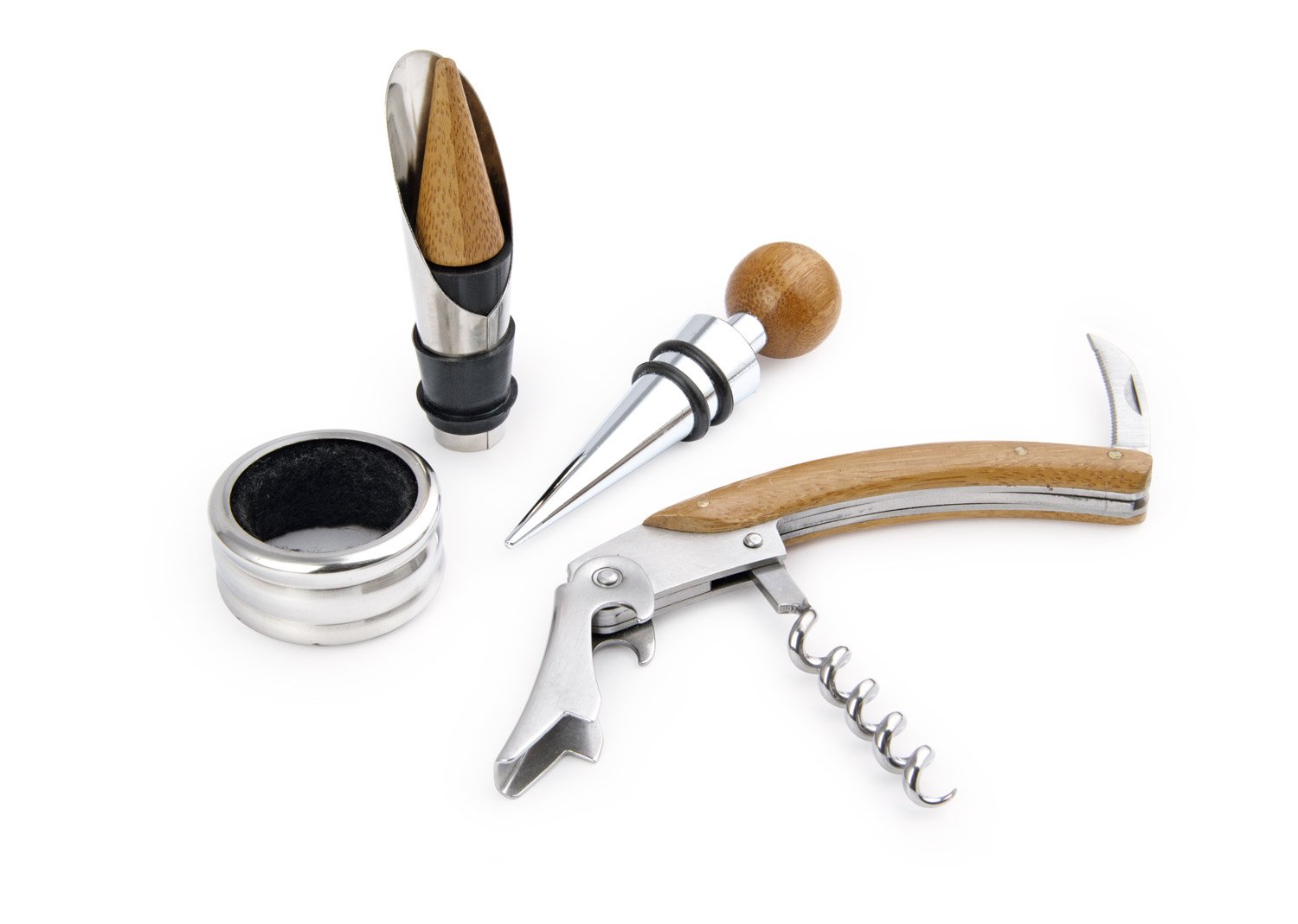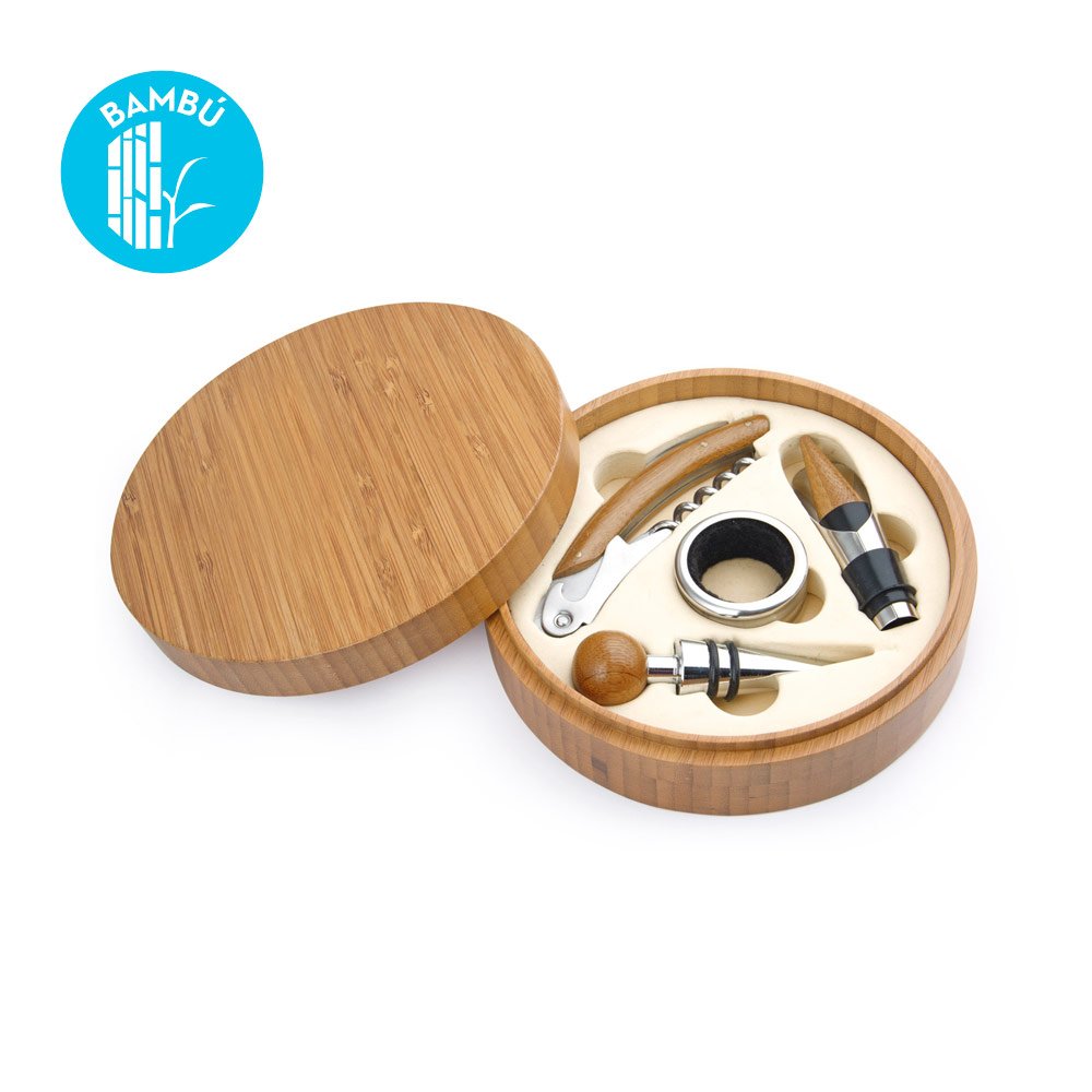 BambúContiene 4 accesorios de bar con aplique en madera: Tapón para botella, cortagotas, aro antigoteo, sacacorchos de 1 tiempo. Caja interior beige.