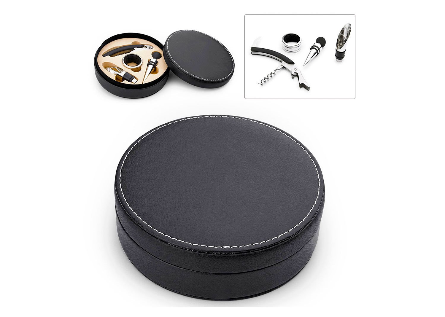 Contiene 4 accesorios de bar: Tapón para botella, cortagotas, aro antigoteo, sacacorchos de 1 tiempo. Caja interior beige.