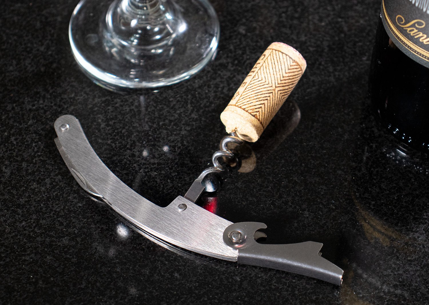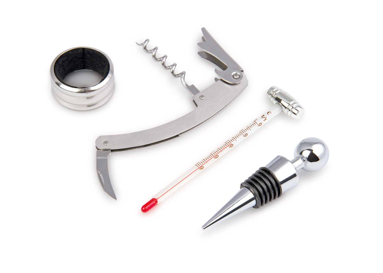 Contiene: Sacacorchos de 1 tiempo, tapón metálico, termómetro, aro antigoteo.