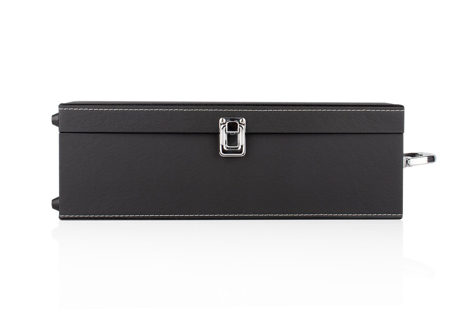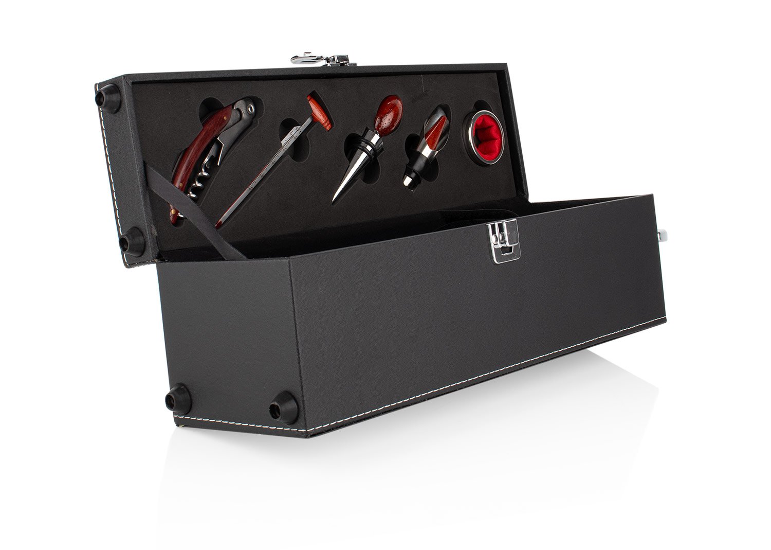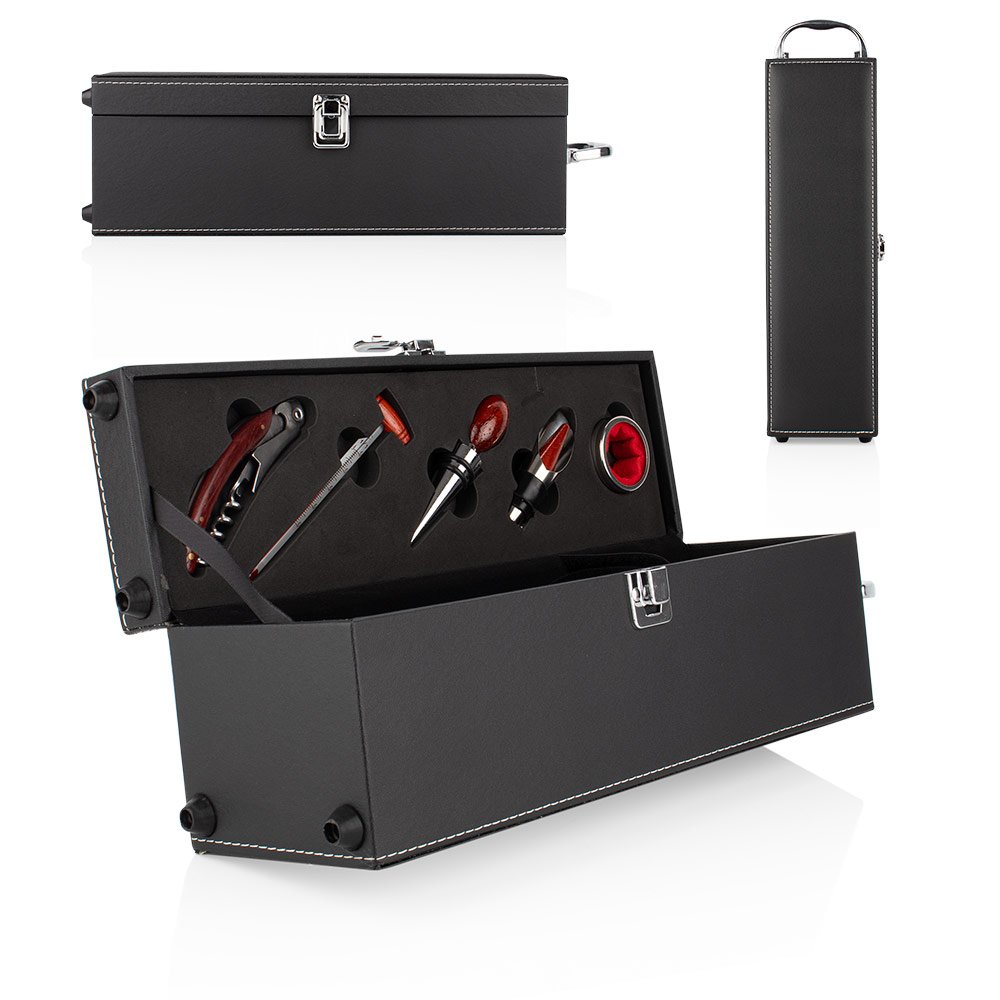 Contiene: Sacacorchos descapsulador de 1 tiempo, cortagotas, tapón metálico, termómetro y aro antigoteo, con apliques en madera. NO INCLUYE LA BOTELLA DE VINO.