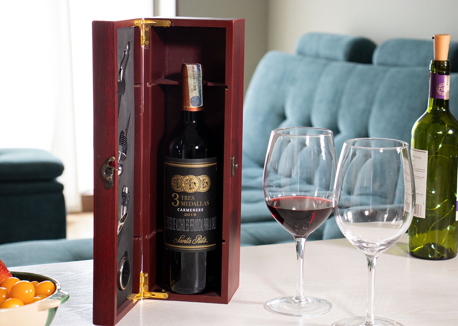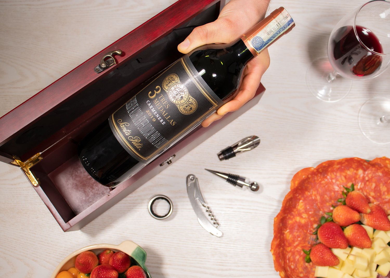 Contiene 4 accesorios de bar: Sacacorchos descapsulador de 1 tiempo, cortagotas, tapón metálico y aro antigoteo. NO INCLUYE LA BOTELLA DE VINO.