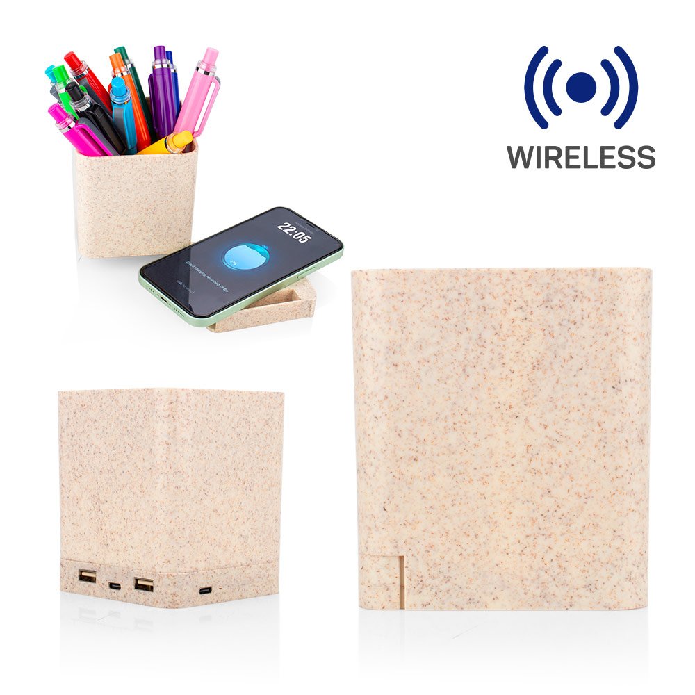 Cables y Adaptadores de CargaCargador inalámbrico de 10 W con concentrador USB 2.0 y dos entradas Tipo C. Diseño multifuncional que permite almacenar artículos en su interior. El cargador inalámbrico se extrae fácilmente deslizando la base hacia la derecha.
