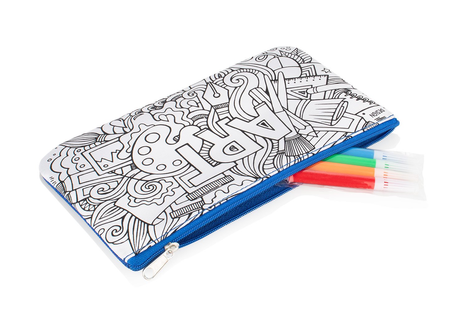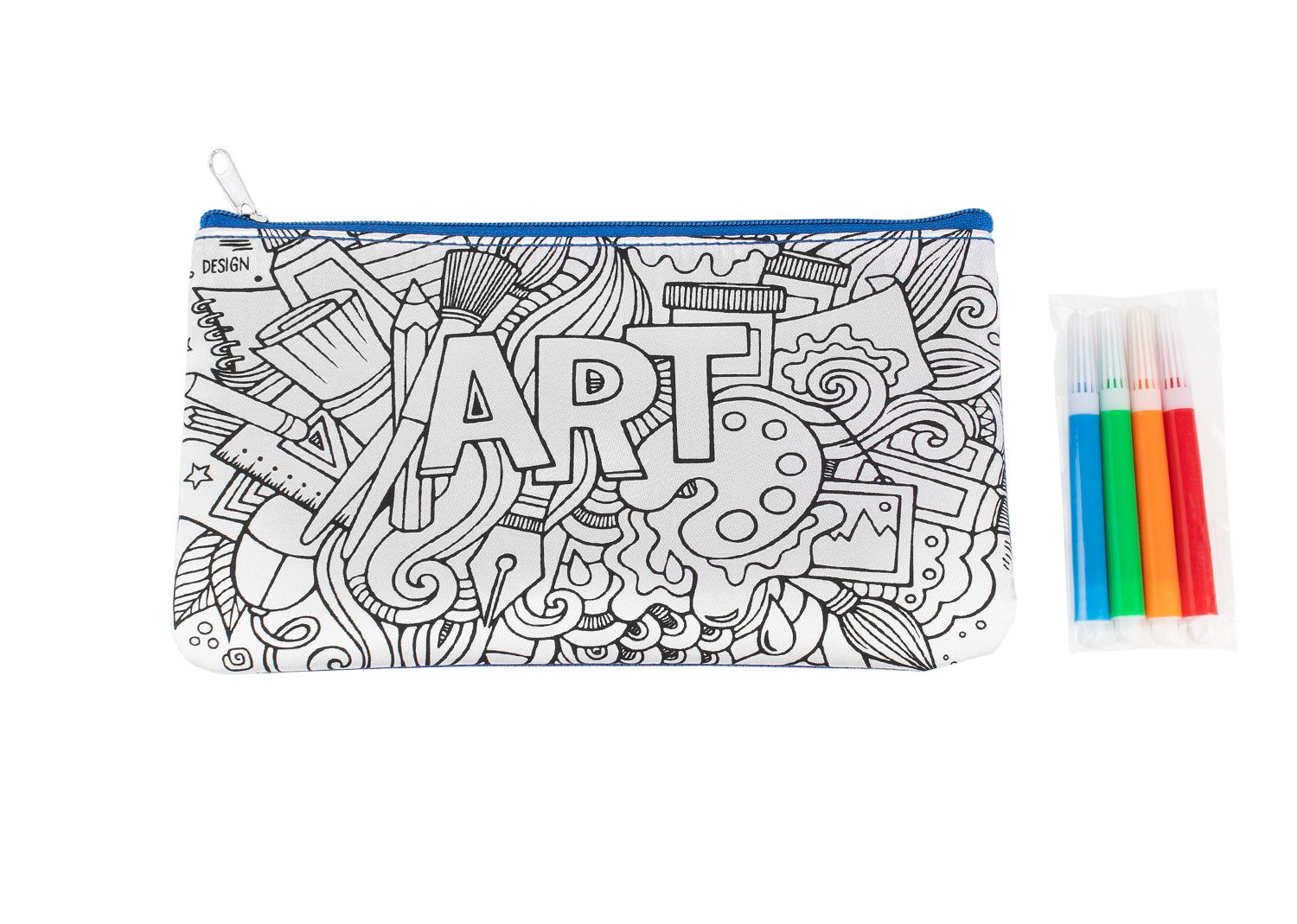 Cartuchera con plantilla impresa en fondo blanco para colorear. Incluye 4 marcadores de tinta lavable: Amarillo, azul, rojo, verde.