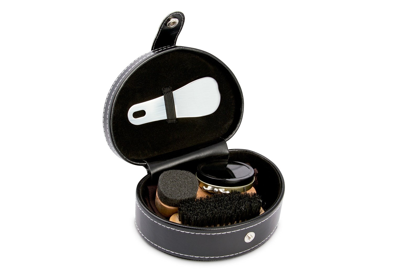 Set de limpieza para zapatos en estuche ejecutivo con broche. Incluye cepillo, espuma, calzador, paño y betún.