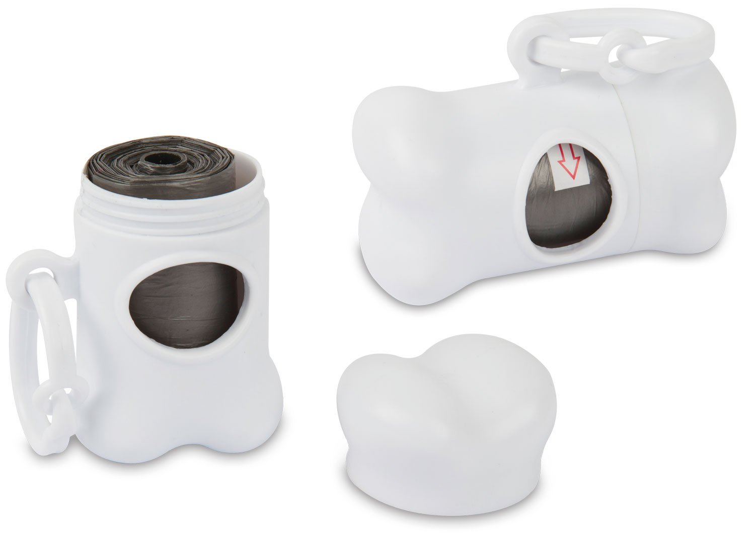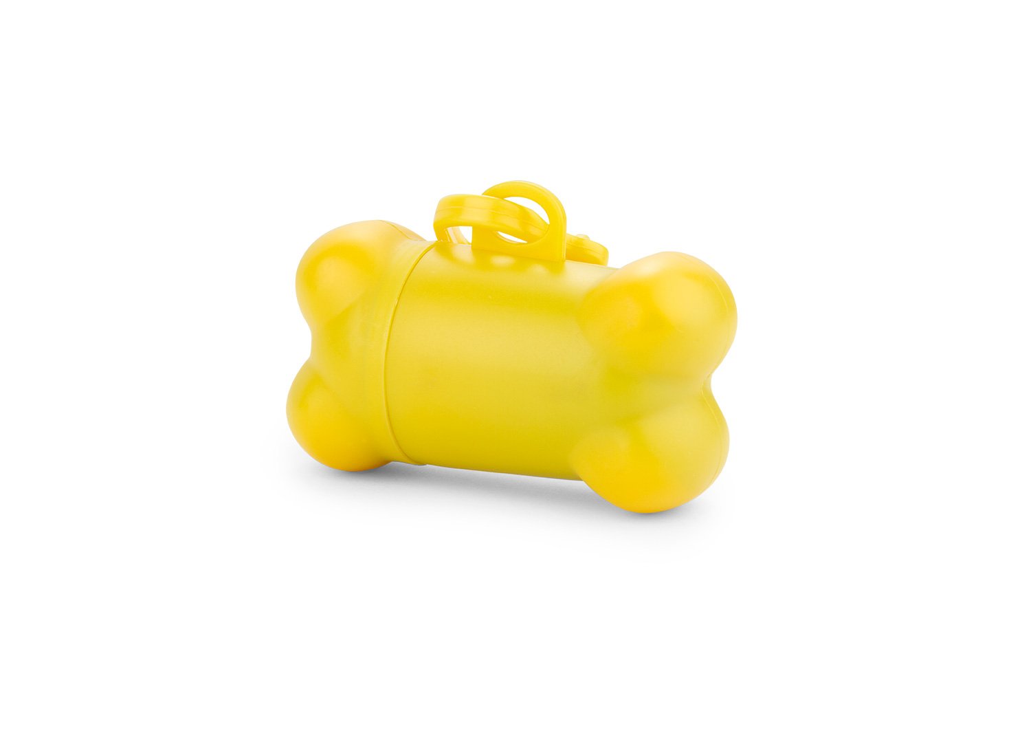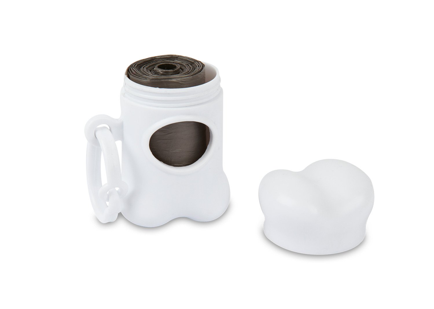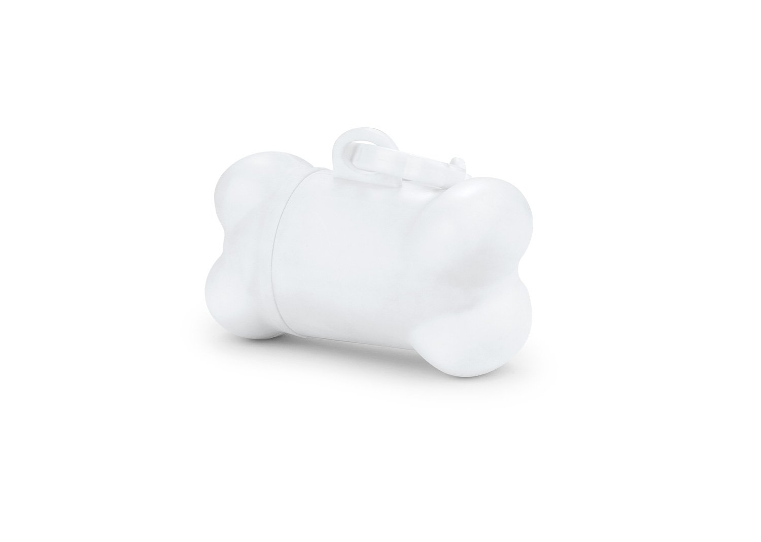 Dispensador de bolsas para mascota con forma de hueso. Con gancho y bolsas incluidas. Espesor por pieza de bolsa: 0.007 milímetros.
