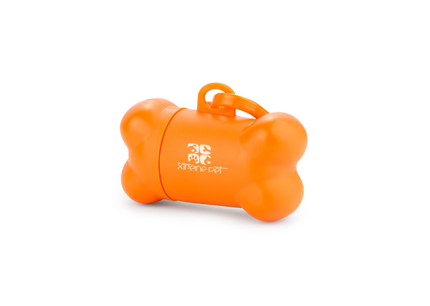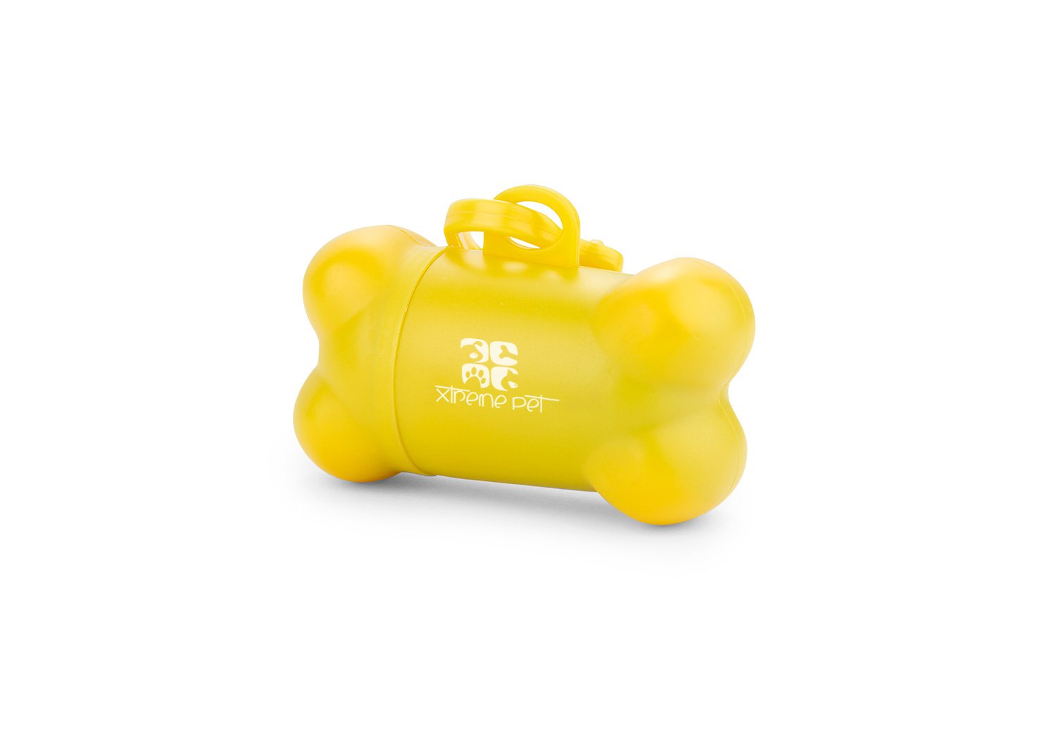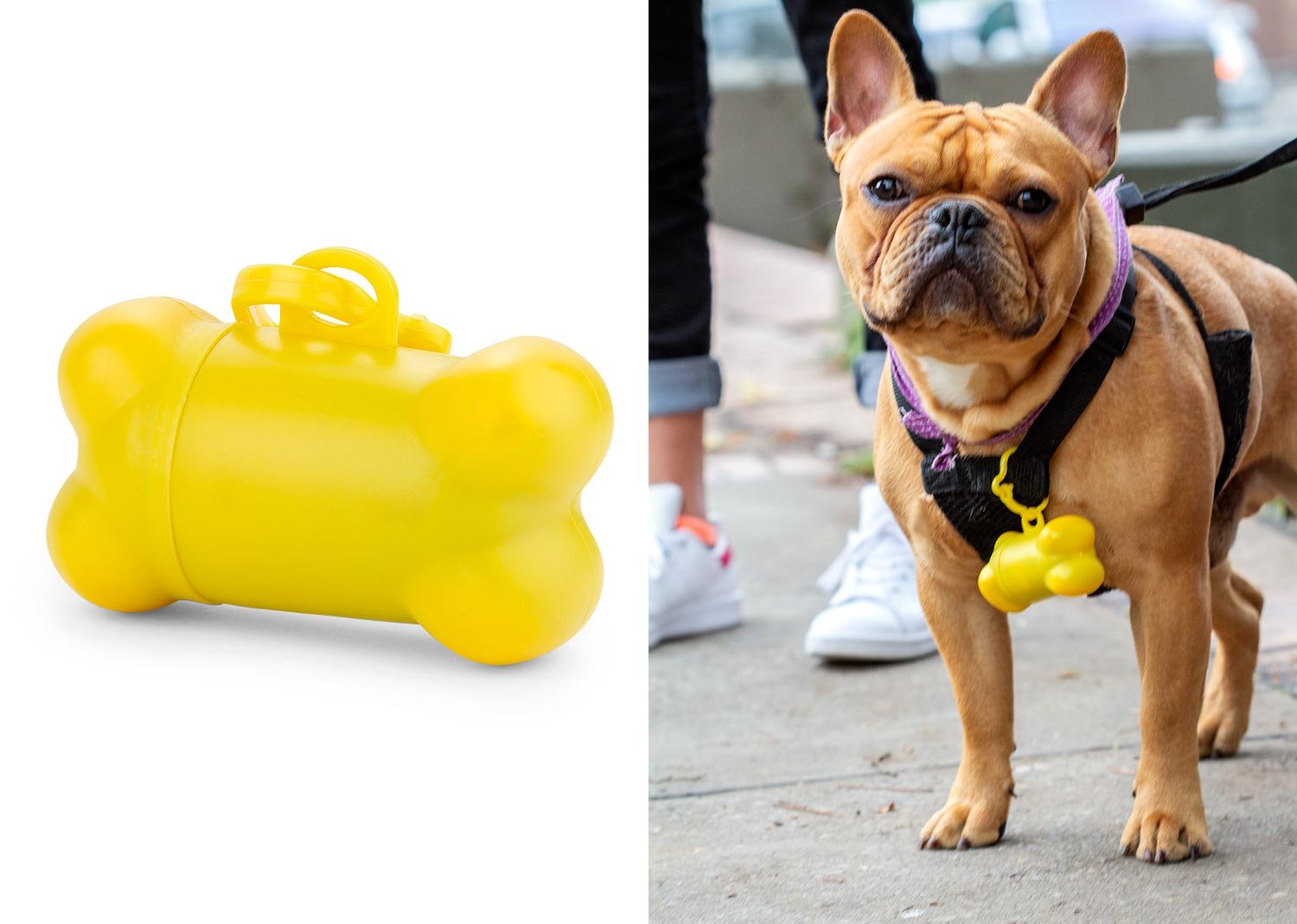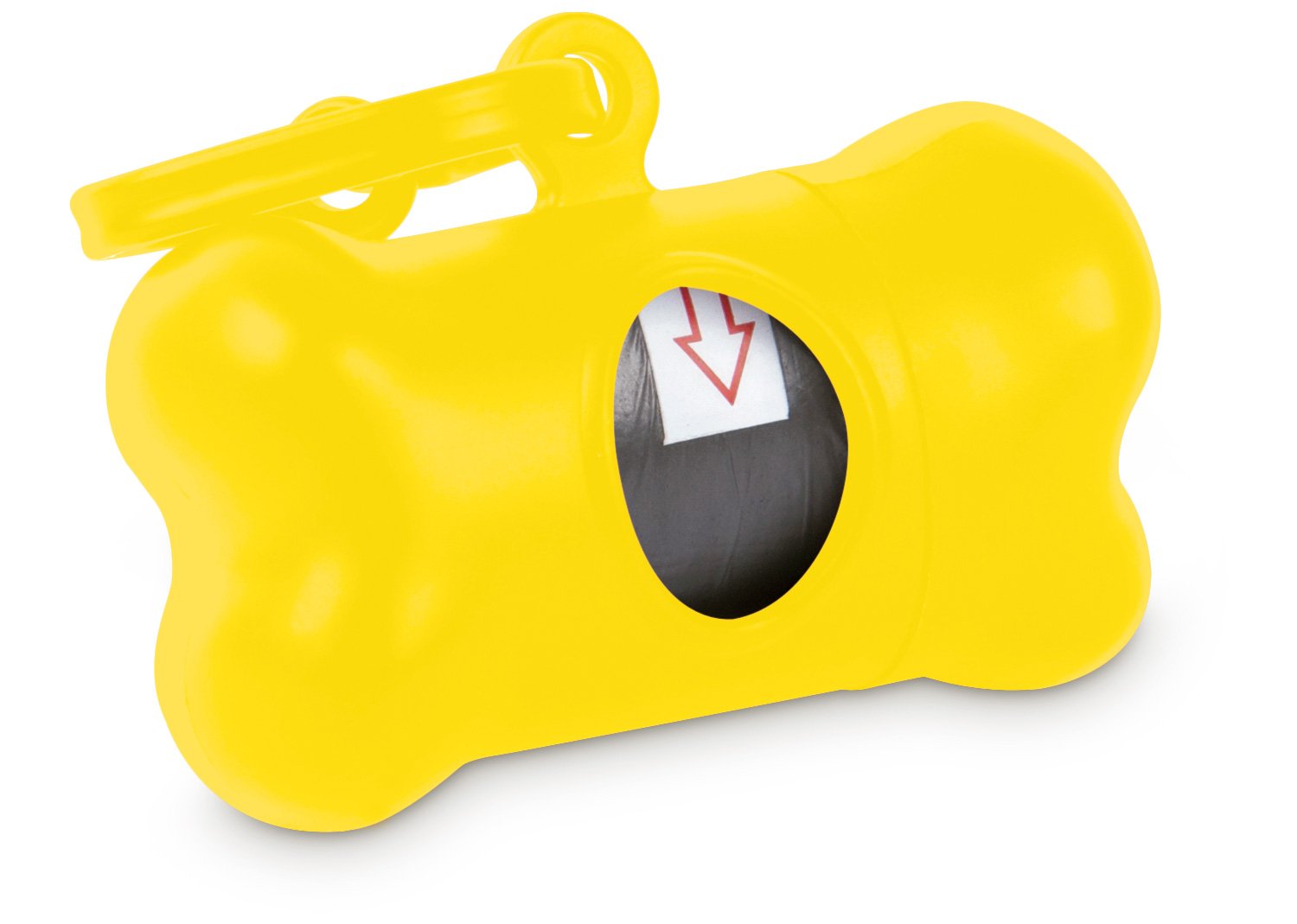 Dispensador de bolsas para mascota con forma de hueso. Con gancho y bolsas incluidas. Espesor por pieza de bolsa: 0.007 milímetros.