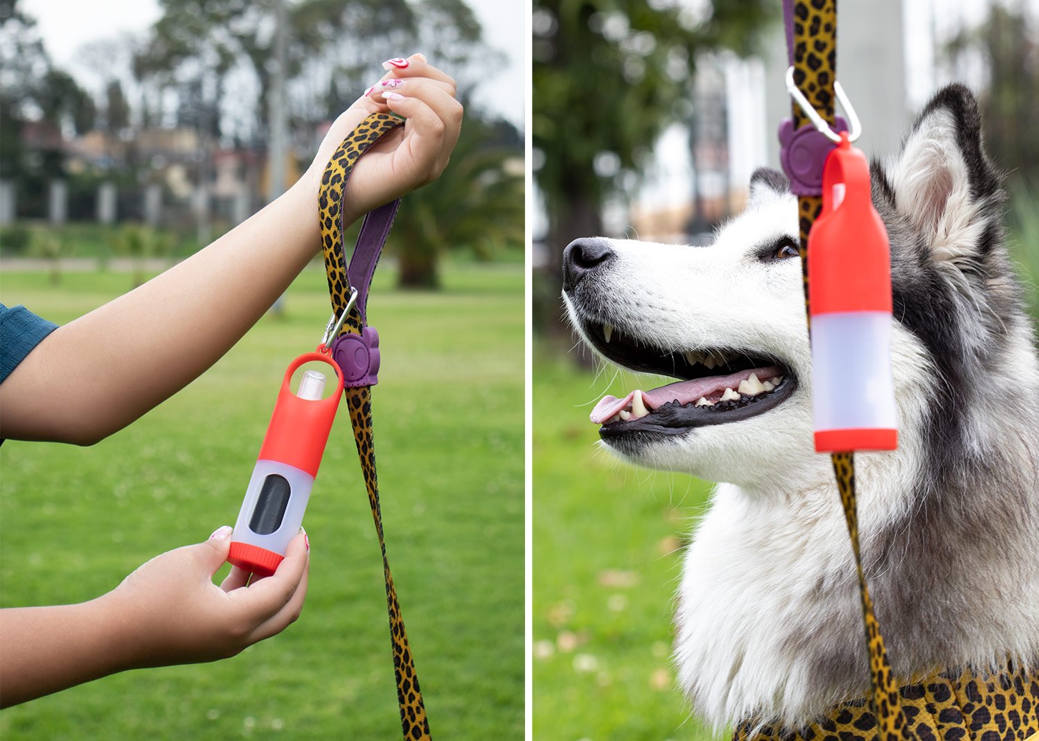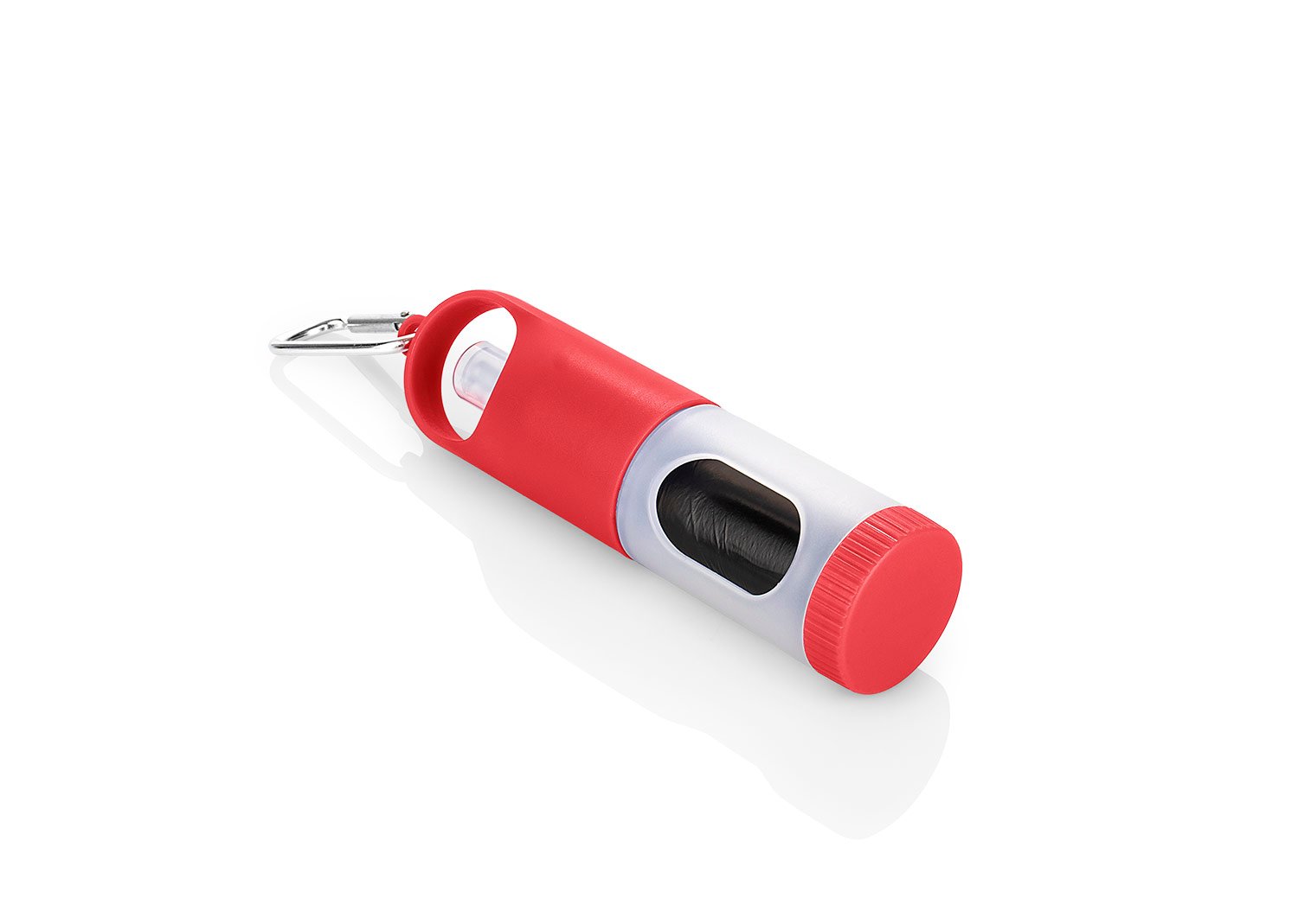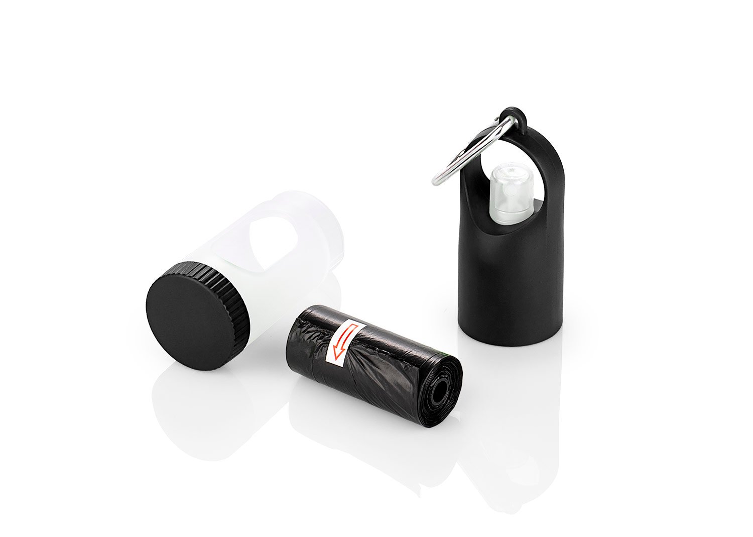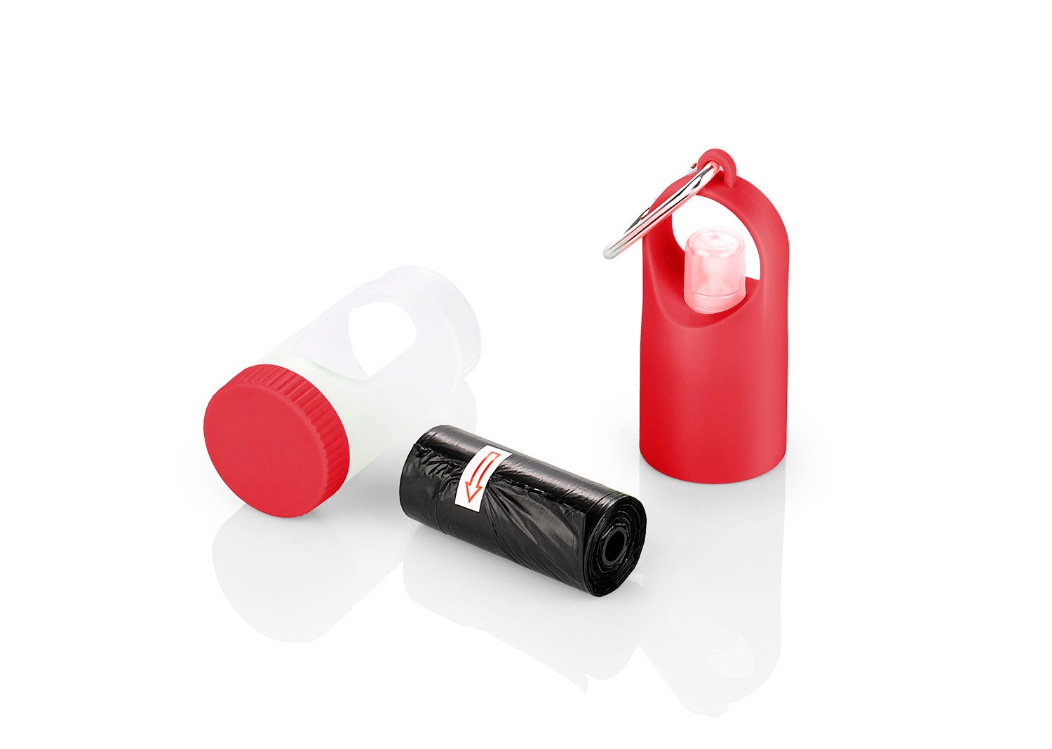 Accesorios de MascotaDispensador de bolsas para mascota. Con gancho carabinero y 15 bolsas incluidas. Frasco para recargar líquidos como gel o alcohol (no incluidos)