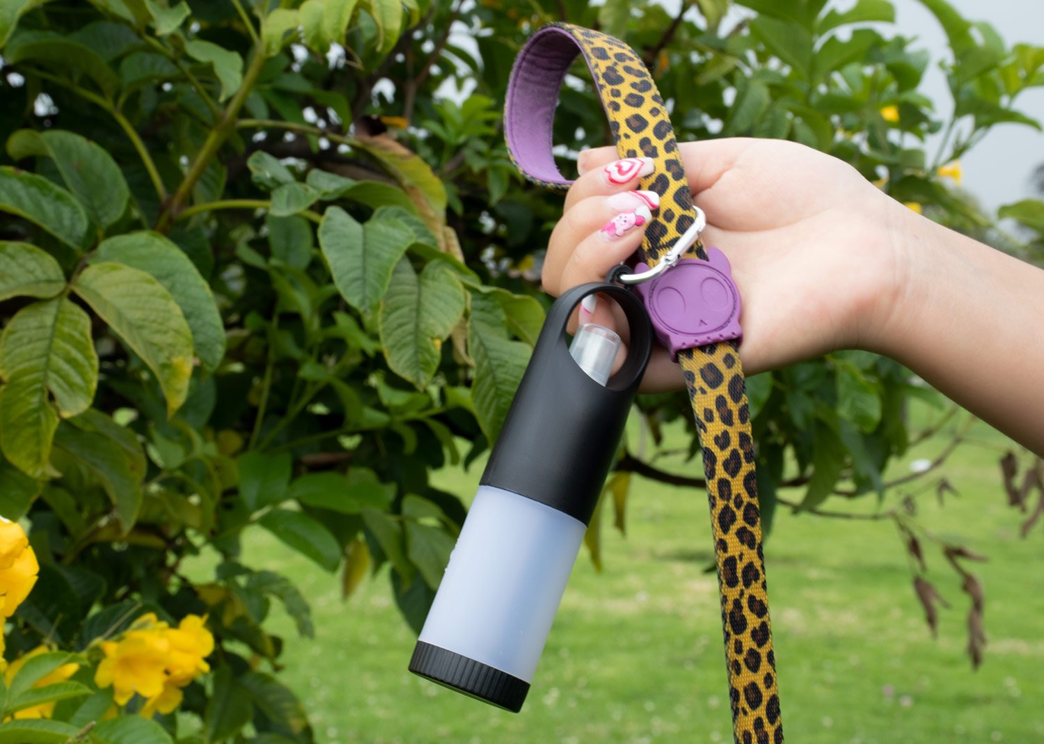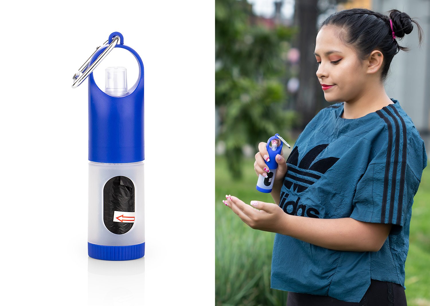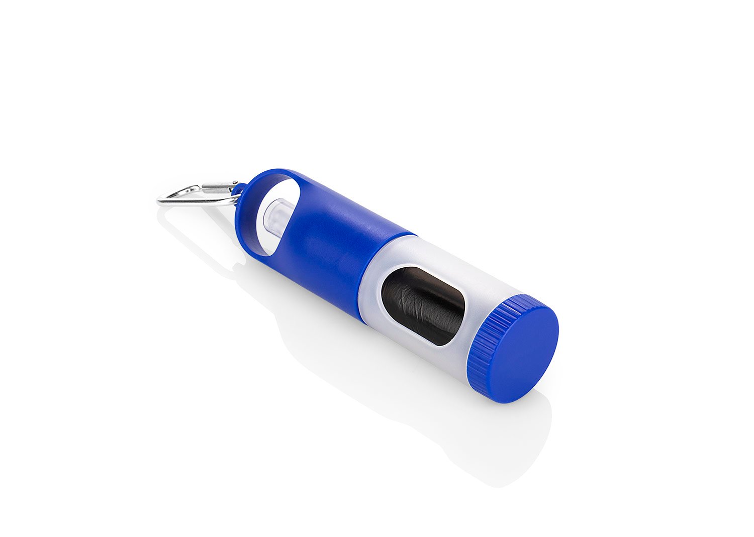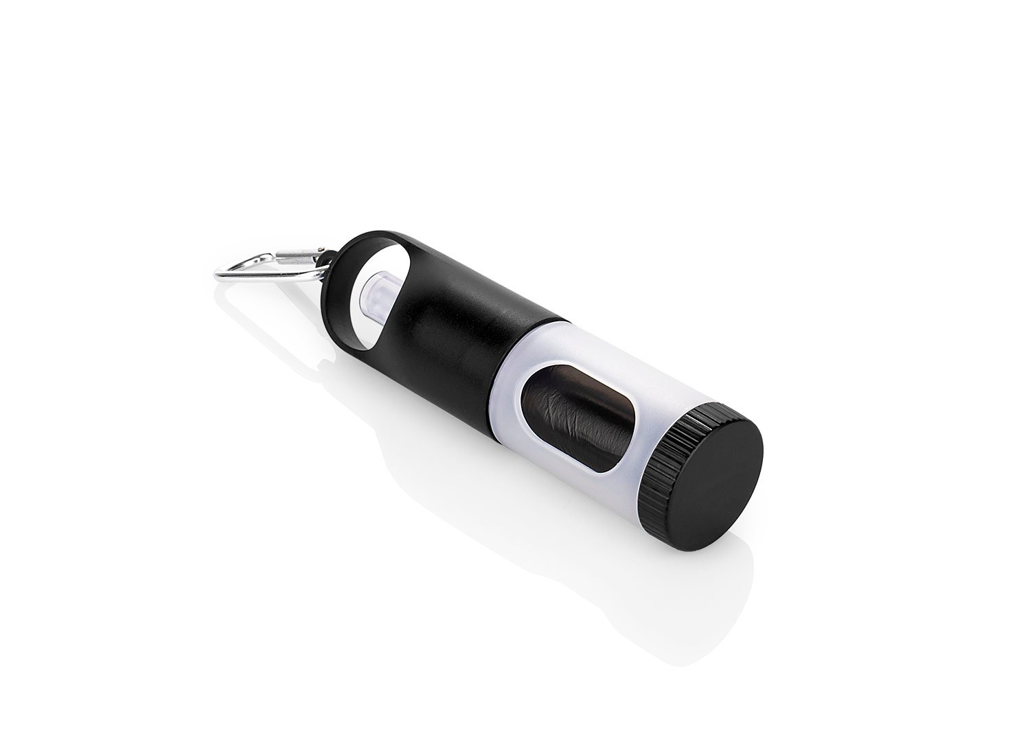 Accesorios de MascotaDispensador de bolsas para mascota. Con gancho carabinero y 15 bolsas incluidas. Frasco para recargar líquidos como gel o alcohol (no incluidos)