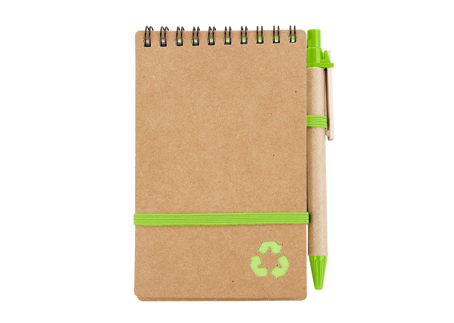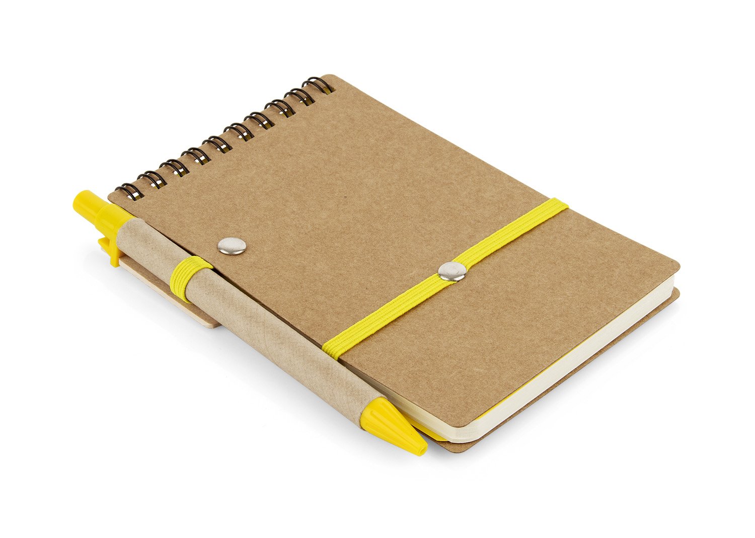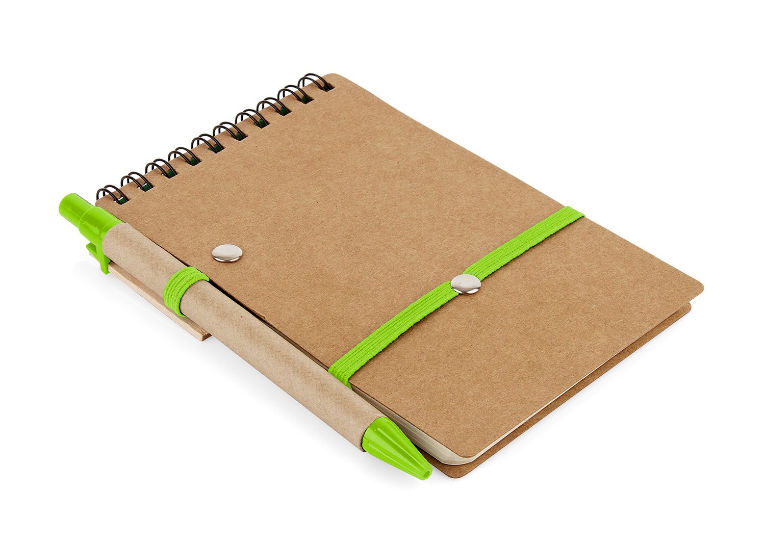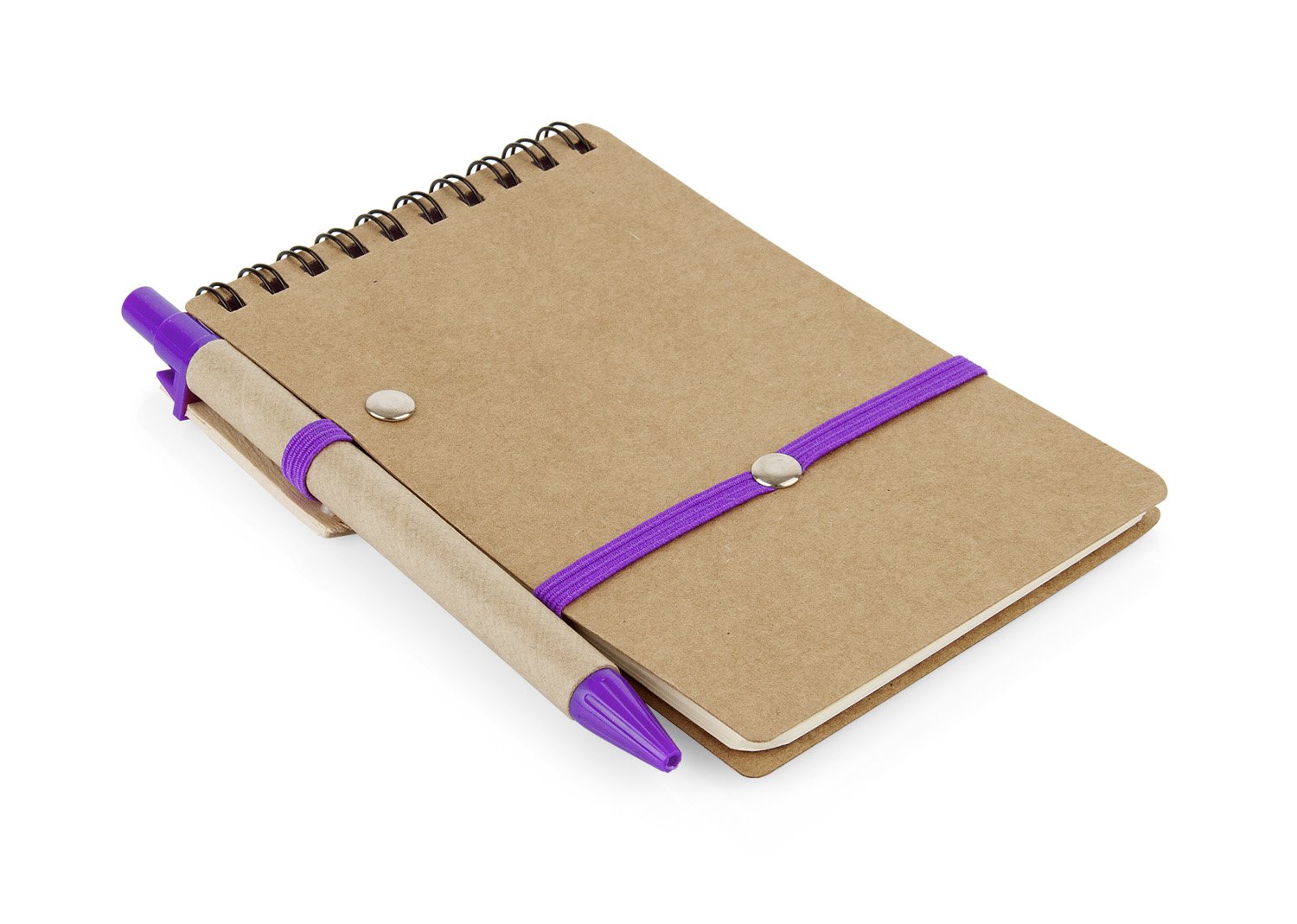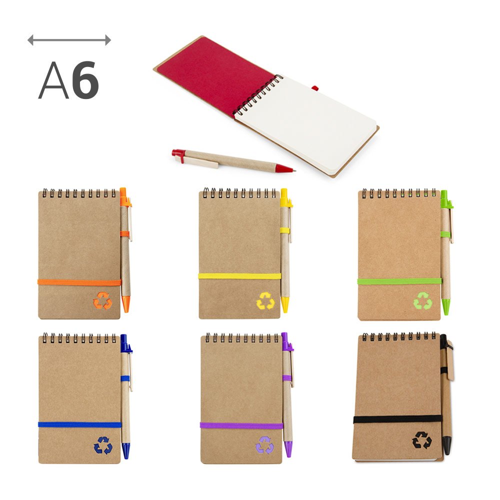 Libretas EcológicasLibreta ecológica de 68 hojas en papel blanco, argollado “doble O”. Con elástico sujetador y porta bolígrafo. Incluye bolígrafo de color similar. Tamaño aproximado: A6.