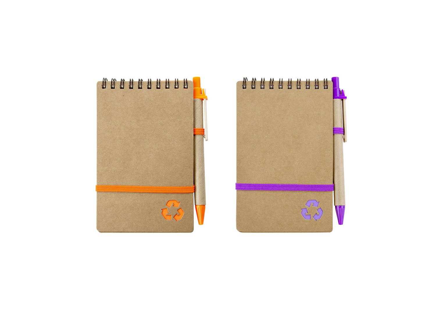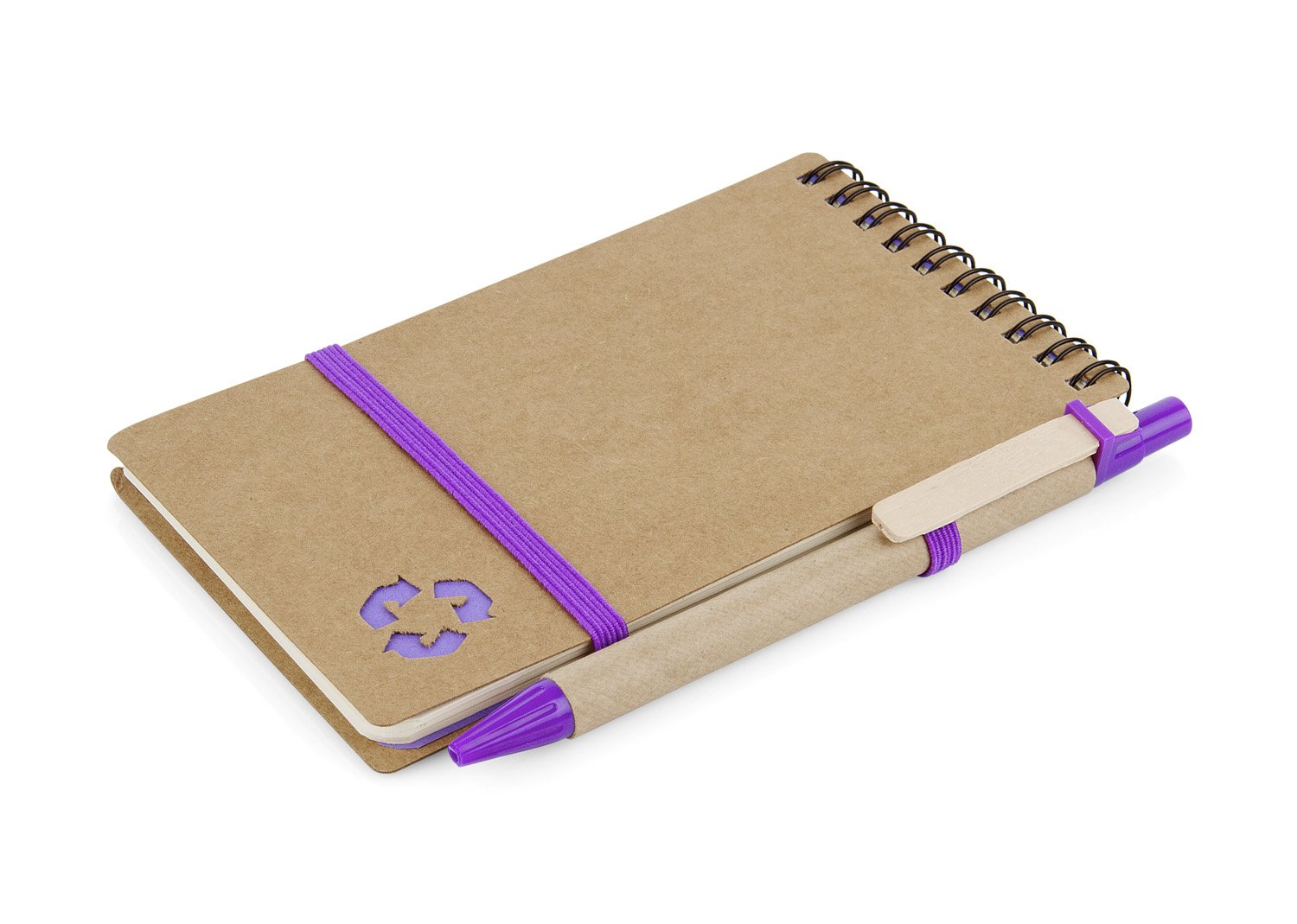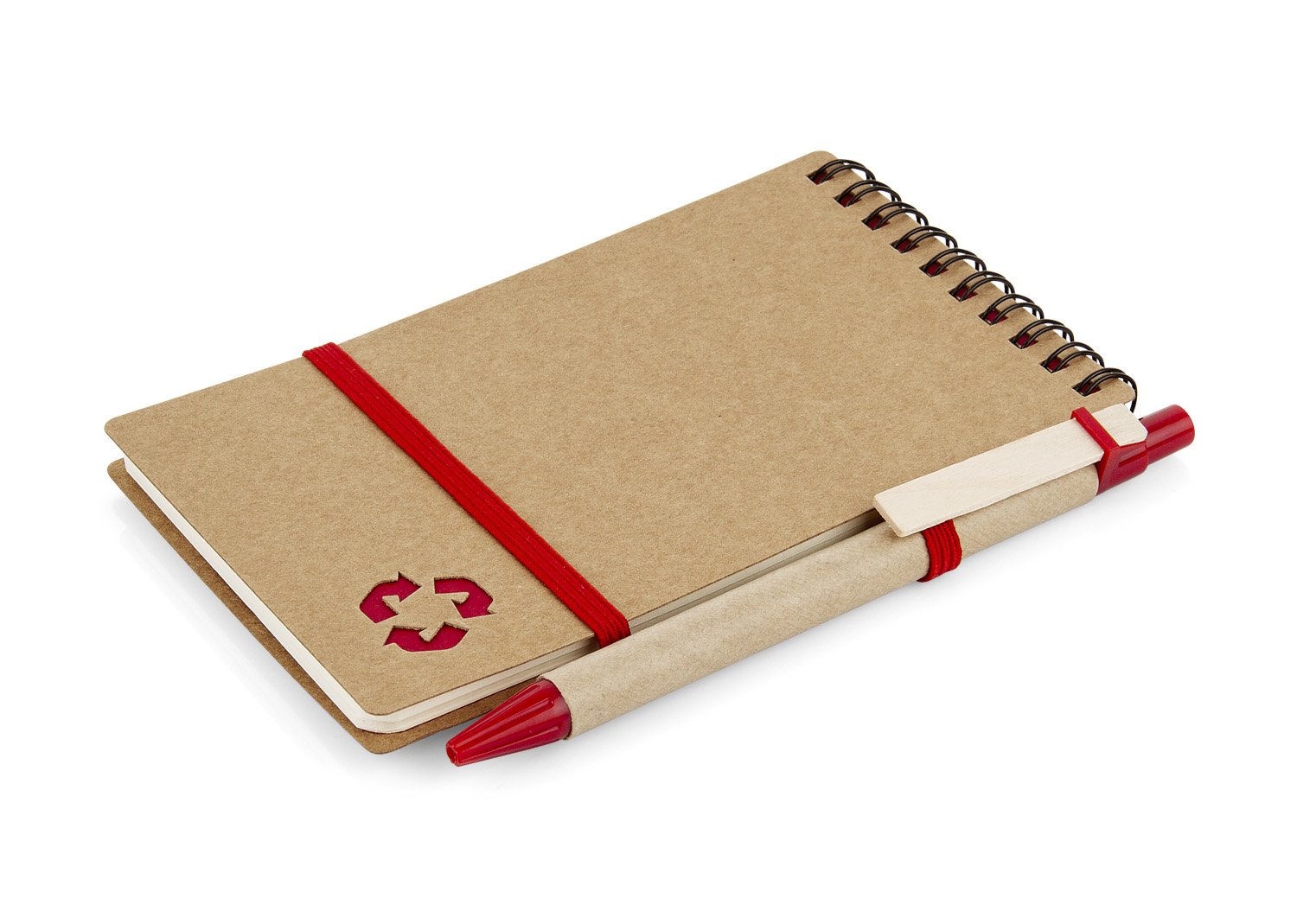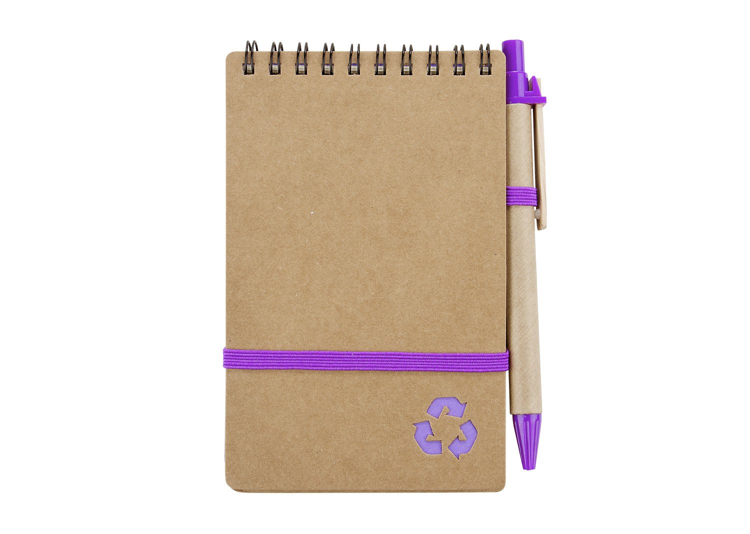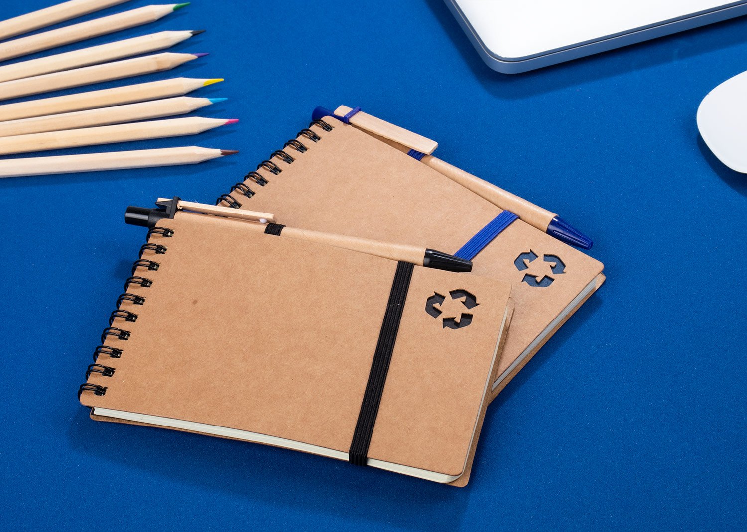 Libretas EcológicasLibreta ecológica de 68 hojas en papel blanco, argollado “doble O”. Con elástico sujetador y porta bolígrafo. Incluye bolígrafo de color similar. Tamaño aproximado: A6.
