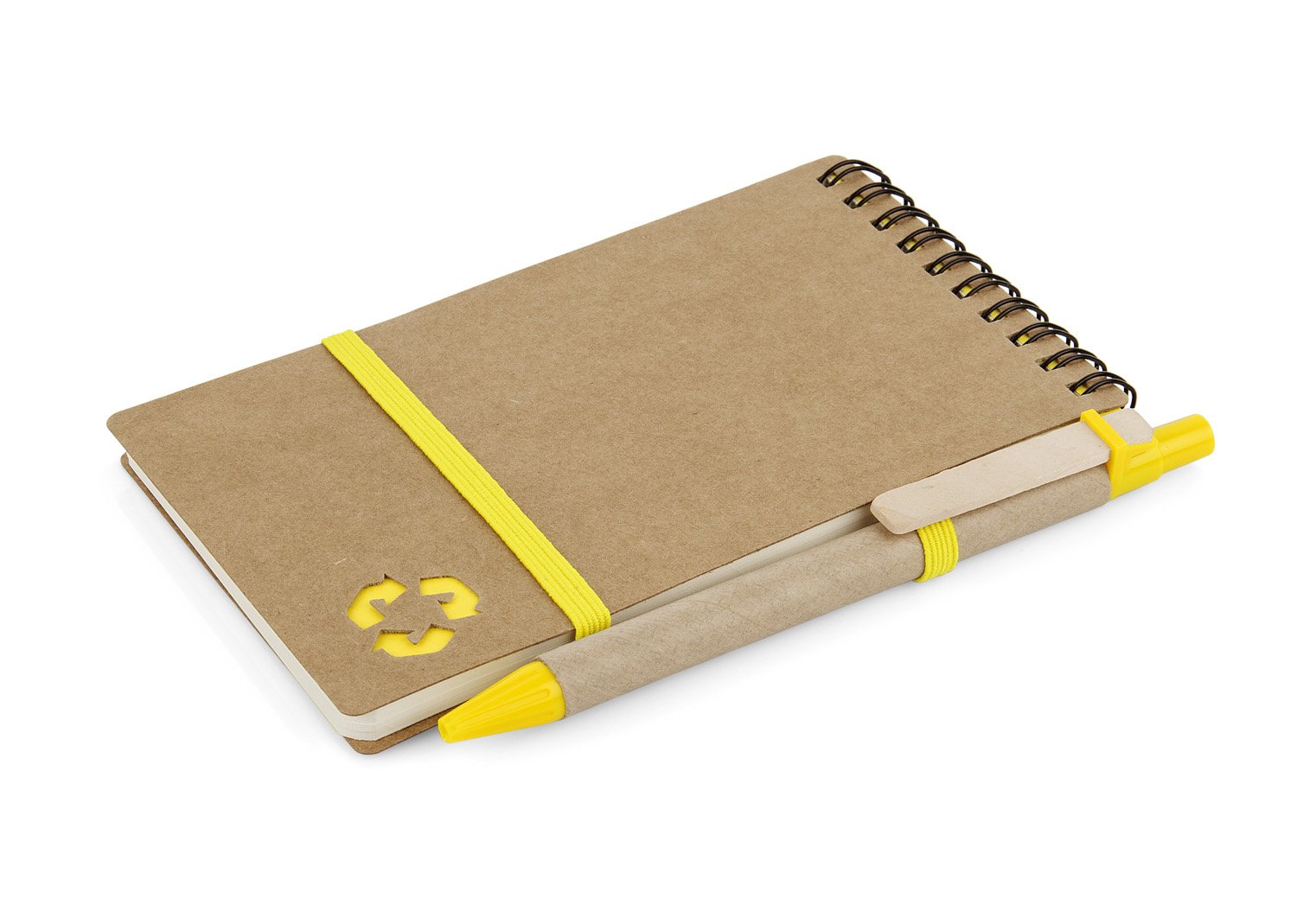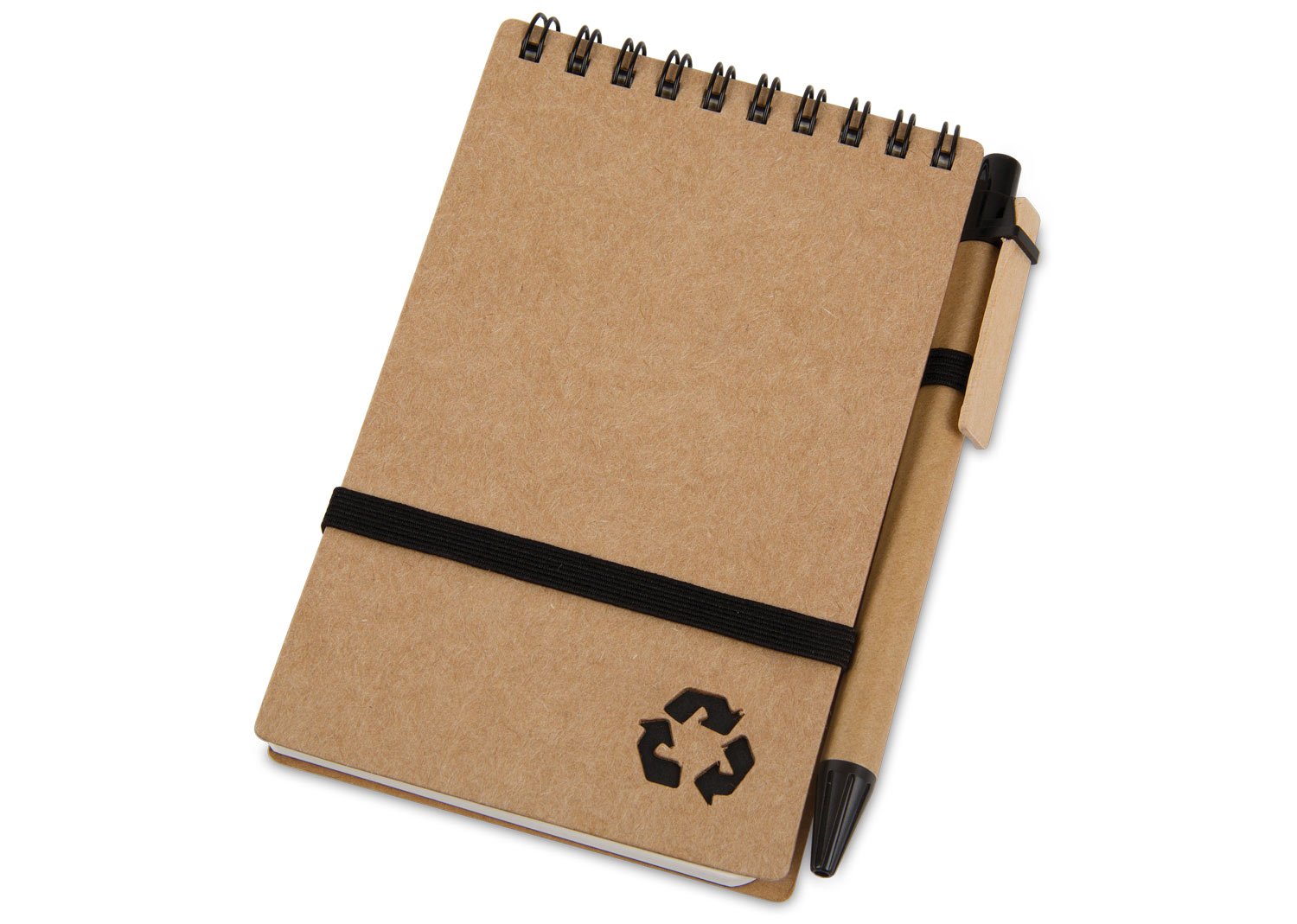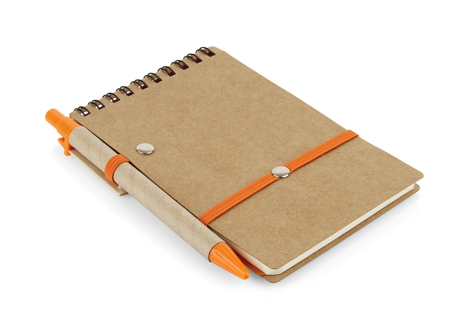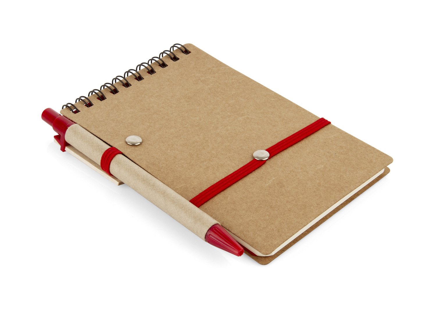 Libretas EcológicasLibreta ecológica de 68 hojas en papel blanco, argollado “doble O”. Con elástico sujetador y porta bolígrafo. Incluye bolígrafo de color similar. Tamaño aproximado: A6.