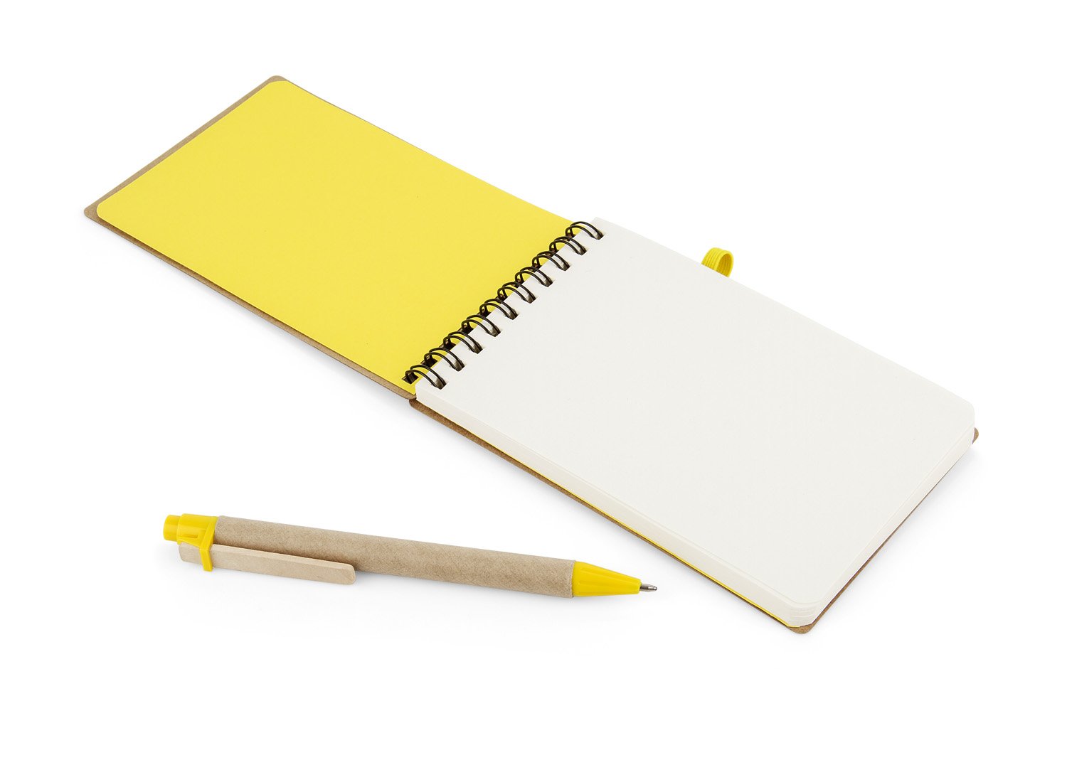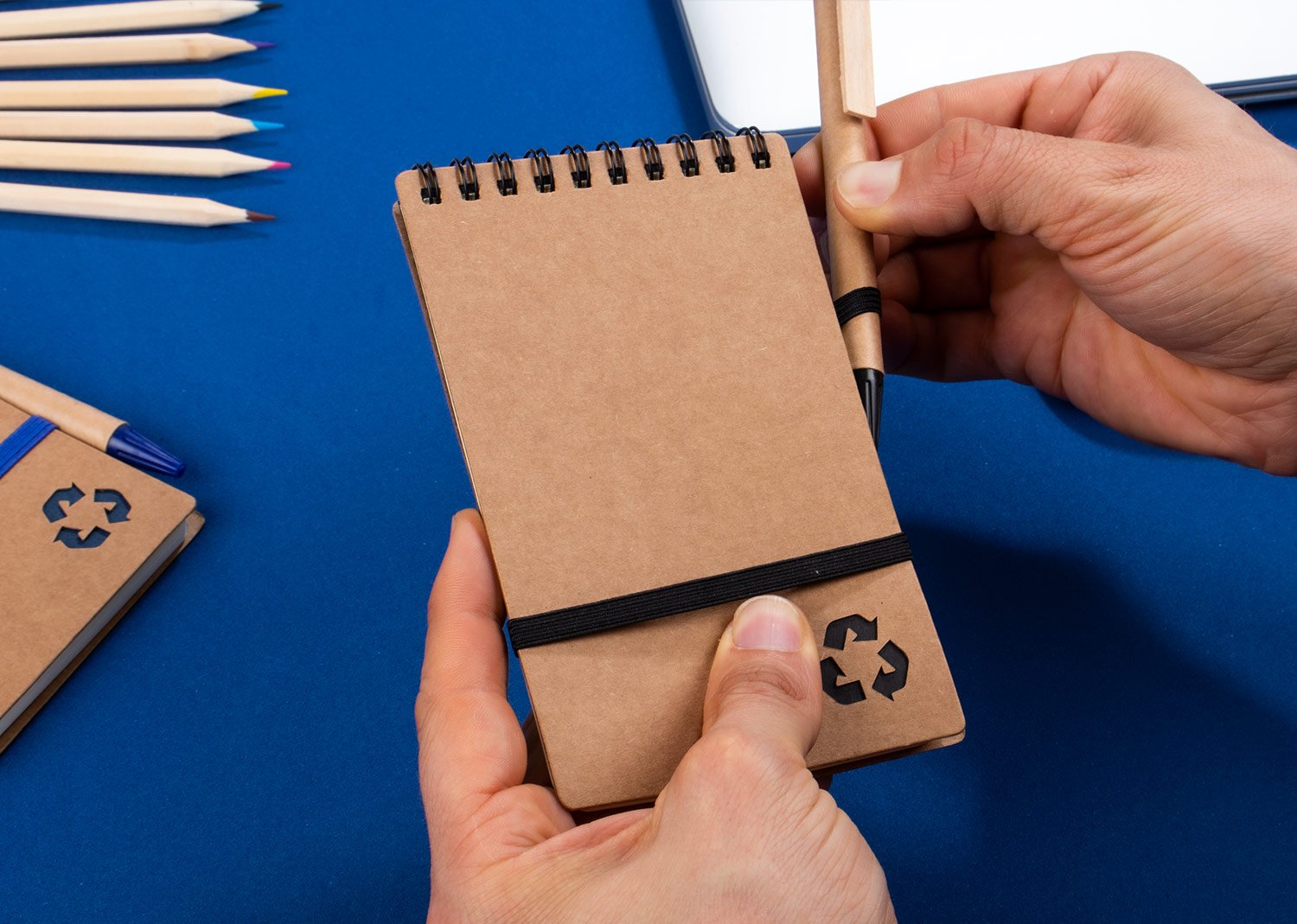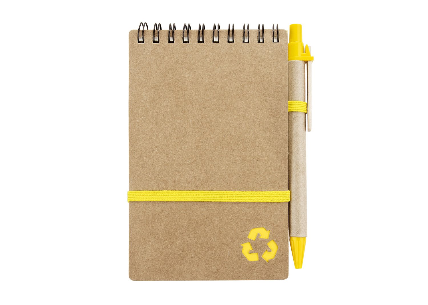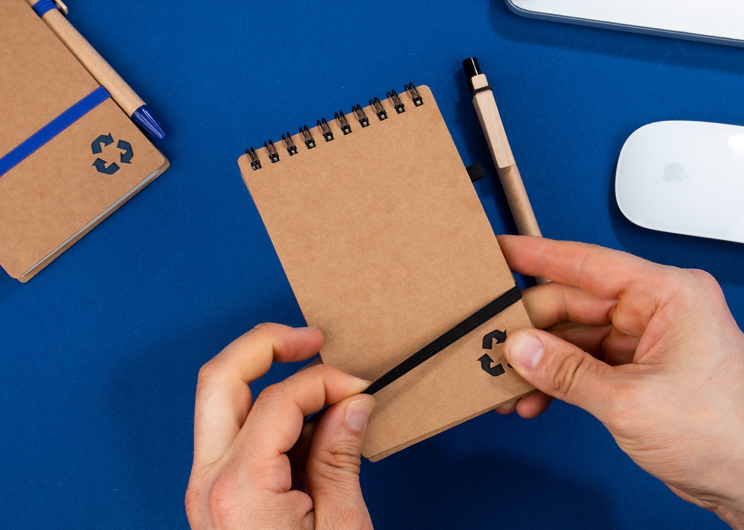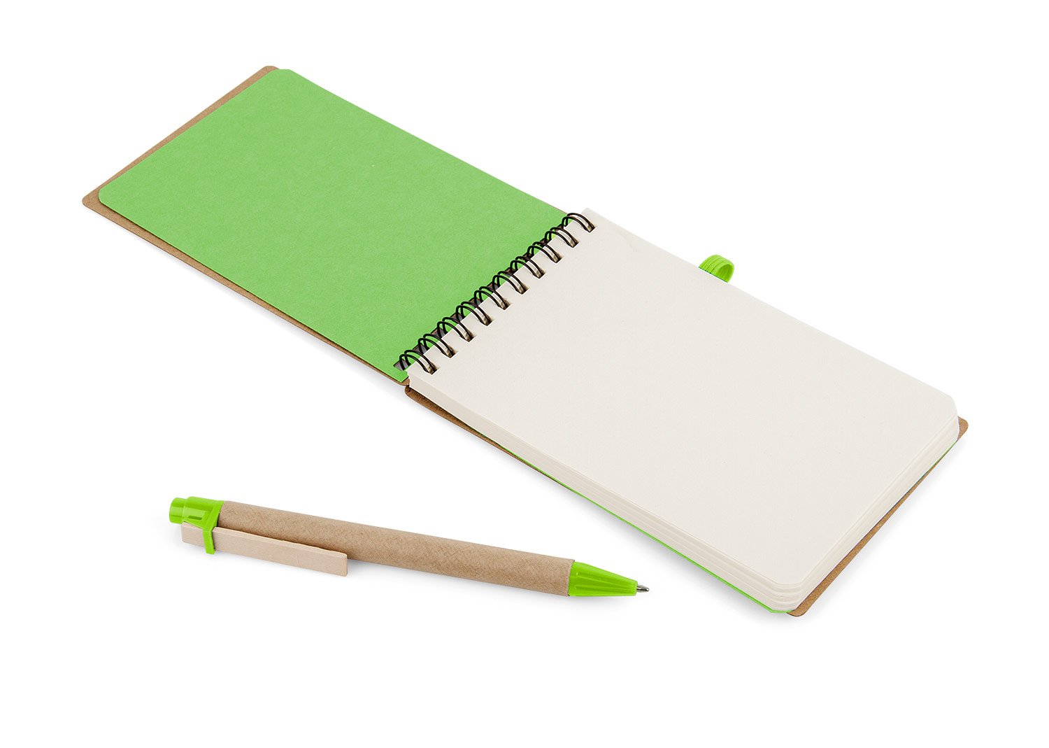 Libretas EcológicasLibreta ecológica de 68 hojas en papel blanco, argollado “doble O”. Con elástico sujetador y porta bolígrafo. Incluye bolígrafo de color similar. Tamaño aproximado: A6.