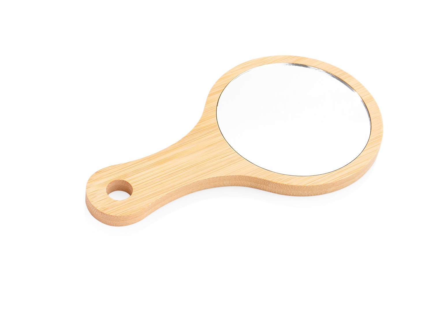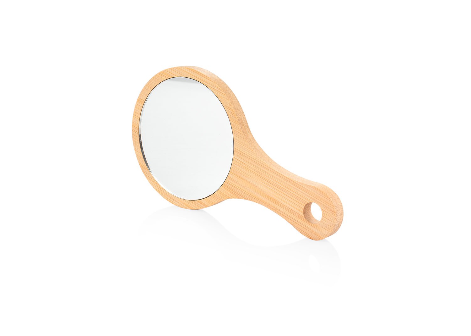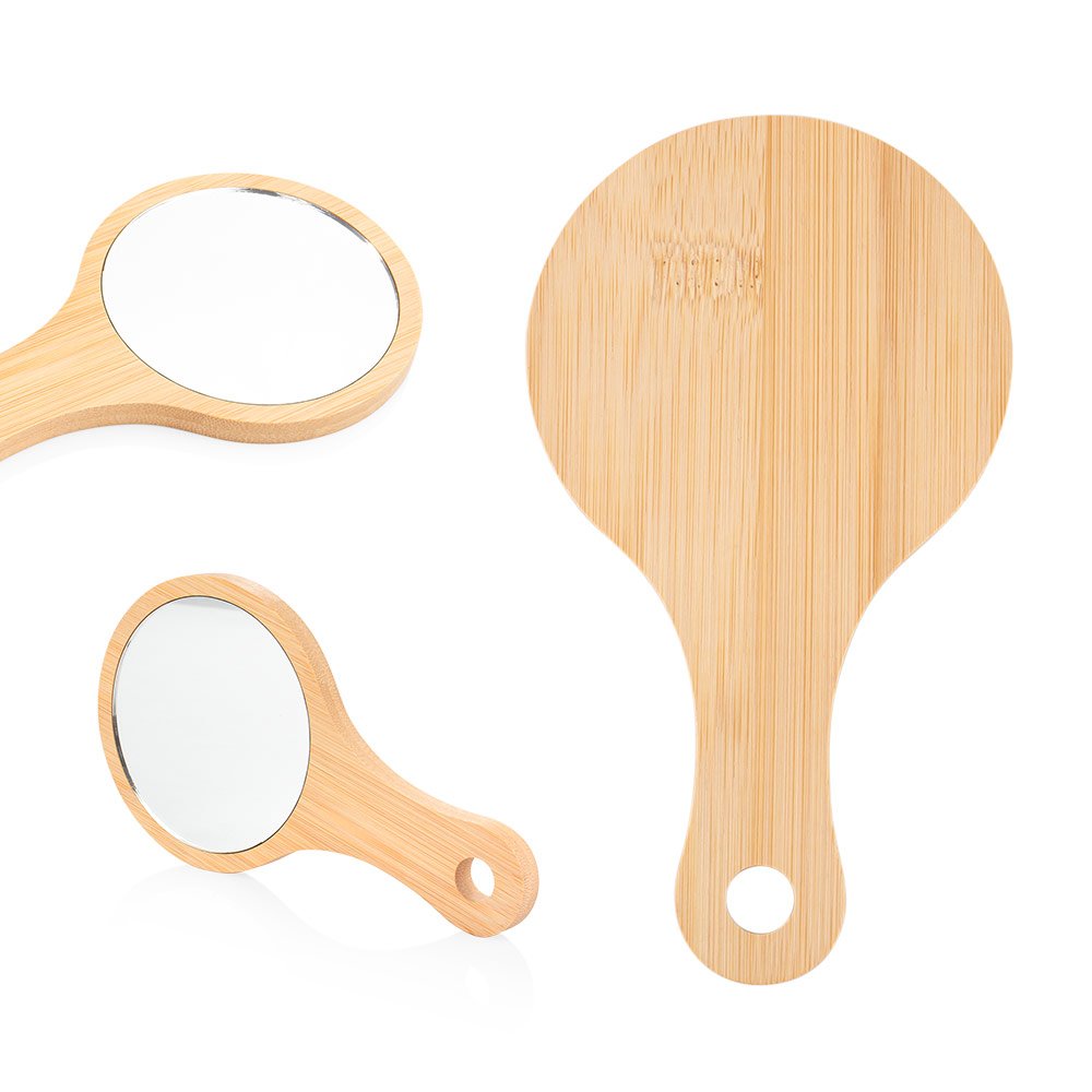Fabricado en madera de bambú, este espejo de forma redonda incluye un práctico mango para sujetarlo fácilmente y un orificio inferior que permite colgarlo cuando no está en uso.