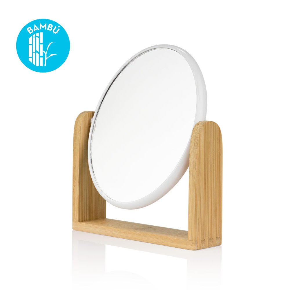Espejo de tocador de doble cara, uno de ellos con aumento de 2X, puede girar sobre su eje hasta 360 grados. Base de madera.