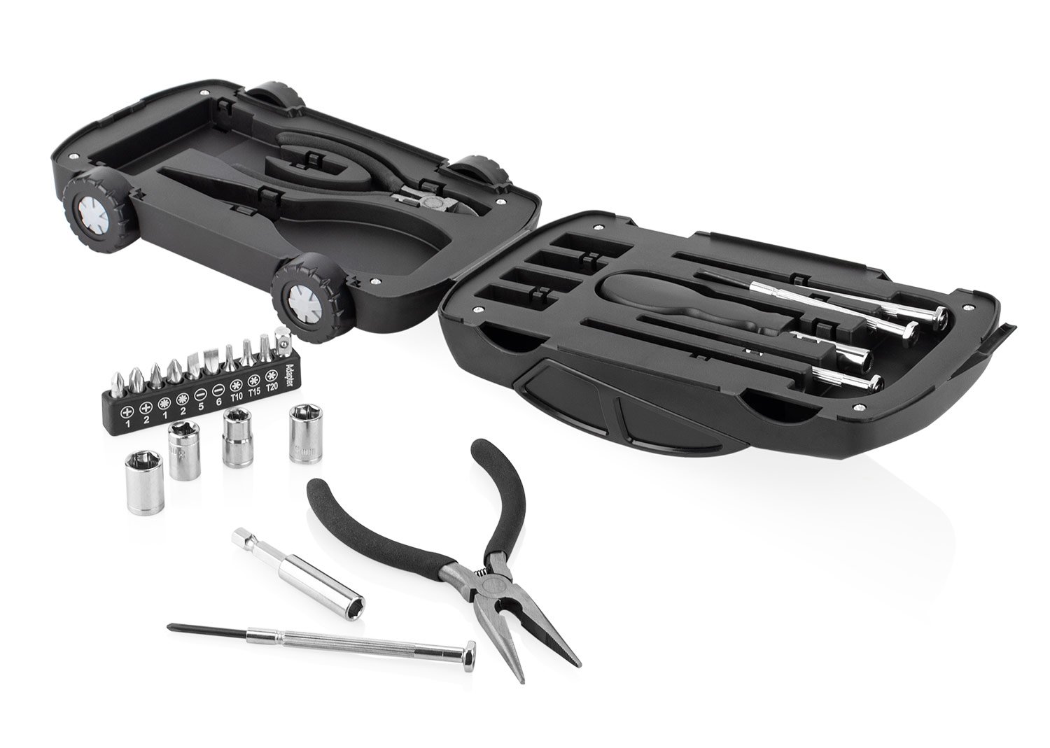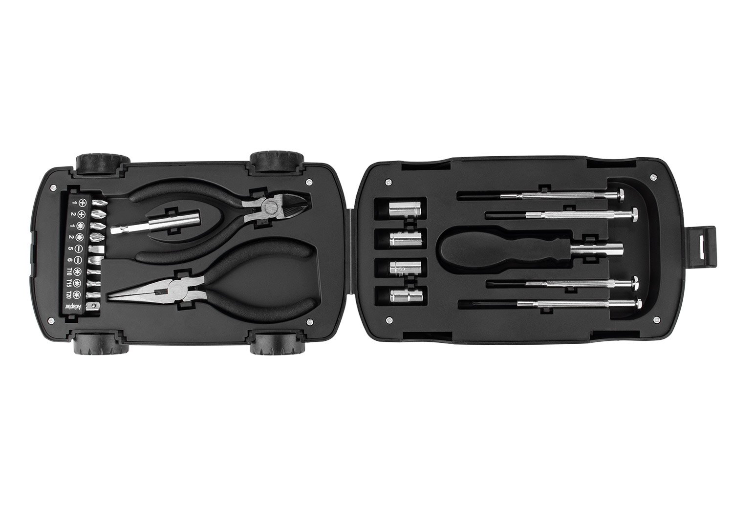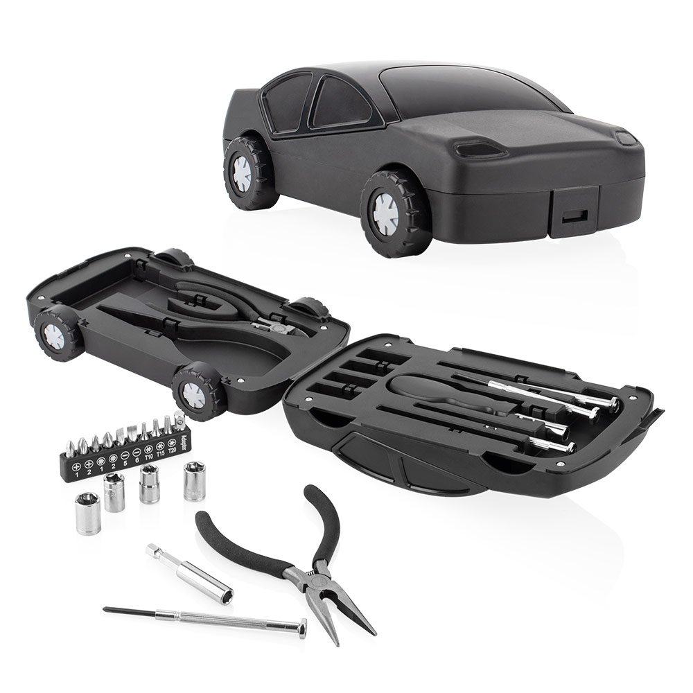 HerramienterosEste juego de herramientas viene en un estuche compacto con forma de automóvil, que incluye 4 piezas de precisión, un mango de destornillador (2,5 X 11,5), 4 copas (7 -10 mm), alicates en 2 piezas (punta y corte), un mango de junta (5,8 X Ø 0,6) y 10 puntas de destornillador. Su diseño práctico y organizado permite tener a la mano los elementos básicos para tareas de ajuste y reparación.