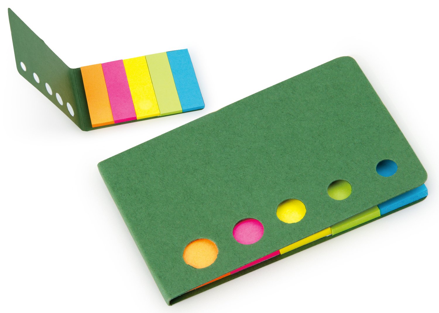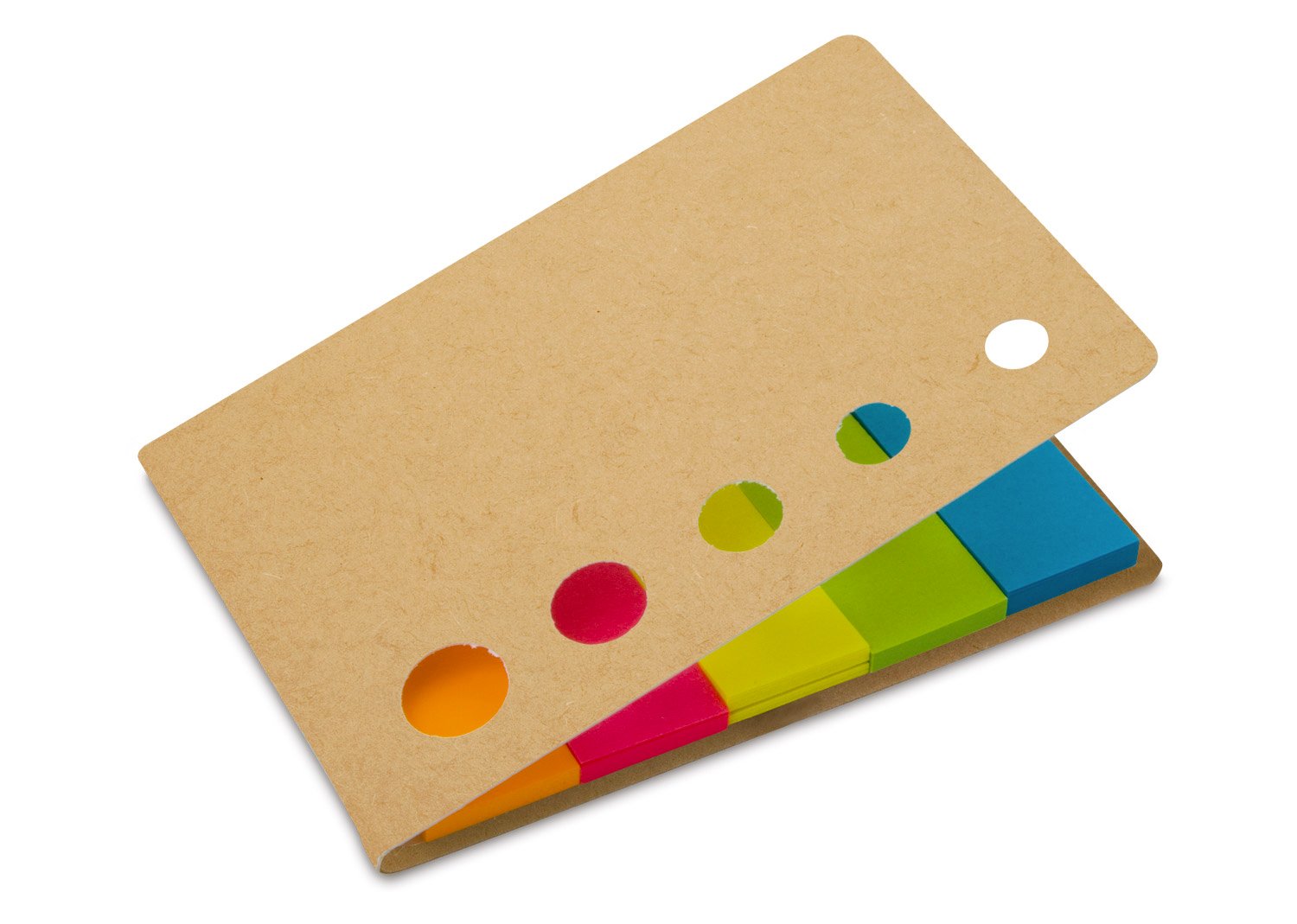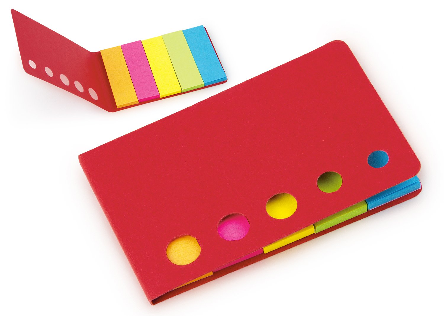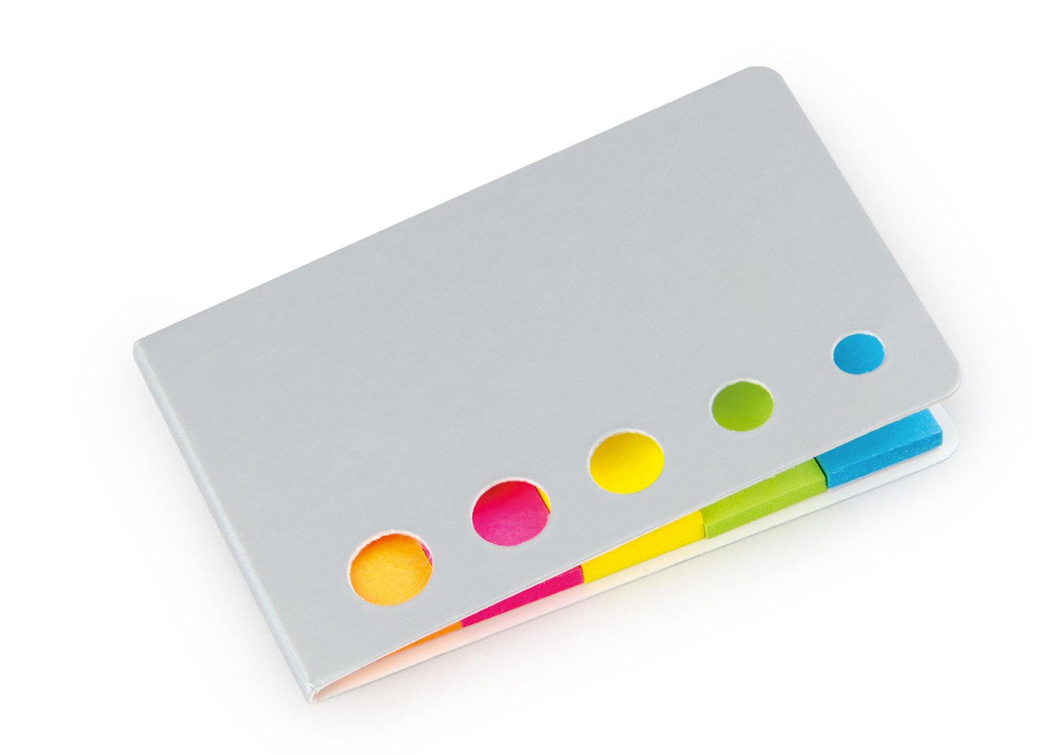 Banderas de papel adhesivas en 5 colores con 25 hojas cada una y tapa de cartón. Con troqueles circulares al frente.