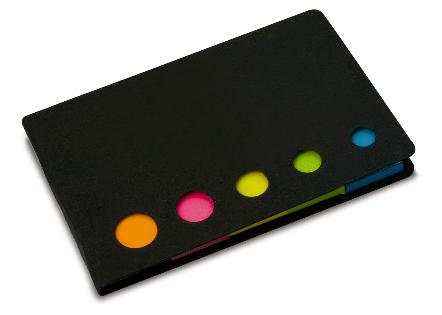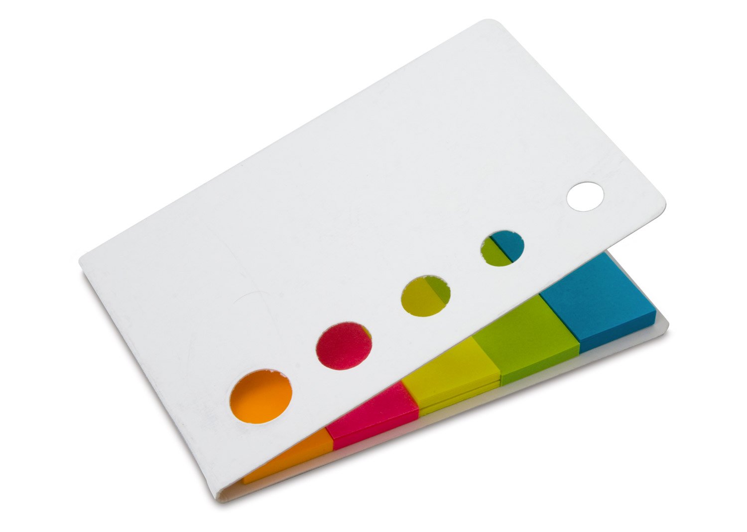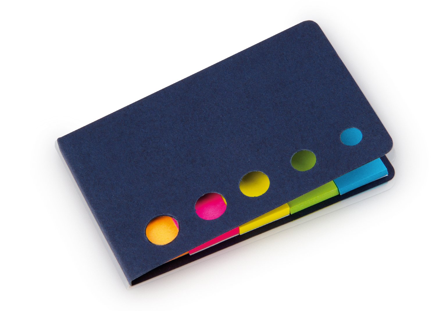 Memos y AdhesivosBanderas de papel adhesivas en 5 colores con 25 hojas cada una y tapa de cartón. Con troqueles circulares al frente.