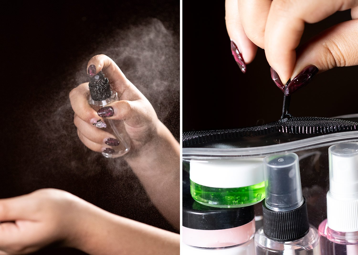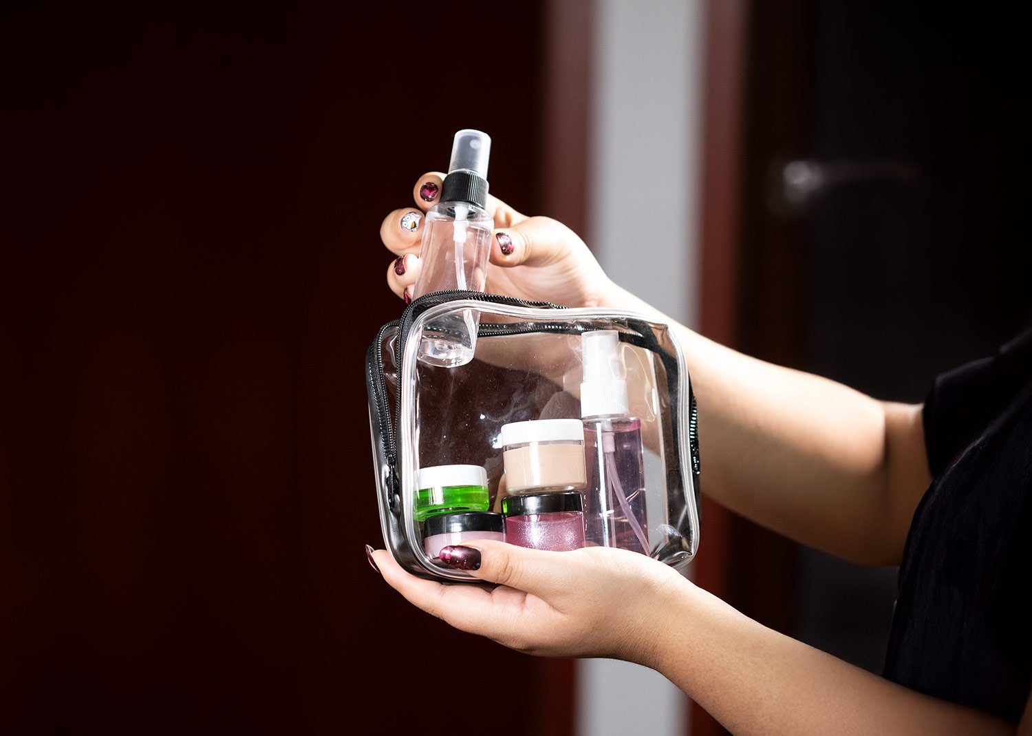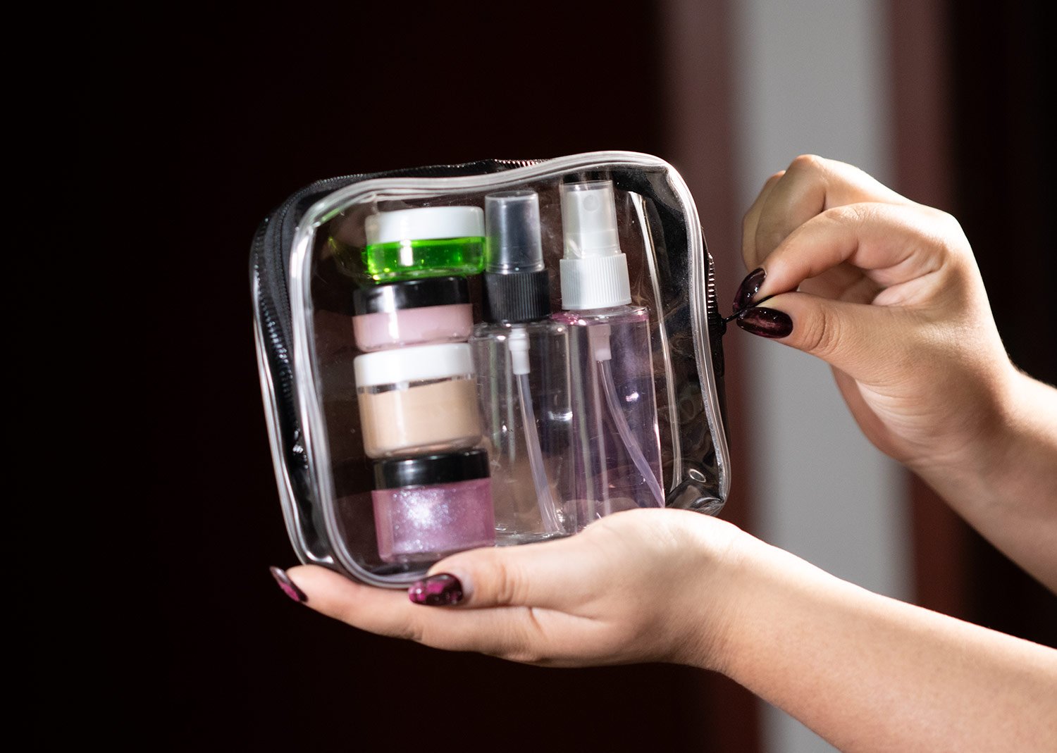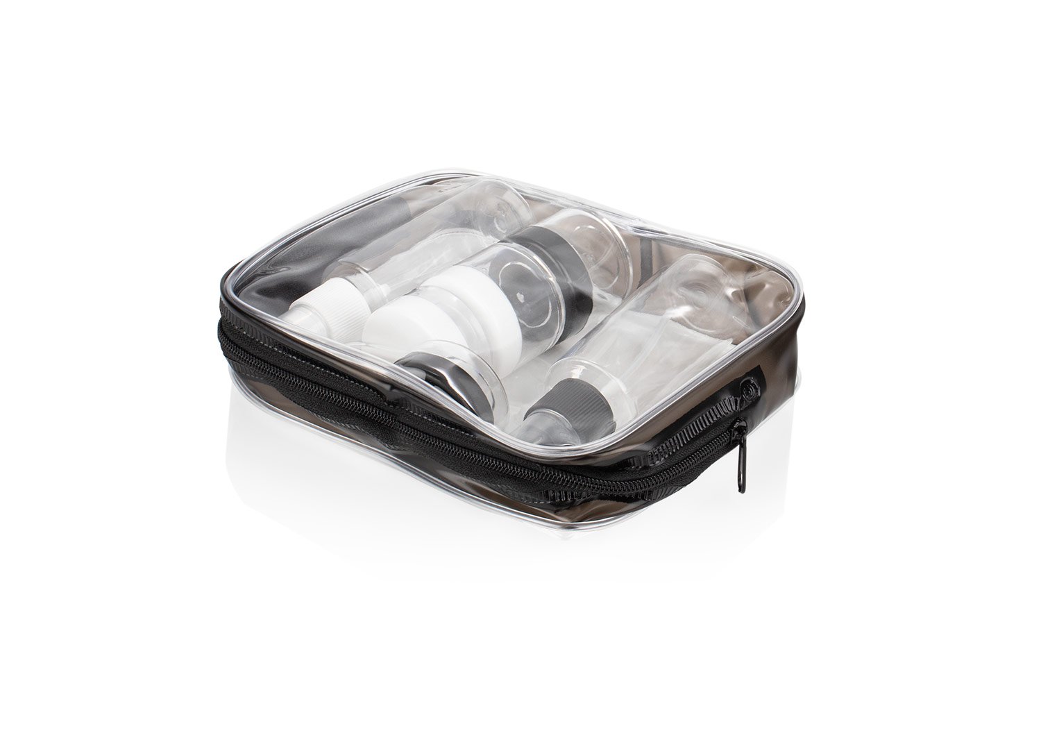 Set de viaje con estuche transparente en PVC con cremallera. Incluye frascos y envases reutilizables ideales para transportar líquidos, cremas o cosméticos de forma segura y práctica: Atomizadores: (11,5 X 2,5). Recipientes Medianos: (3,2 X 2,9). Recipientes Pequeños: (2 X 2,9). Perfecto para viajes o uso diario.
