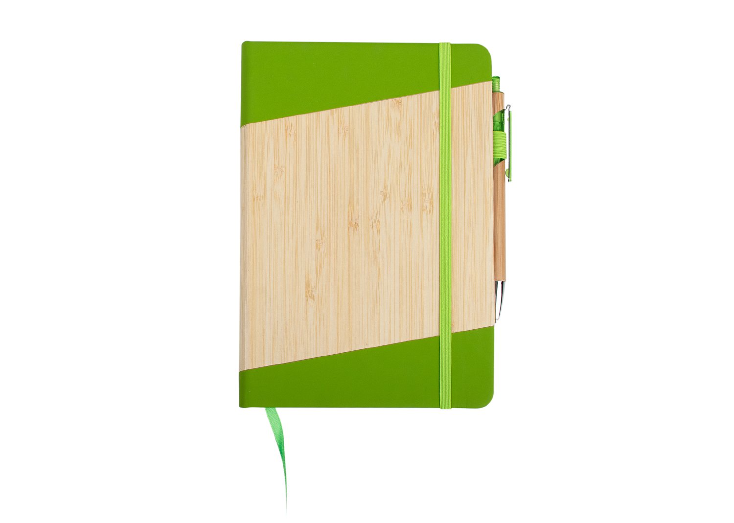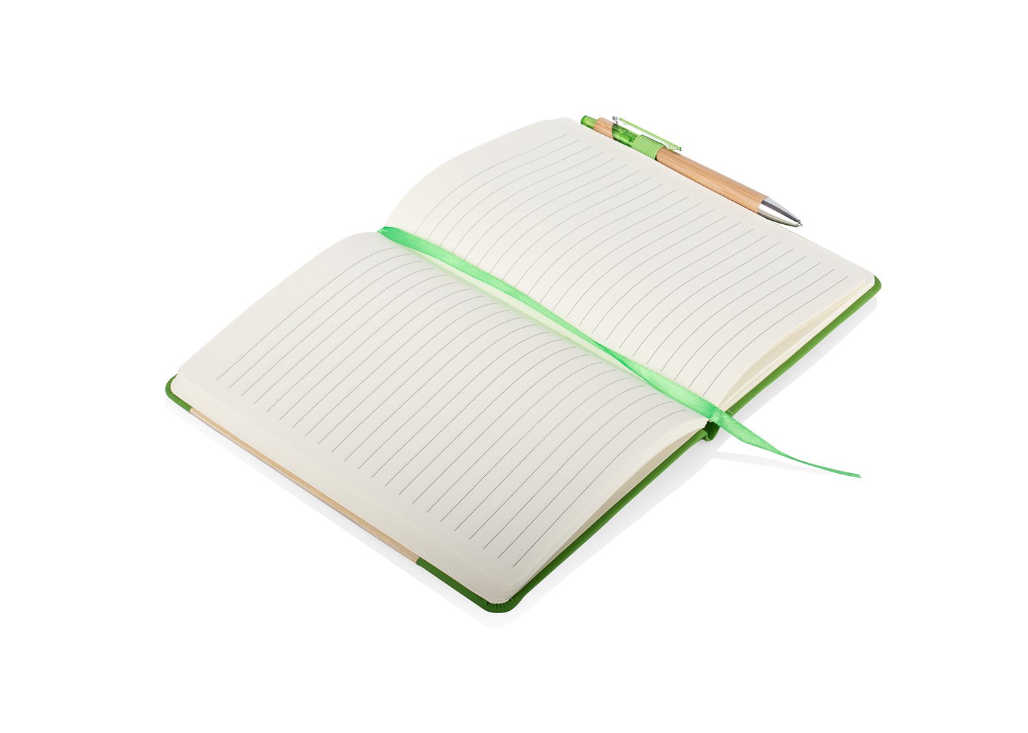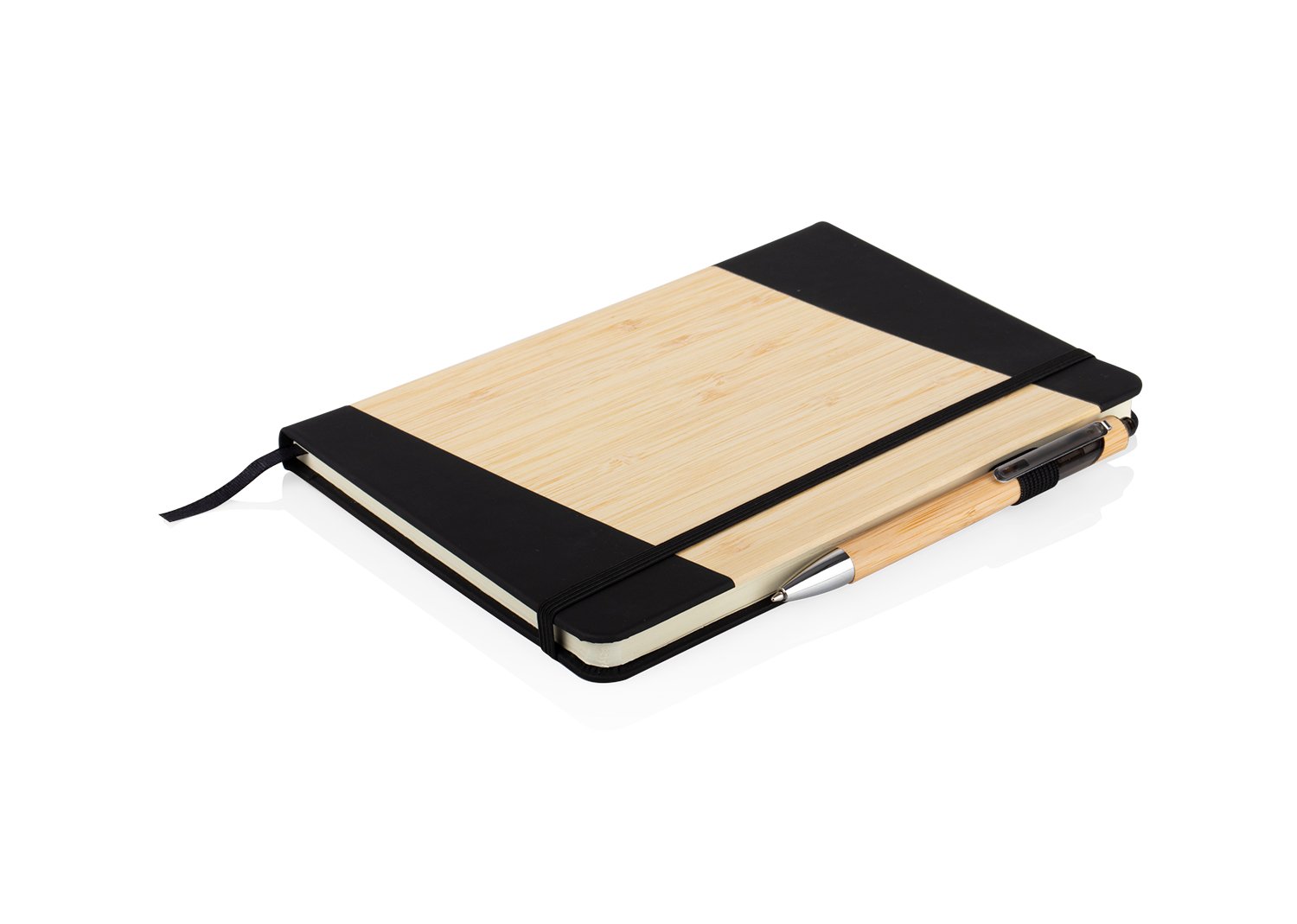 Libreta de hojas rayadas con resorte de ajuste y bolígrafo con sistema de apertura retráctil en bambú.