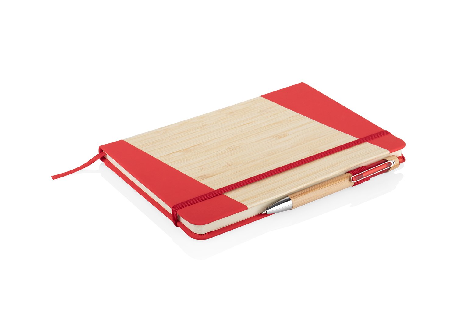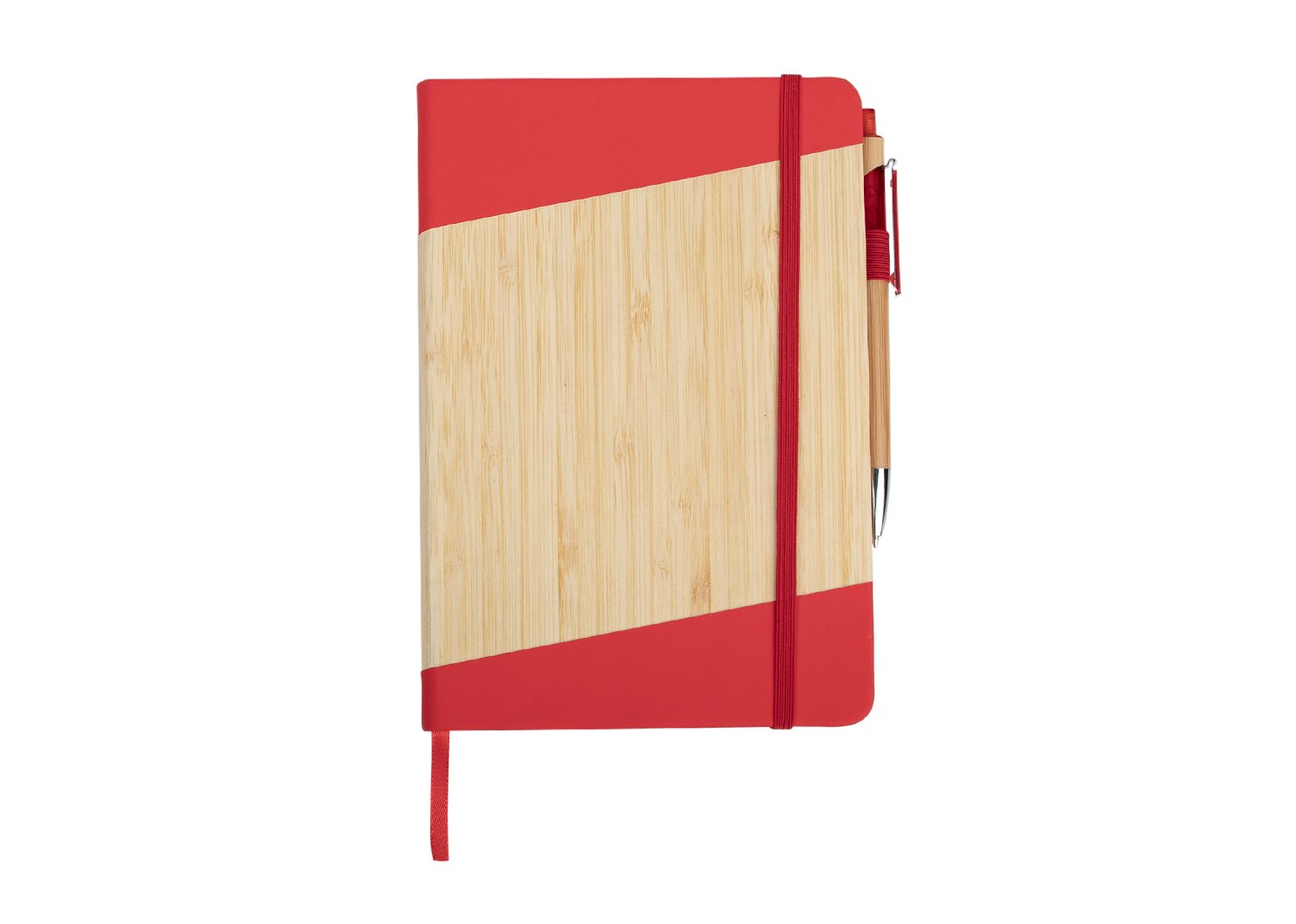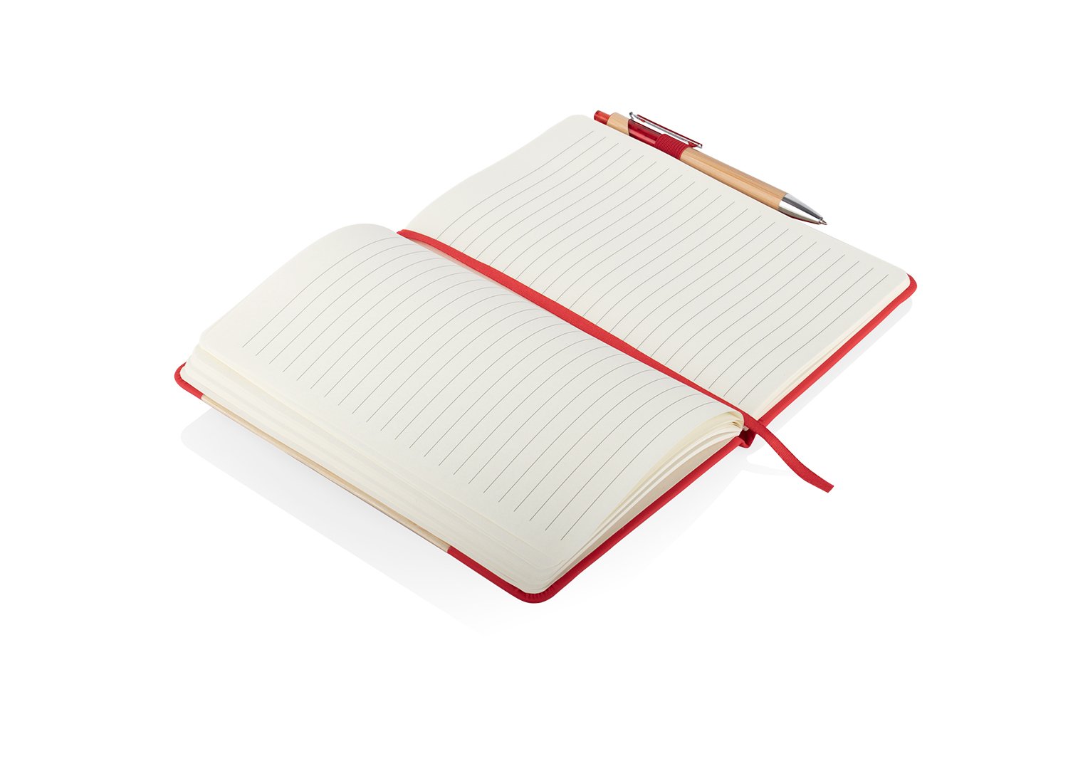 Libreta de hojas rayadas con resorte de ajuste y bolígrafo con sistema de apertura retráctil en bambú.