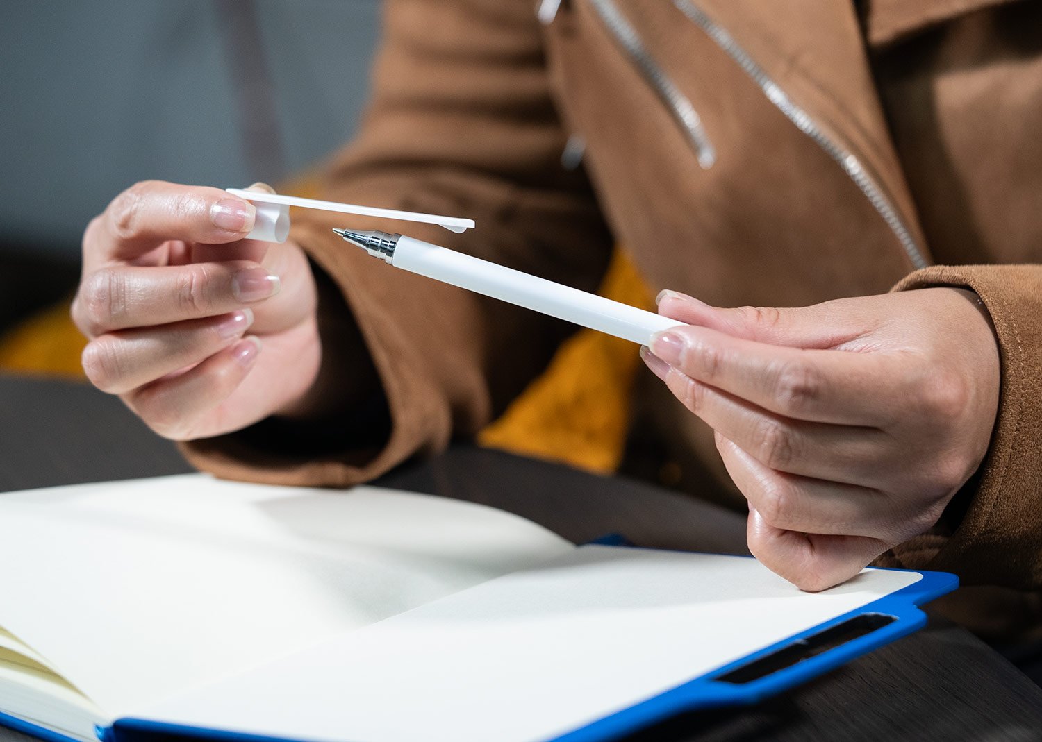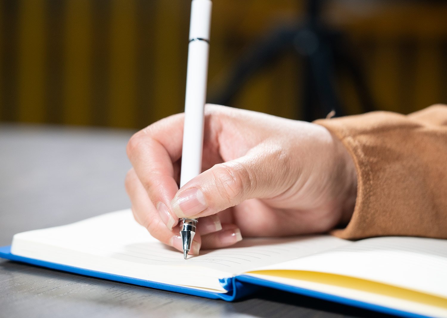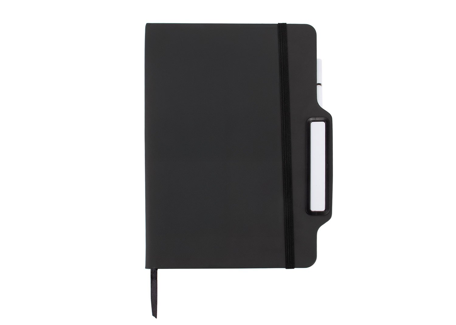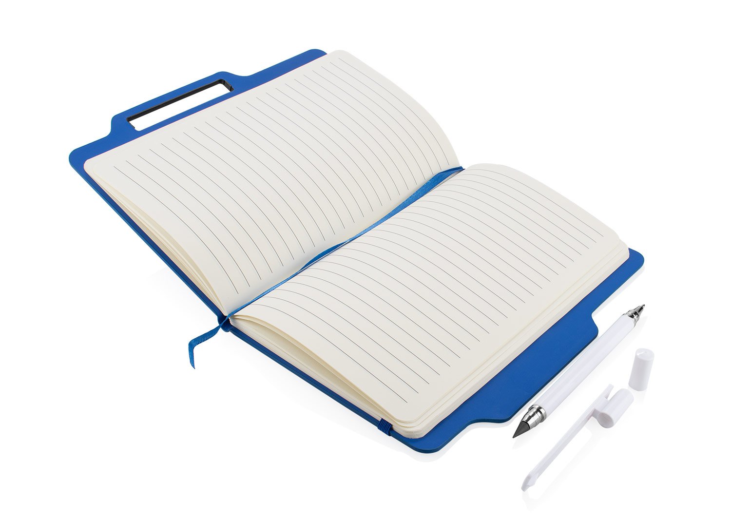 Libretas PlásticasFunda de cuero sintético con función de soporte para teléfono. Tamaño A5, 70 g, 80 hojas. Bolígrafo + lápiz infinito. Hojas rayadas.