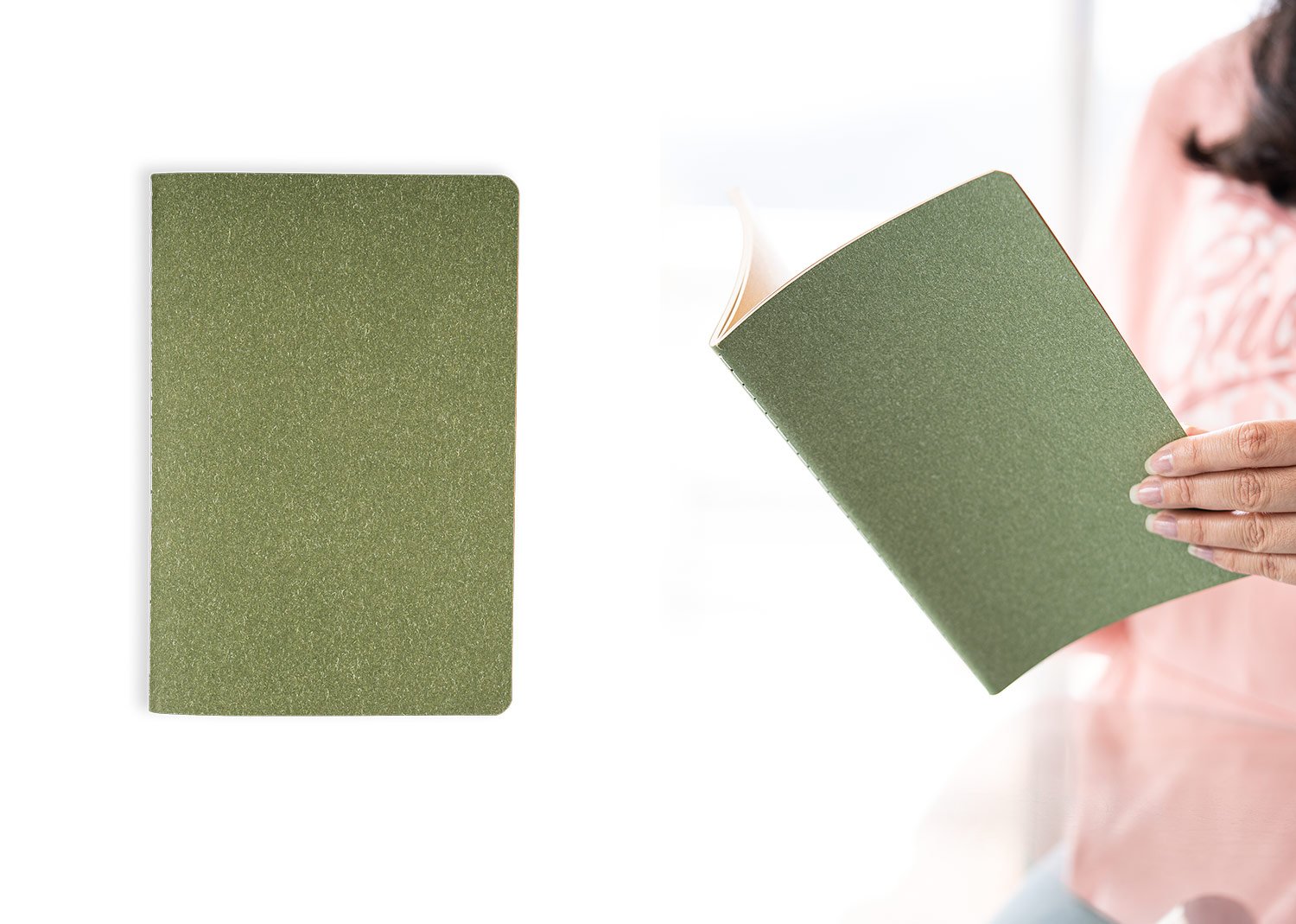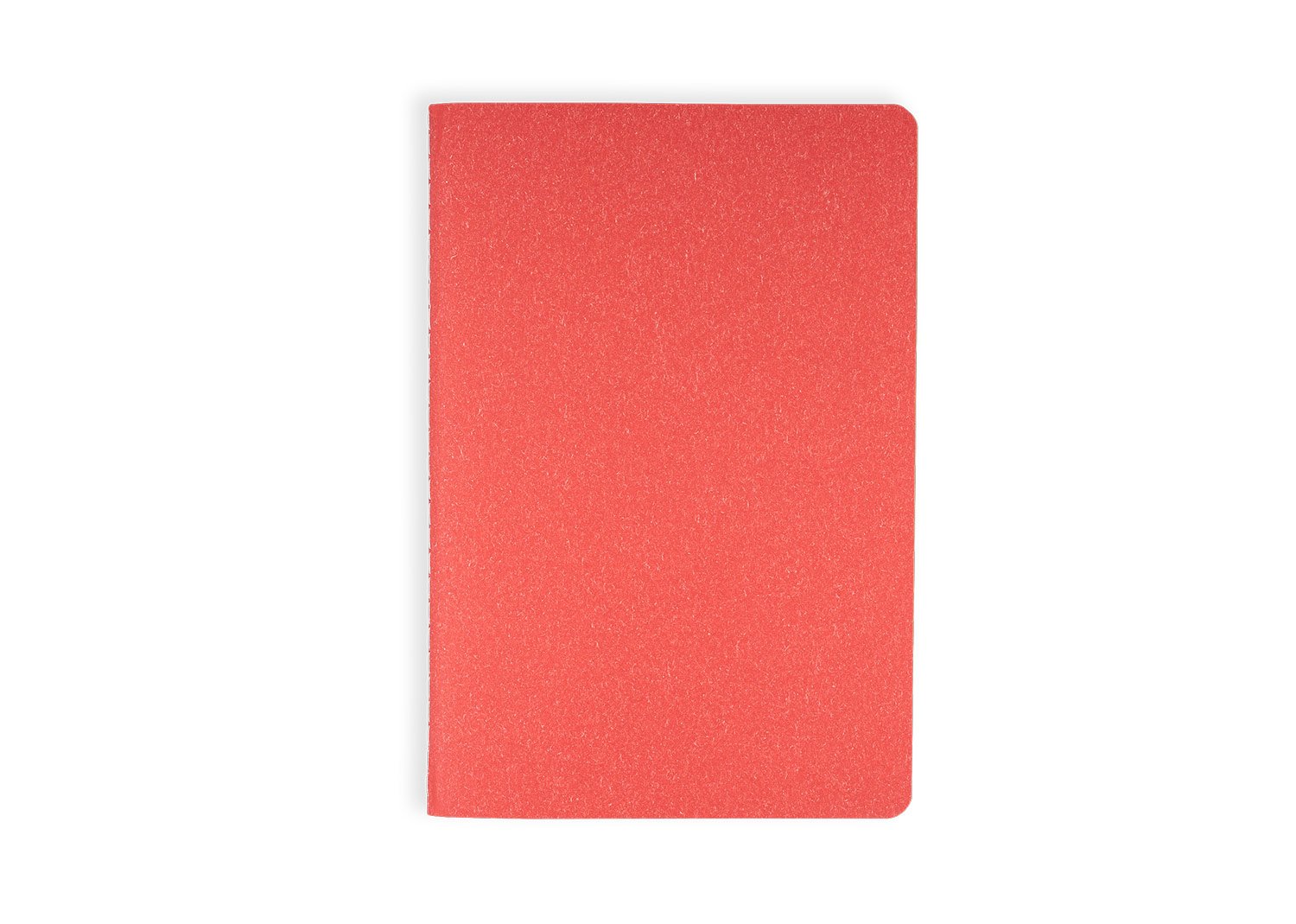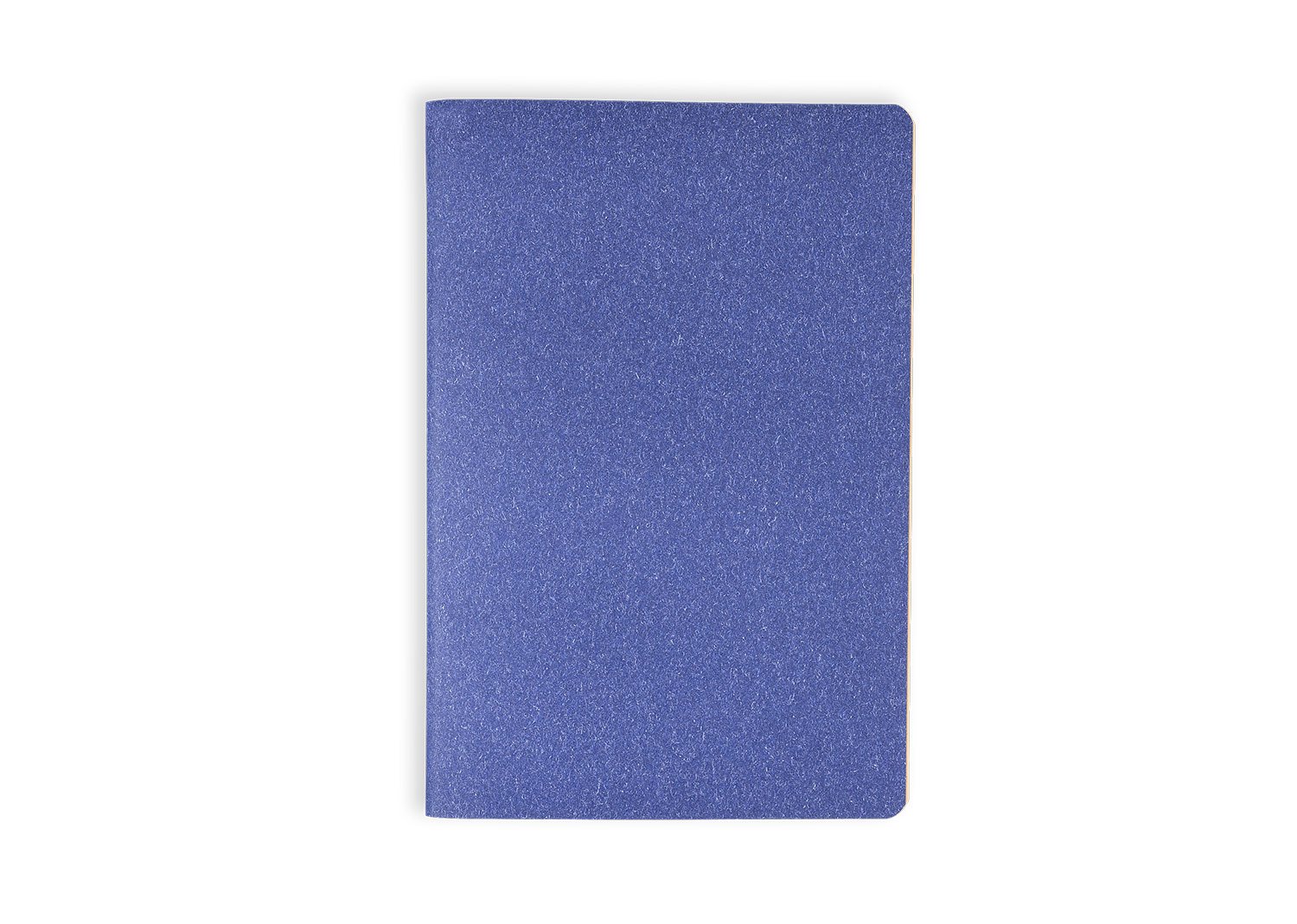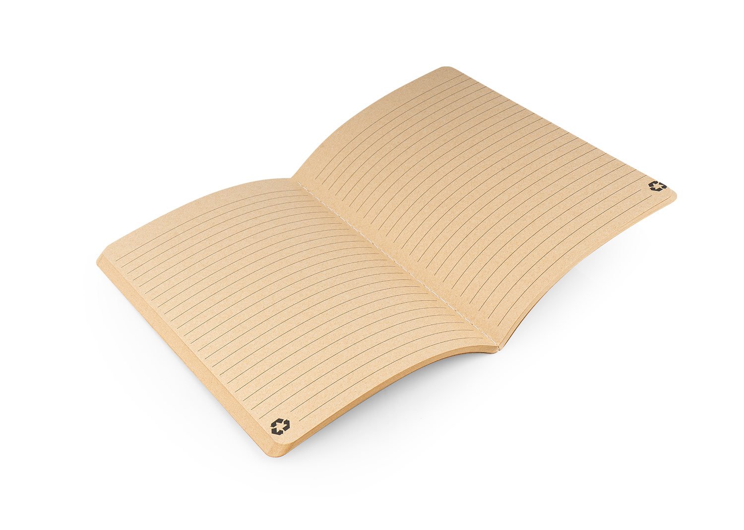 Cuaderno cosido con cubierta en papel esmaltado. Separador de páginas. Contiene 60 hojas rayadas en papel reciclado. Tamaño aproximado de la hoja: A5.