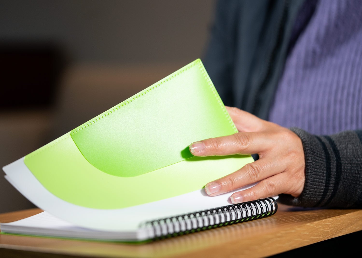 Libreta argollada con cubierta blanca con dos bolsillos de diferentes tamaños y colores. Contraportada en PP blanca. 70 hojas de papel 70 g/m² rayadas tamaño A5.