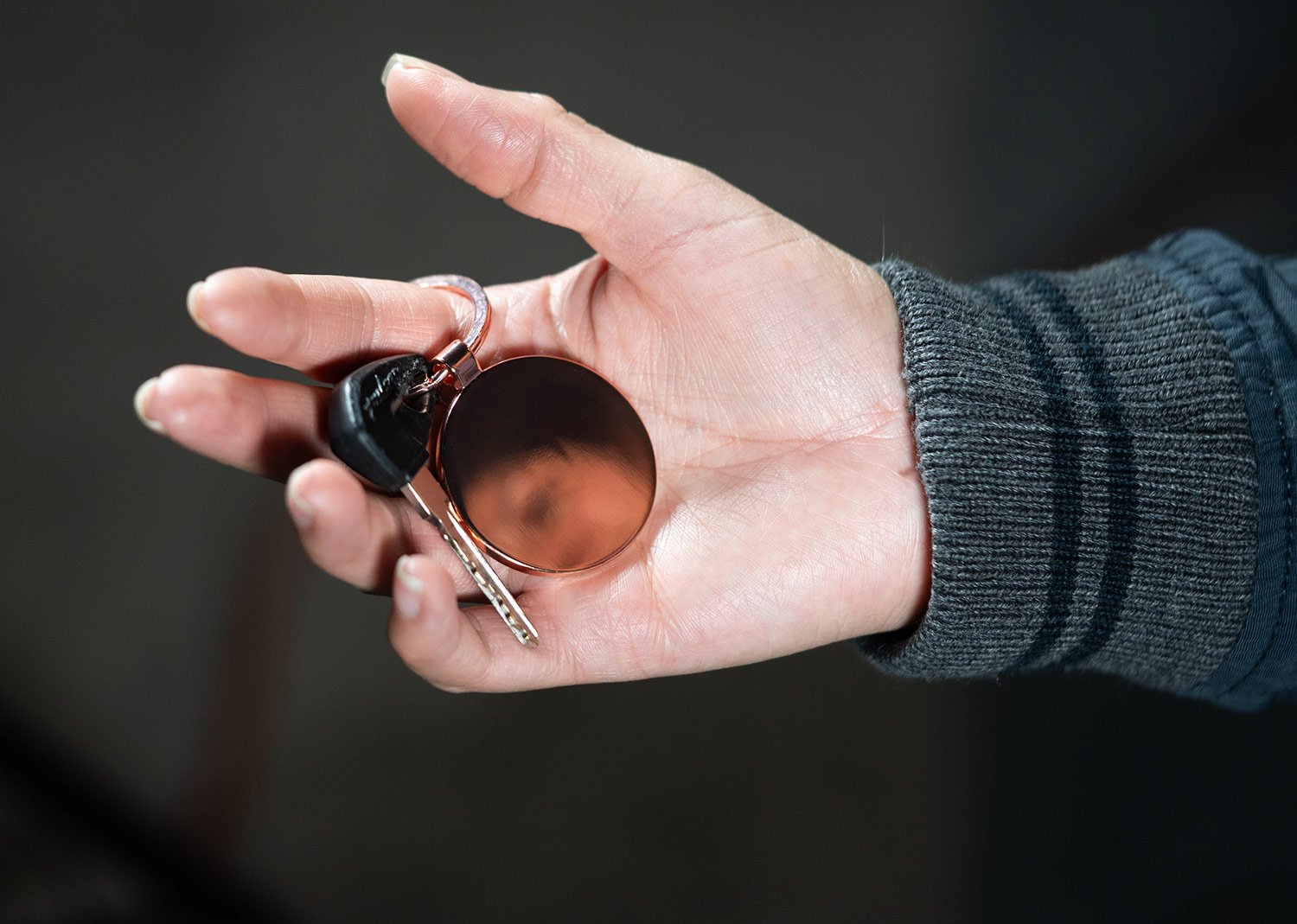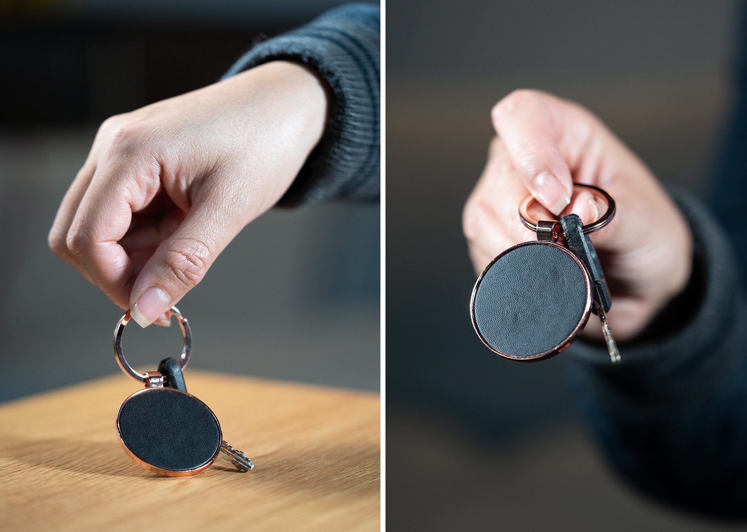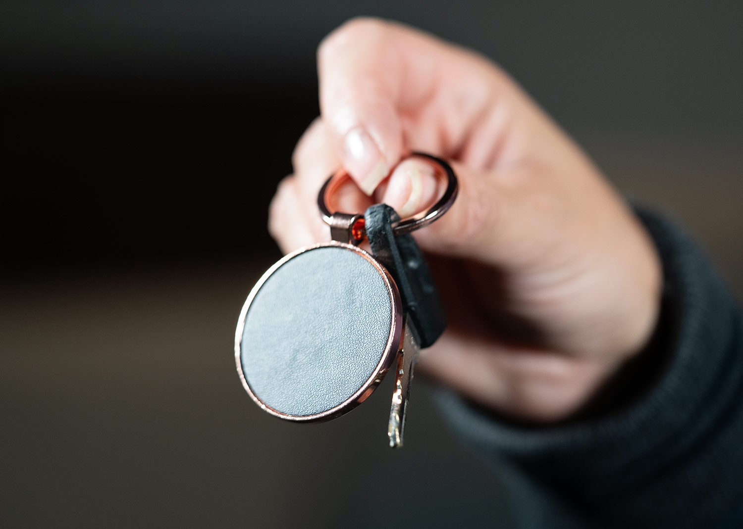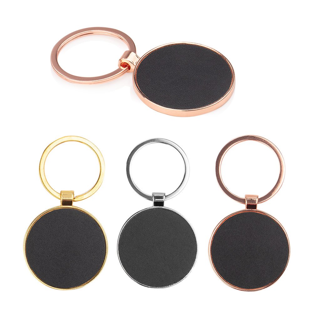 Llaveros MetálicosLlavero metálico con forma redonda. Superficie oscura para marcación.