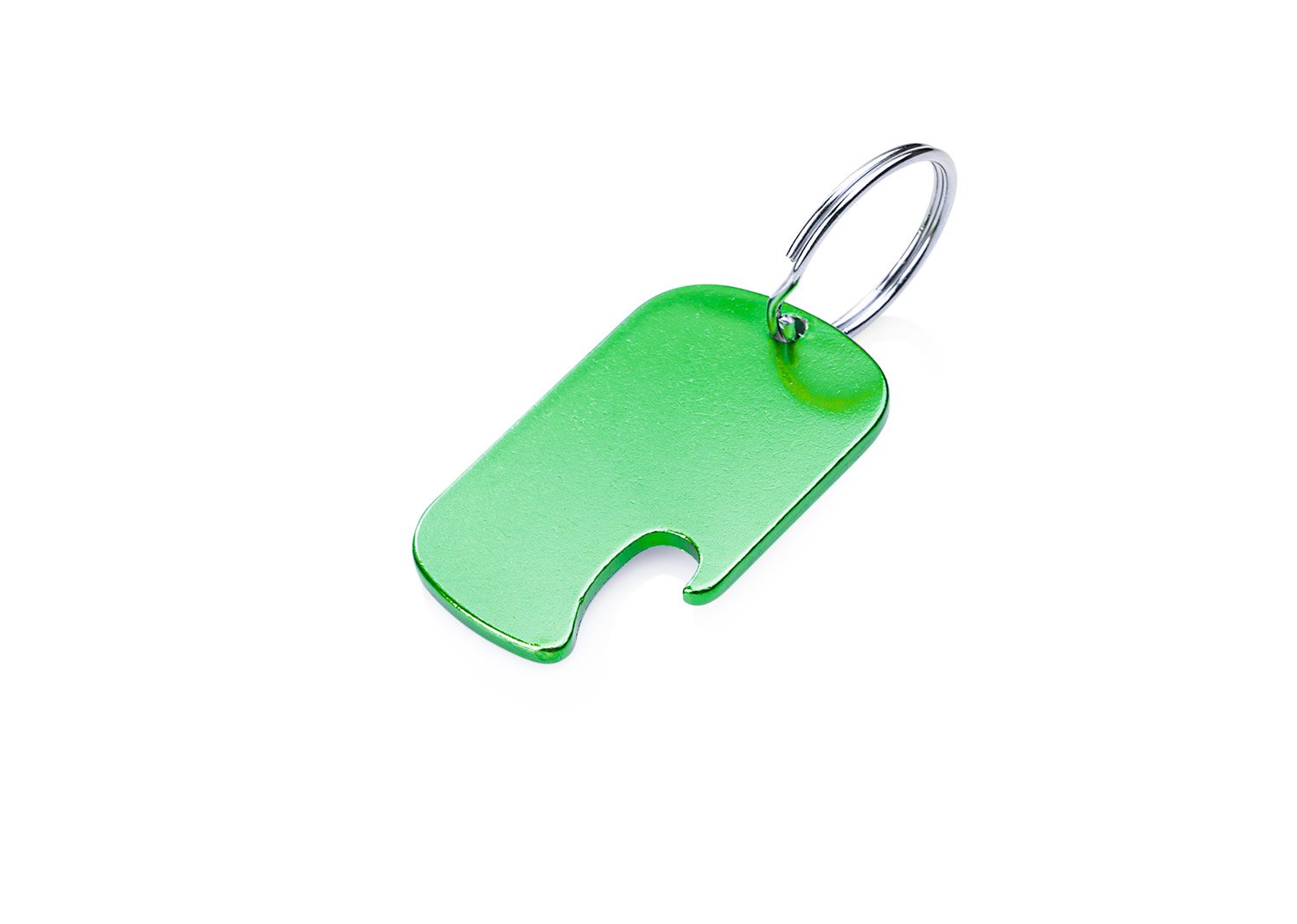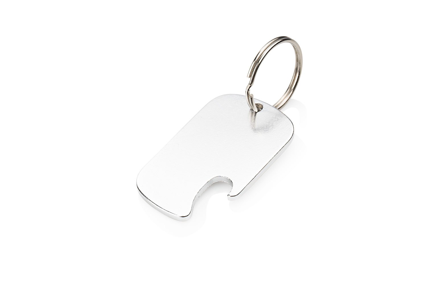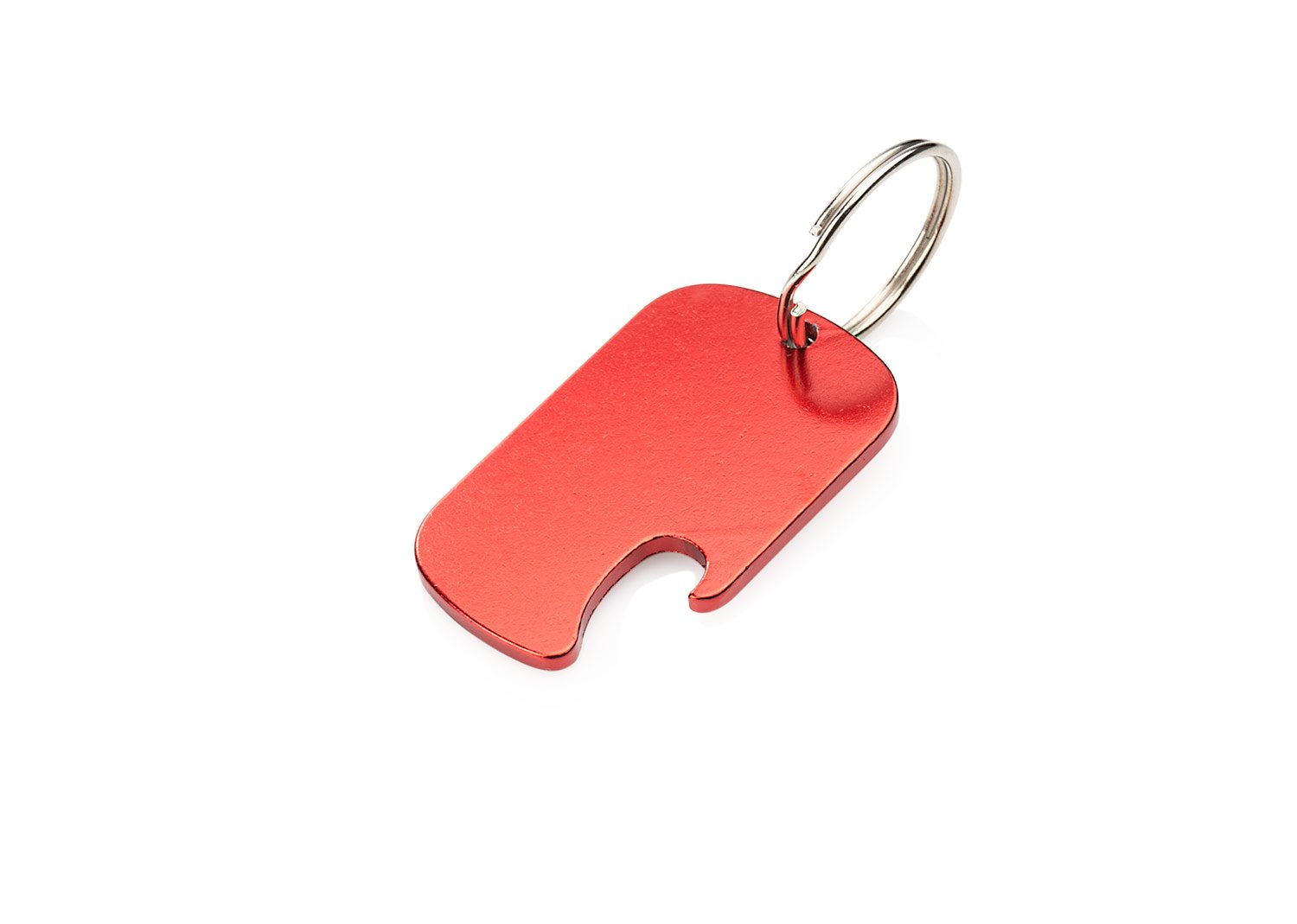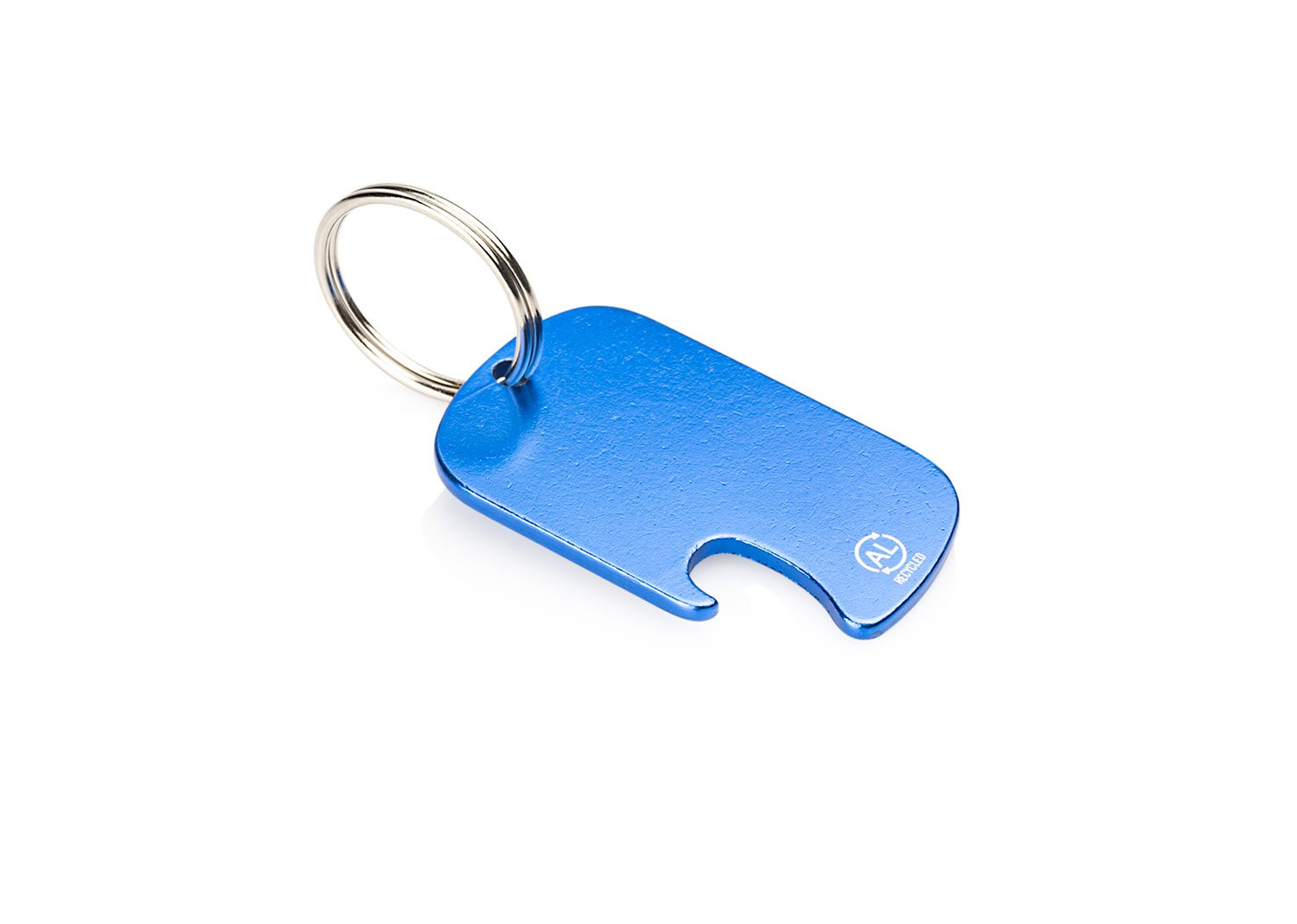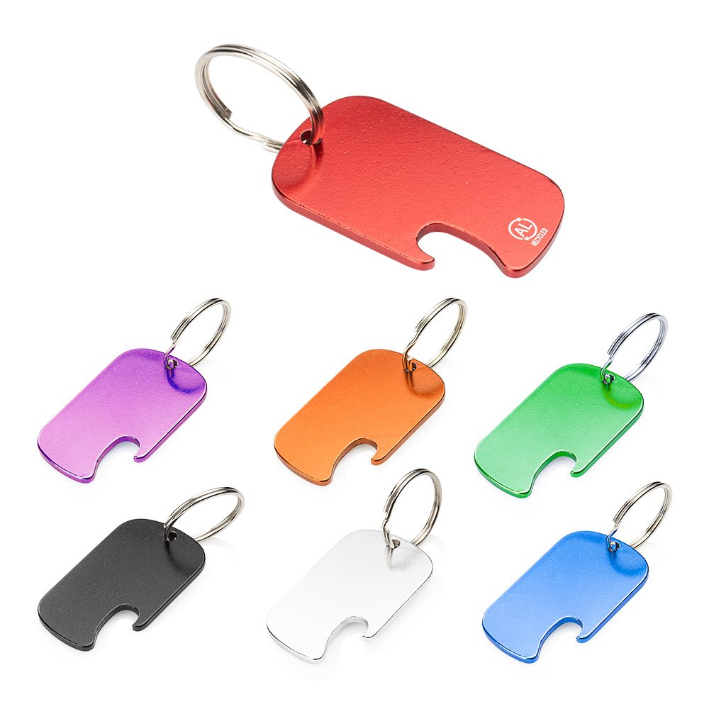 Llavero destapador de aluminio reciclado, con zona amplia para impresión de la marca.