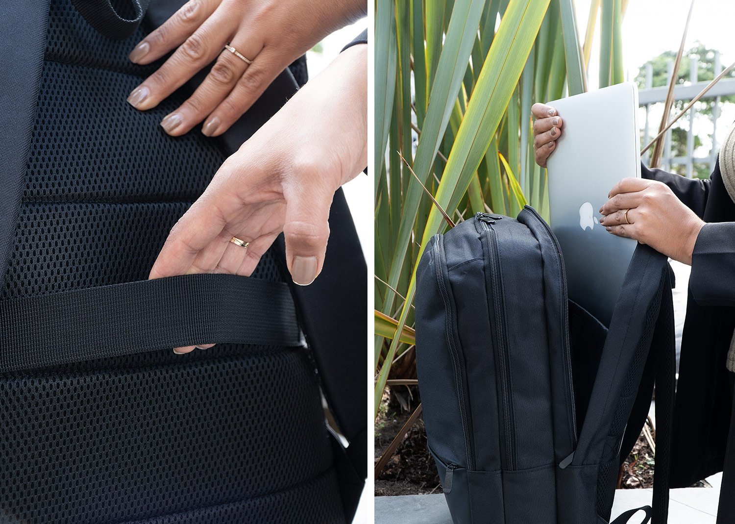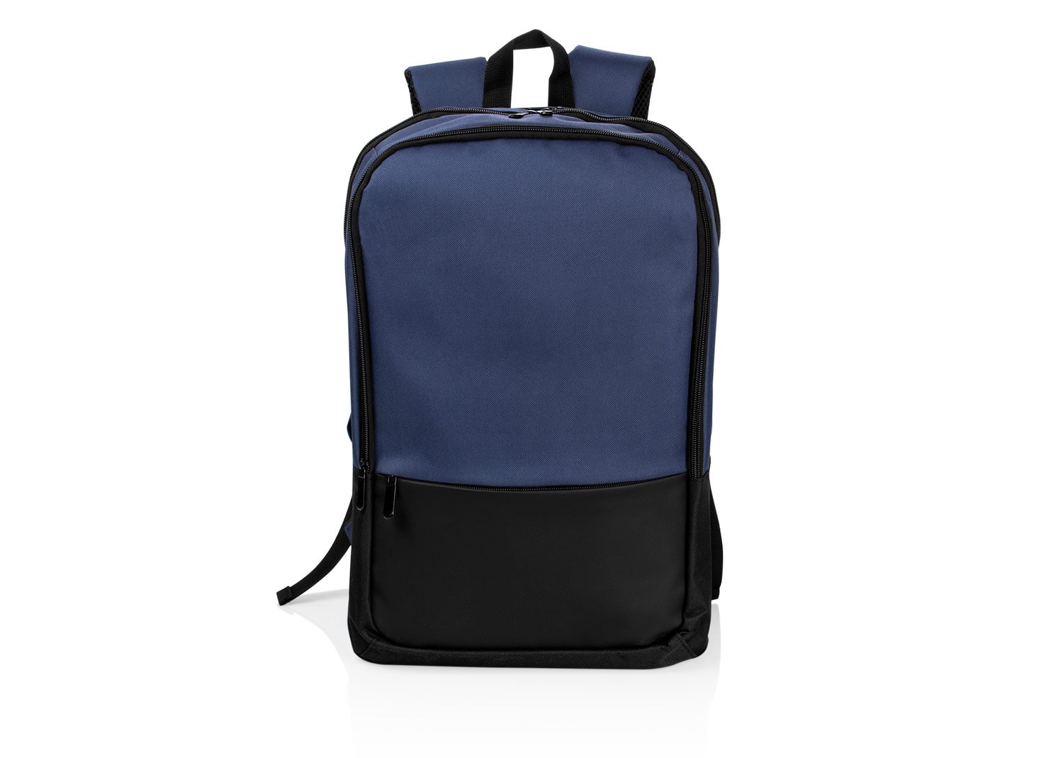 Cuenta con 3 bolsillos principales con cremallera y tiradores dobles (uno de ellos para portátil y documentos en el interior). Bolsillo frontal pequeño en cuero. Panel de malla sándwich en la parte trasera con costuras. Una cinta cosida en el medio para carro. Volumen aproximado: 17 litros.