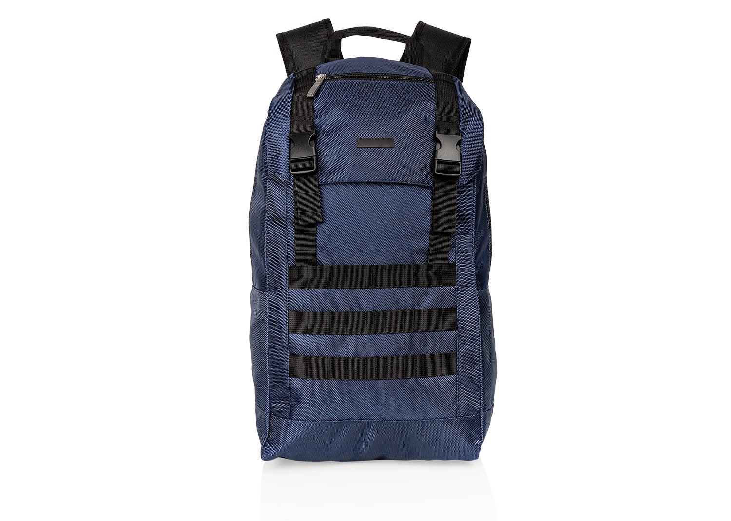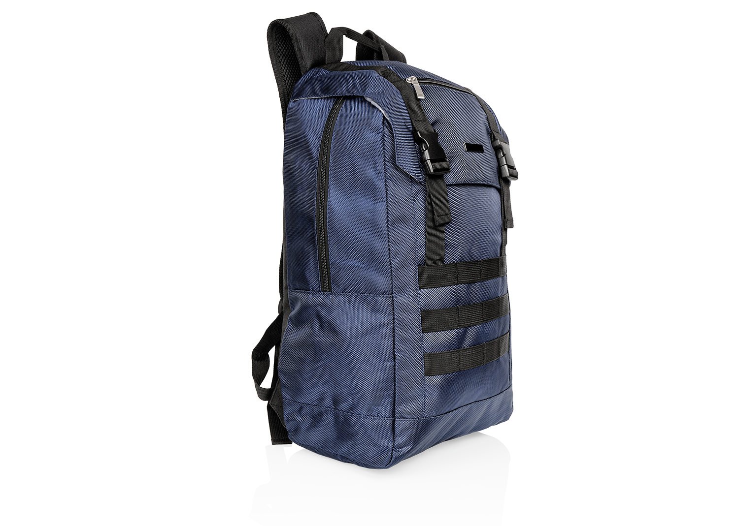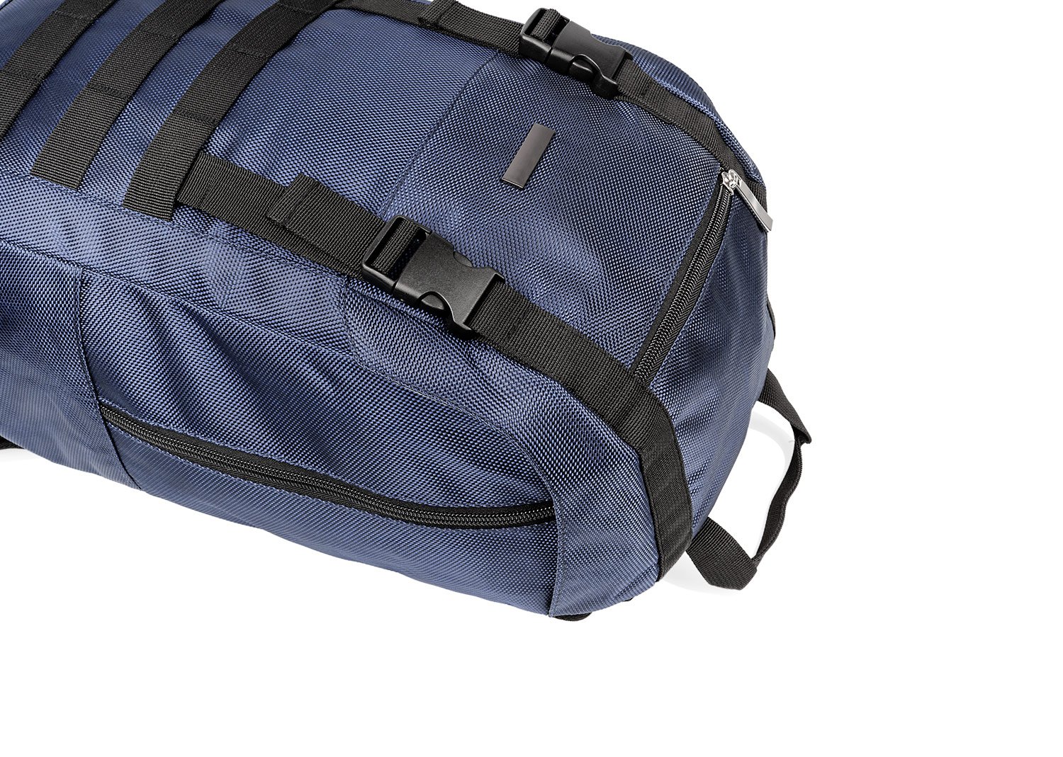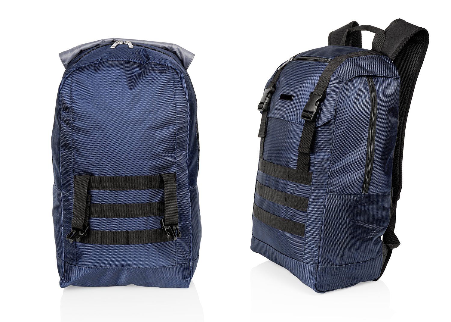 Morral para laptop con espaldar ergonómico y cargaderas ajustables y acolchadas. Cuenta con un bolsillo frontal, dos bolsillos medianos con compartimentos especiales en el interior y un bolsillo principal con un compartimento para dispositivos portátiles de 15″. Además, tiene dos bolsillos laterales de malla. Incluye una placa metálica para marca láser. Volumen aproximado: 23 litros.