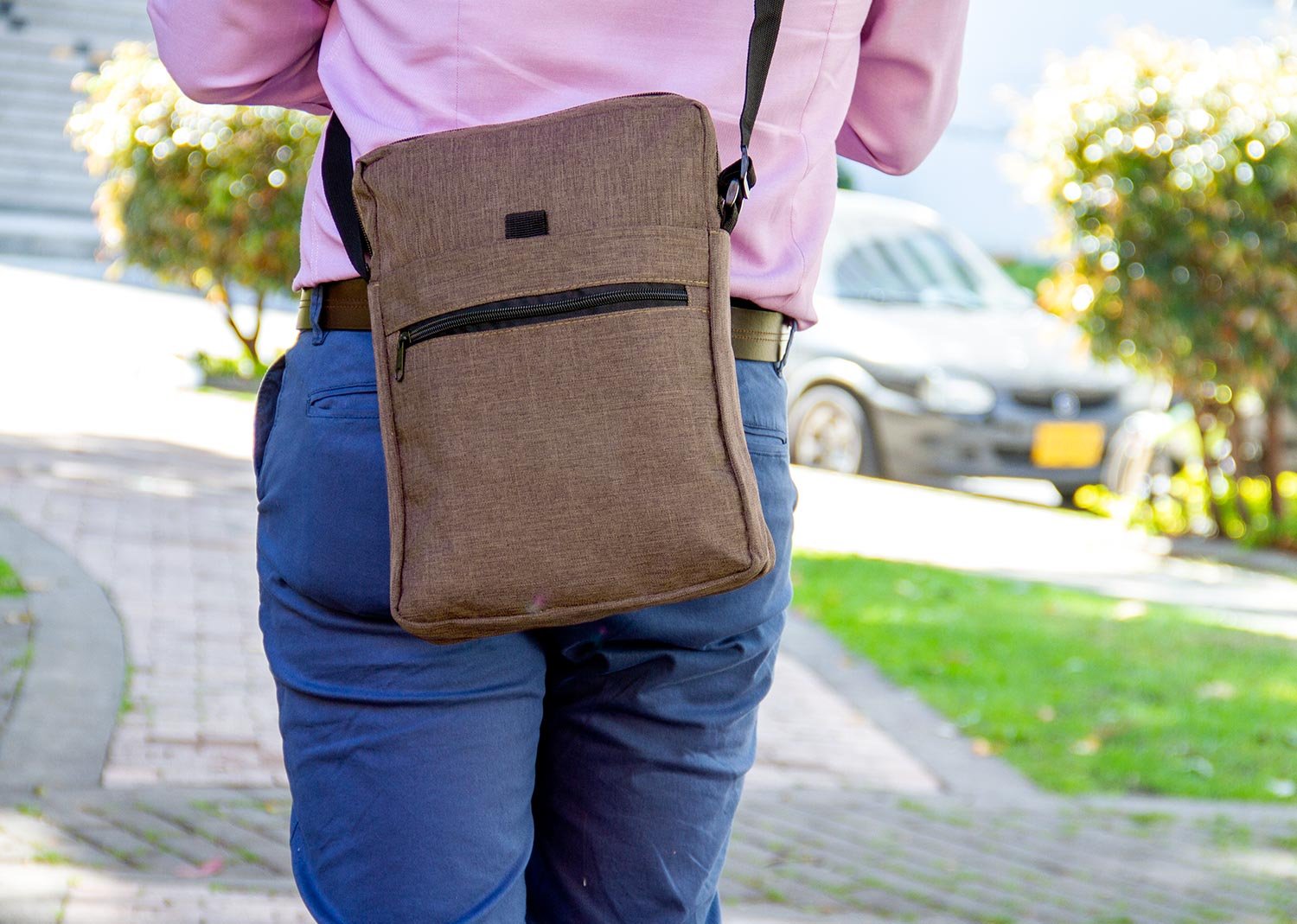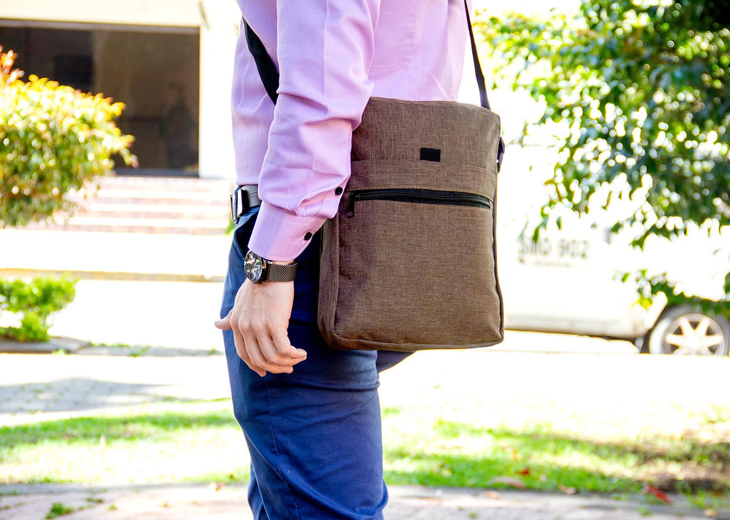 Manos libres con cargadera ajustable y agarradera. Bolsillo principal y frontal en cremallera, bolsillo medio con cierre en velcro.