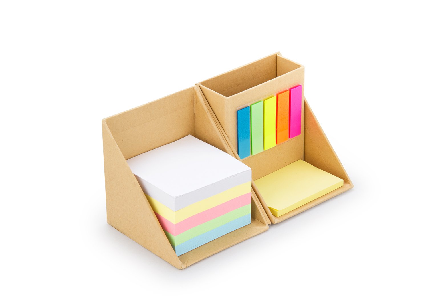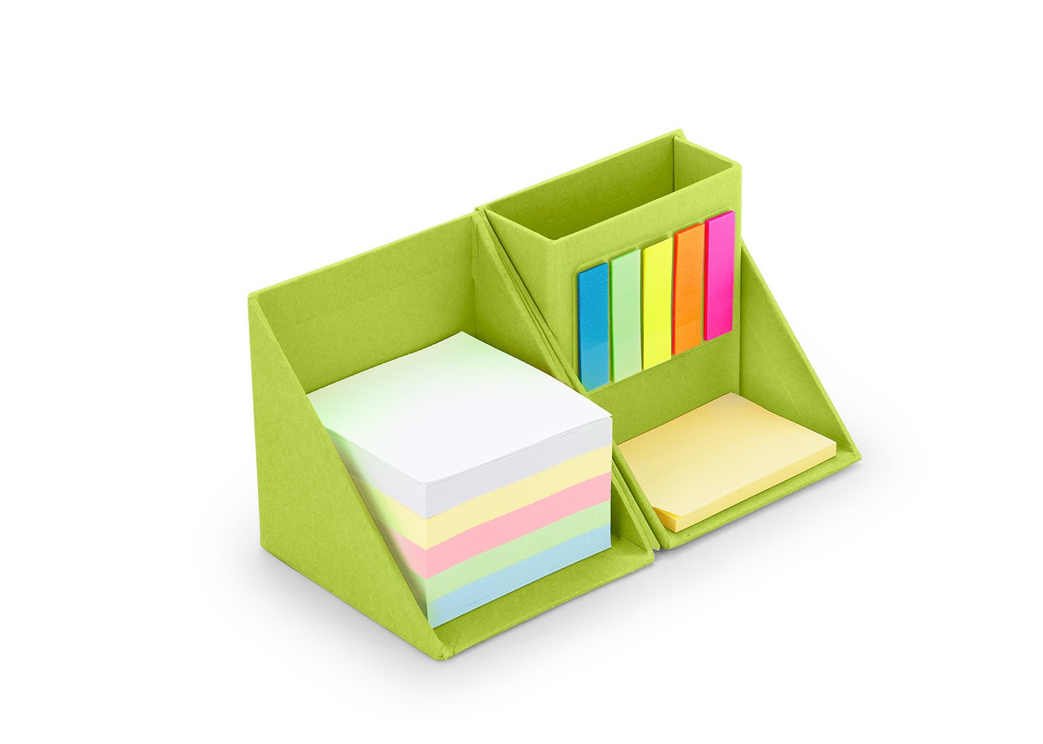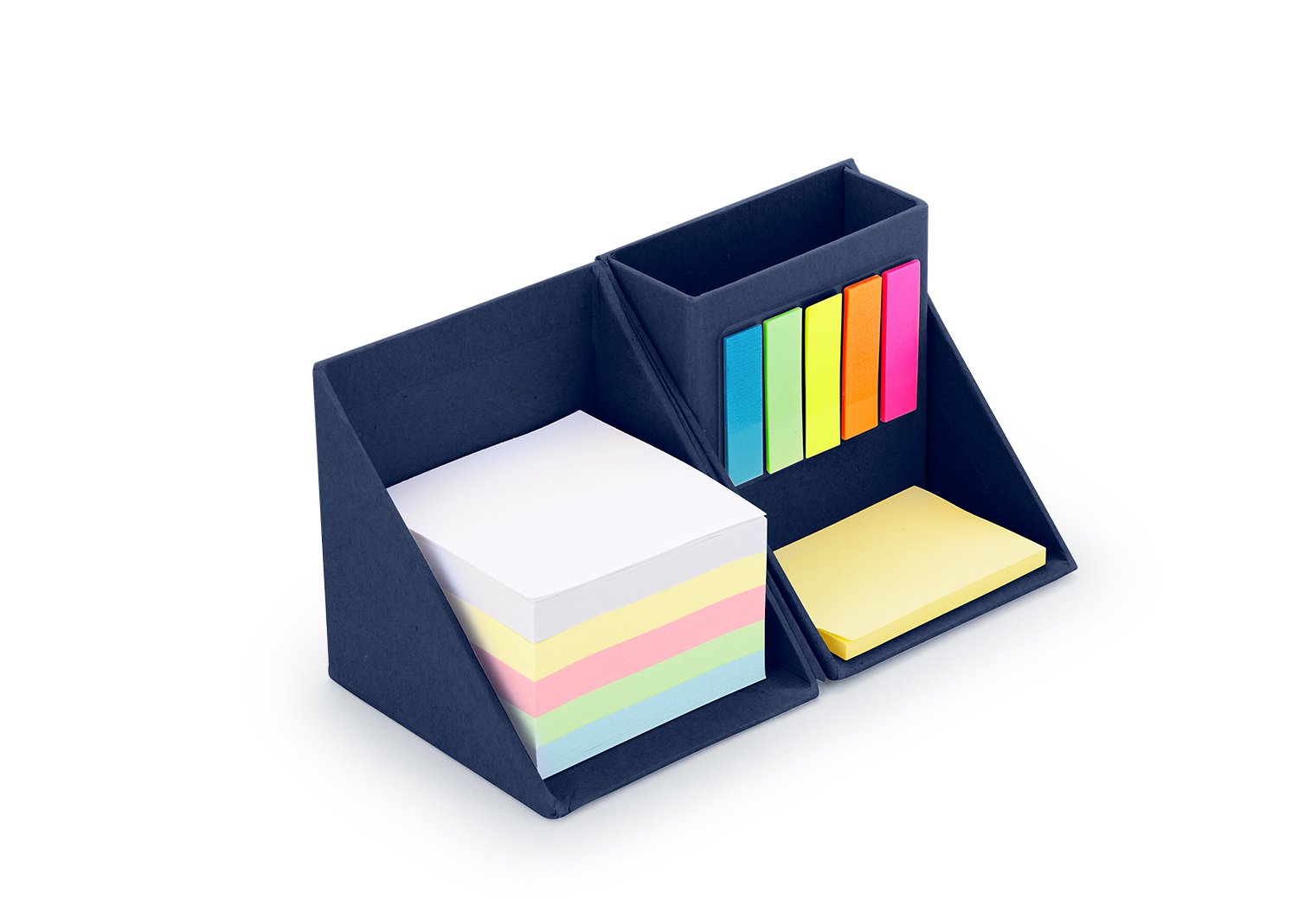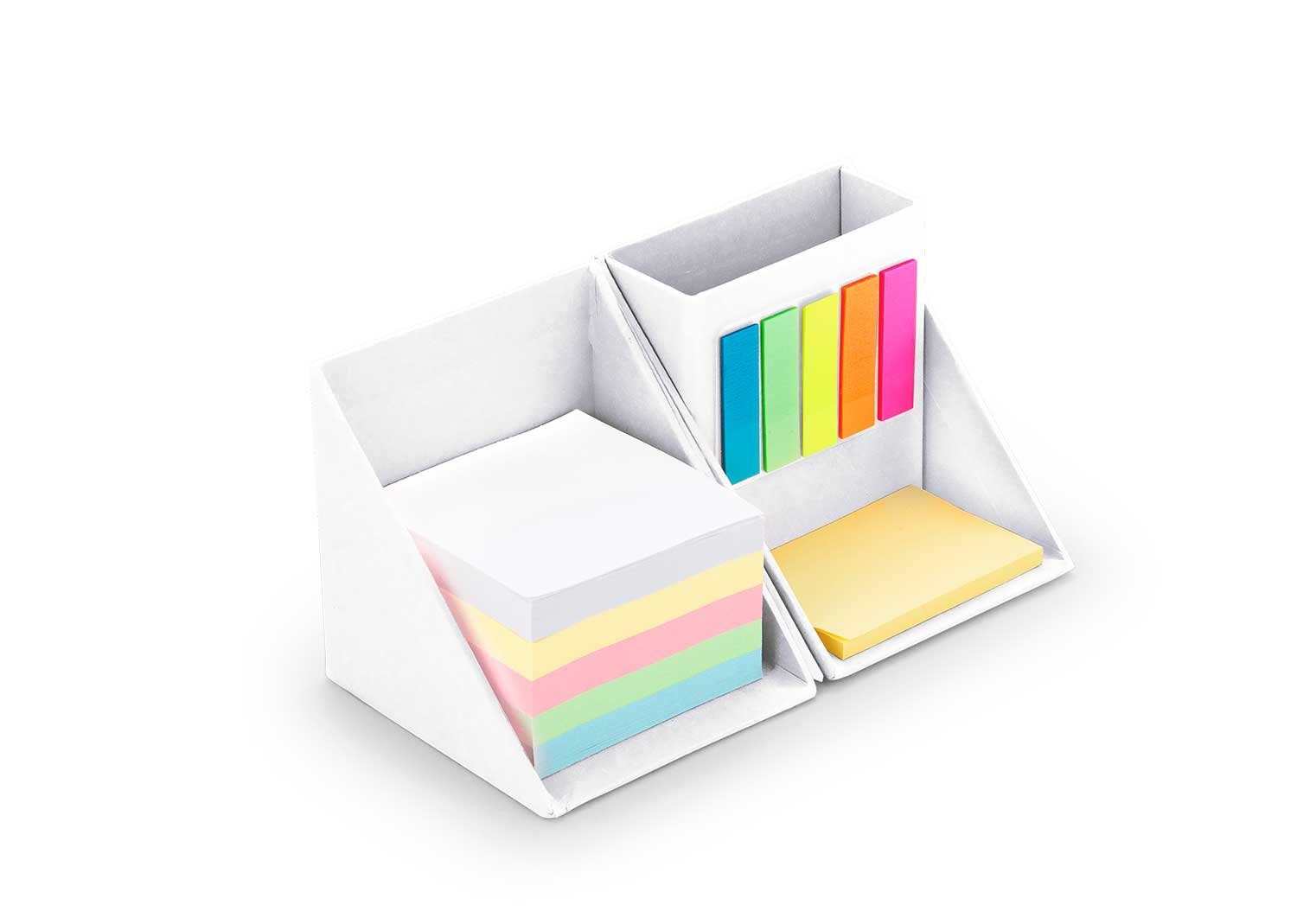Memos y AdhesivosSet con forma de cubo con espacio para las tarjetas ó bolígrafos. Contiene: Taco de 5 colores de 100 hojas cada color, 1 set de memos amarillos de 50 hojas y 5 tacos de banderitas PET adhesivas en diferentes colores, de 25 hojas c/u.