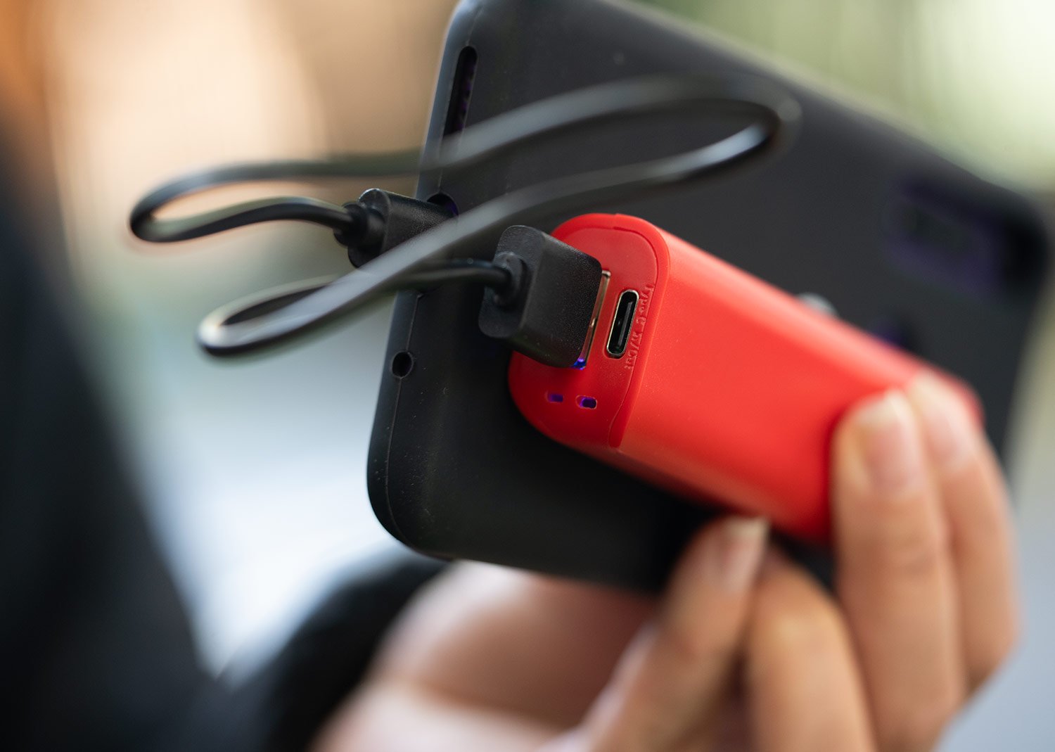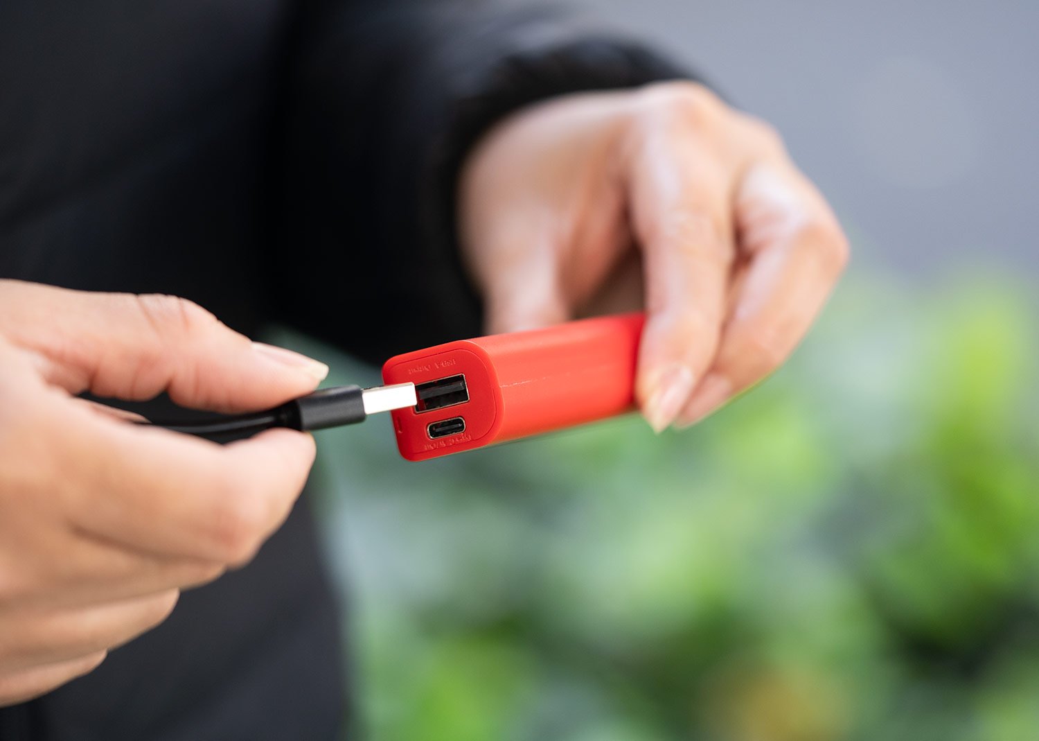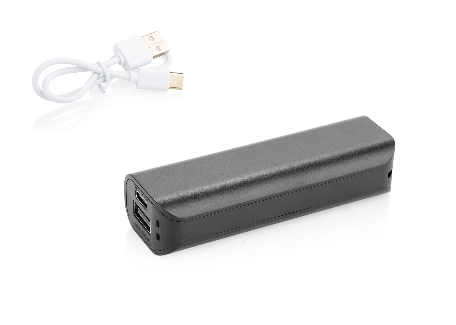 Mini banco de carga portátil de 2200 mAh, con entrada Tipo C y USB A. Cuenta con 2 aberturas junto a las entradas.