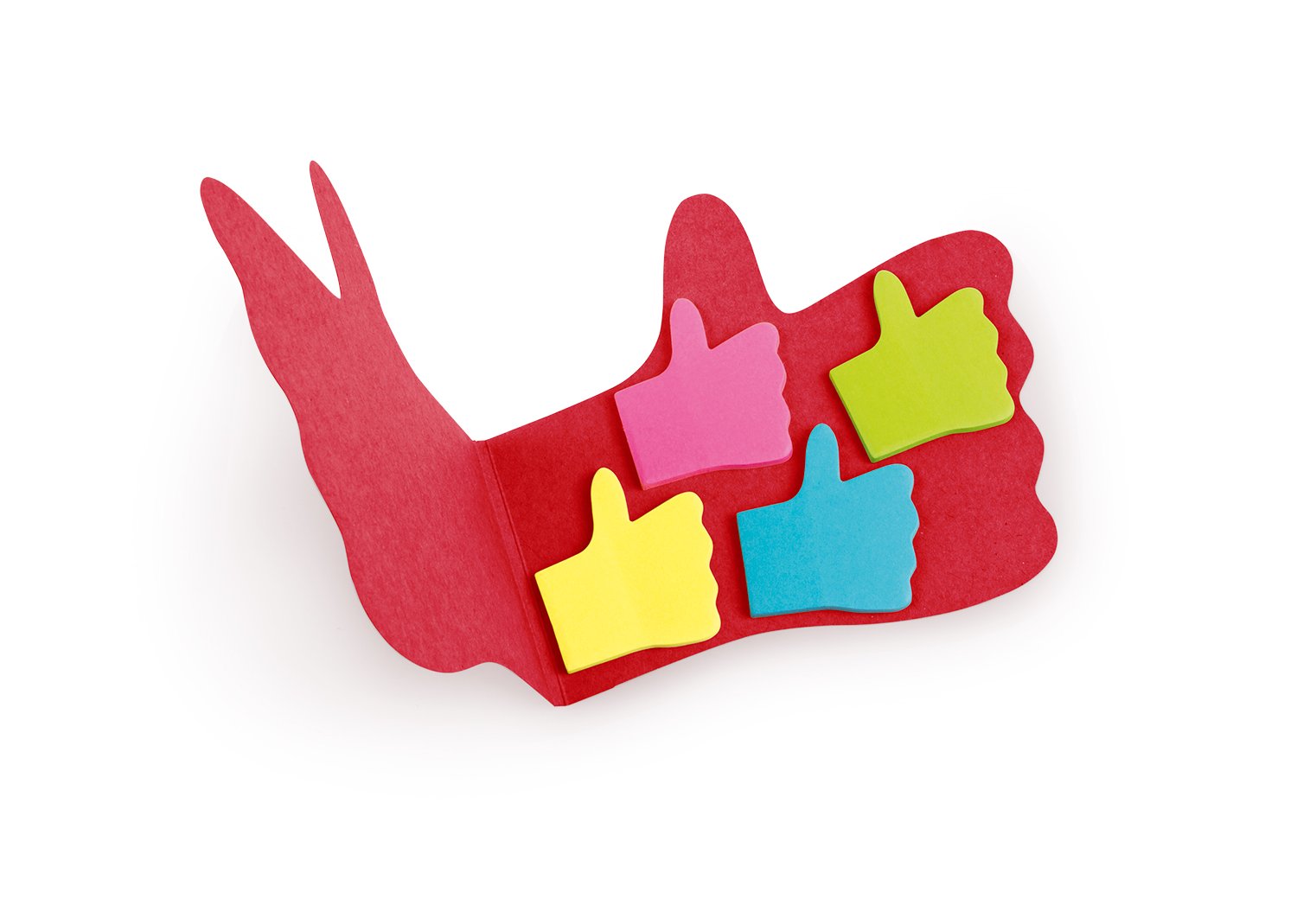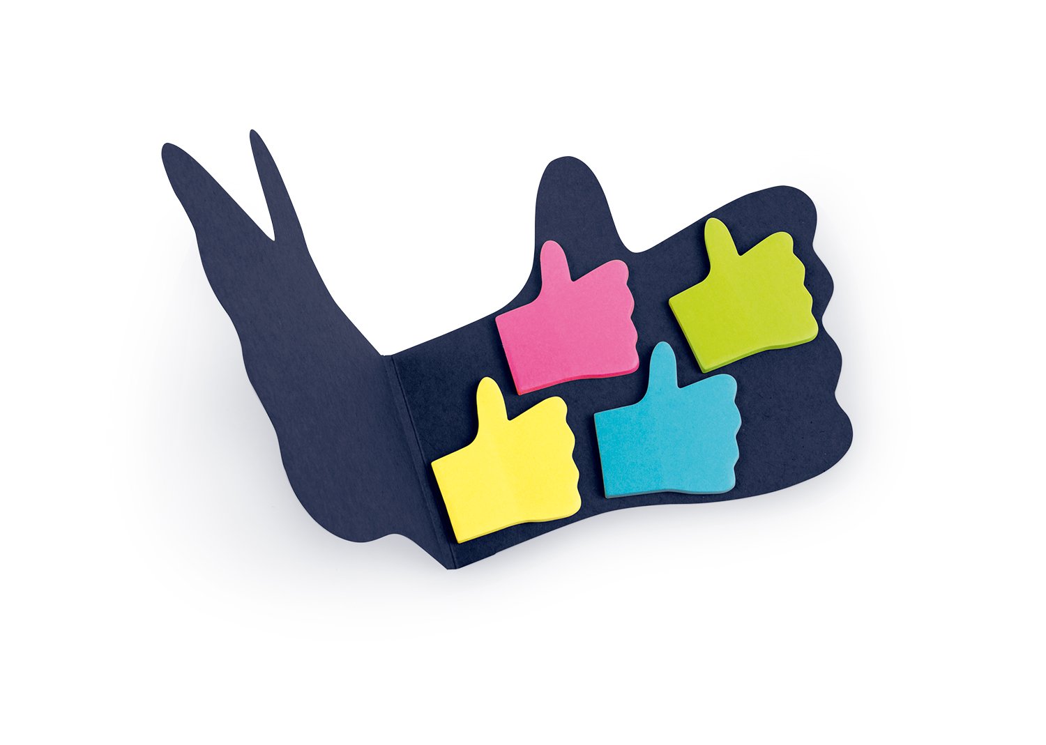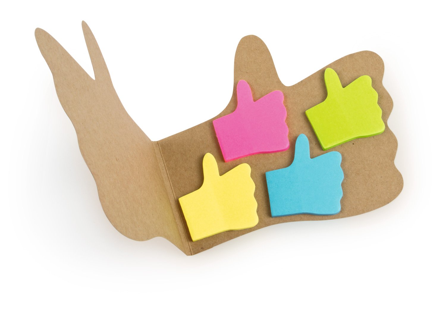 Memos y AdhesivosMemo con cubierta con forma de mano con pulgar arriba. 25 notas adhesivas por color (4 colores).