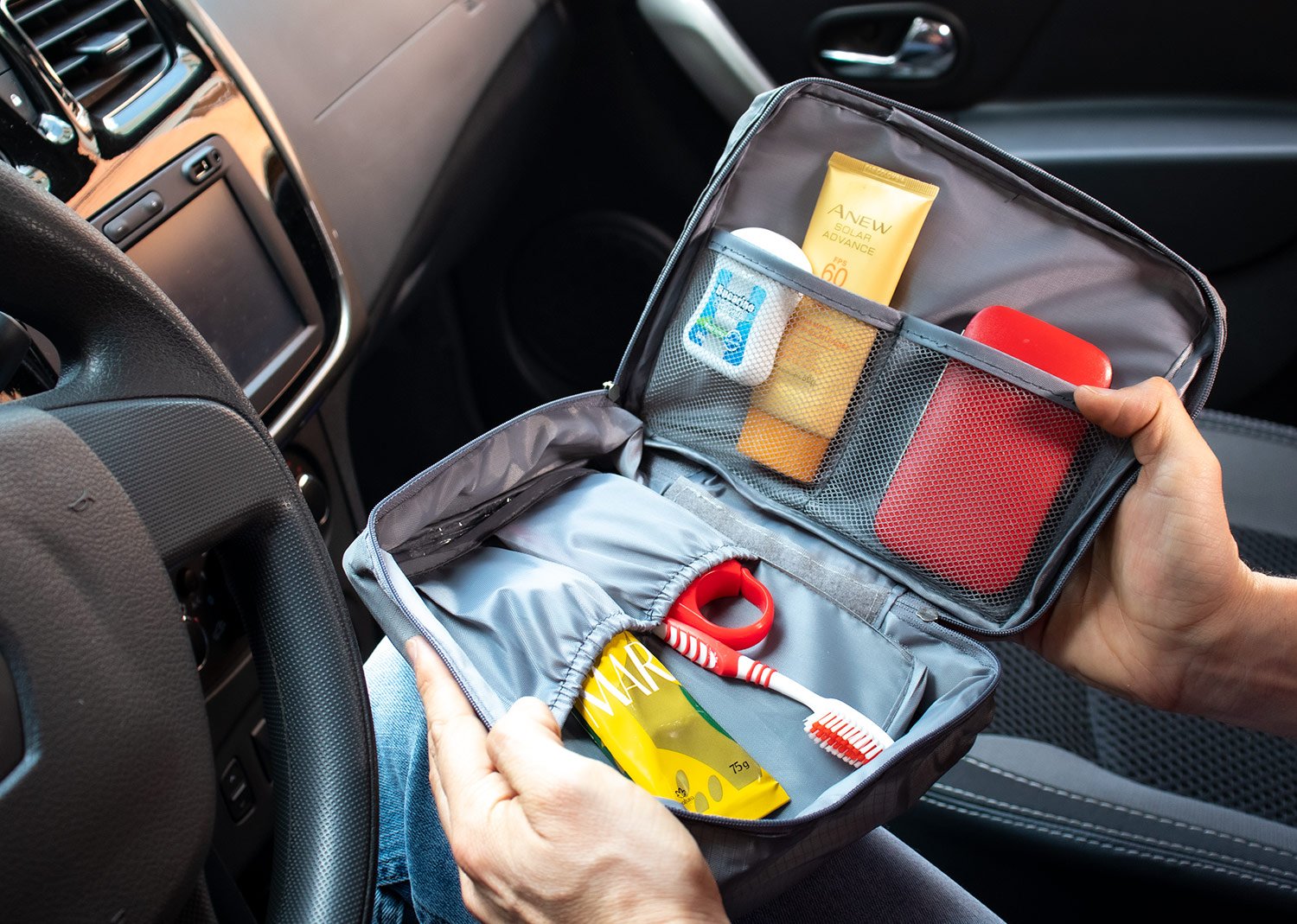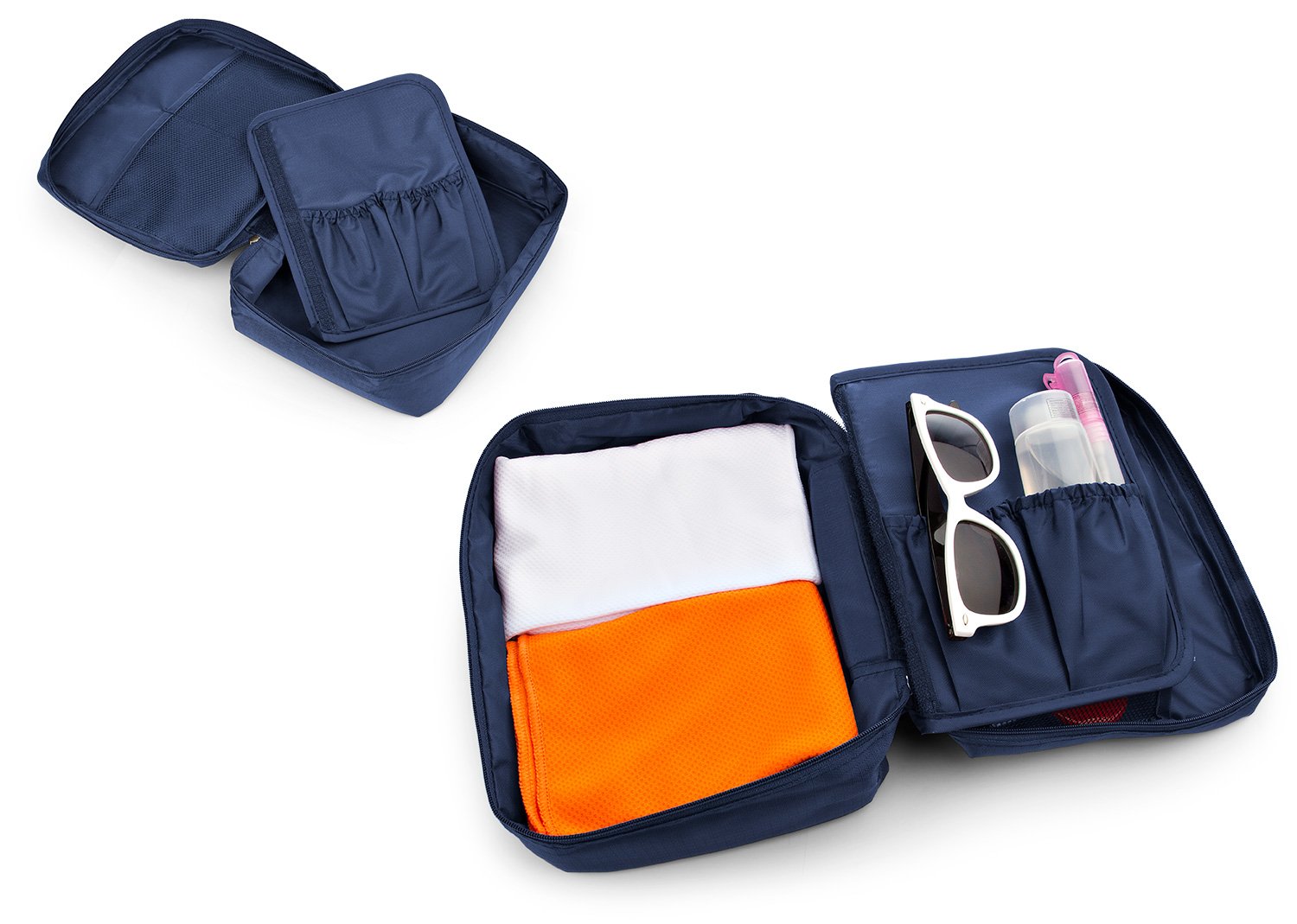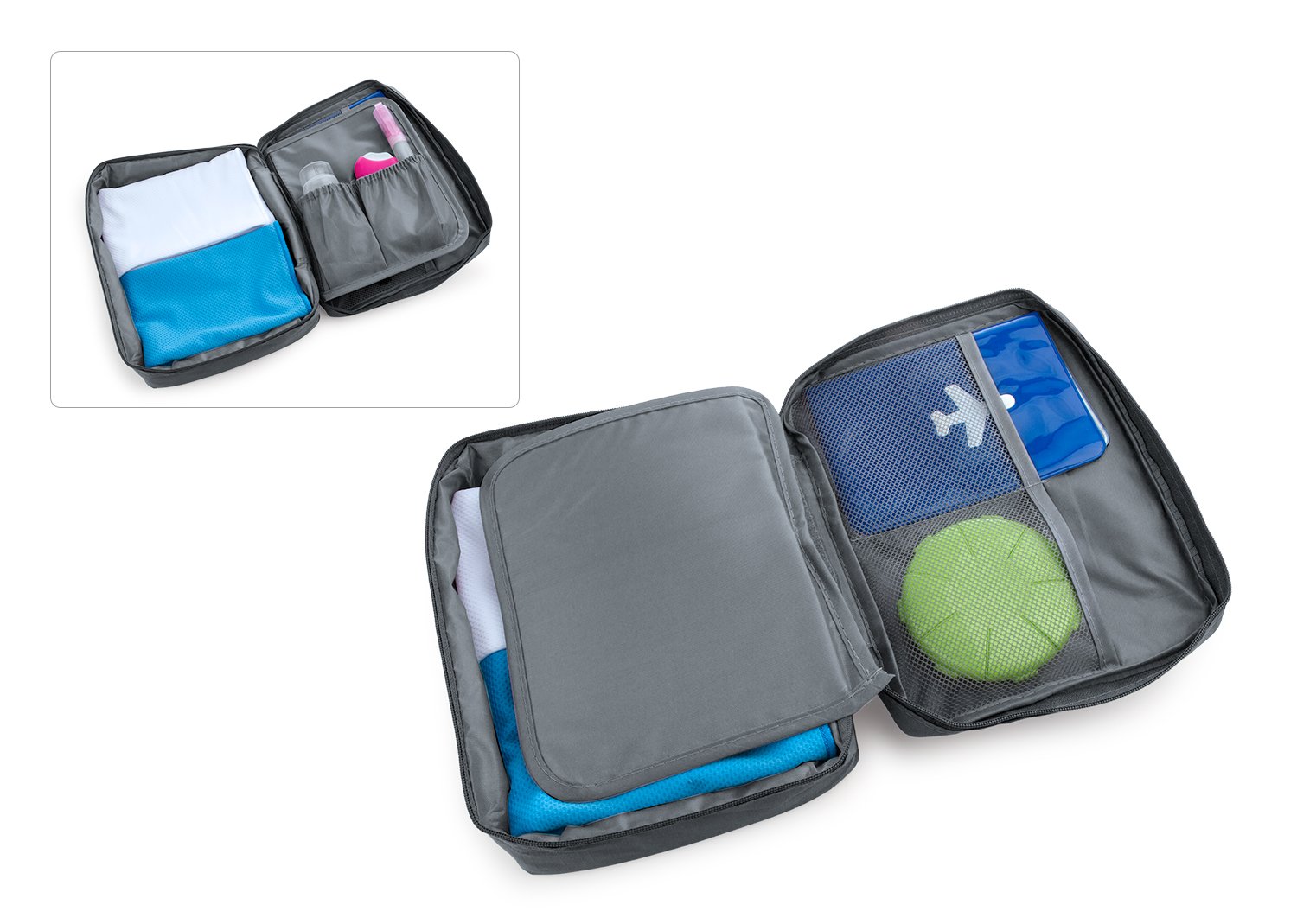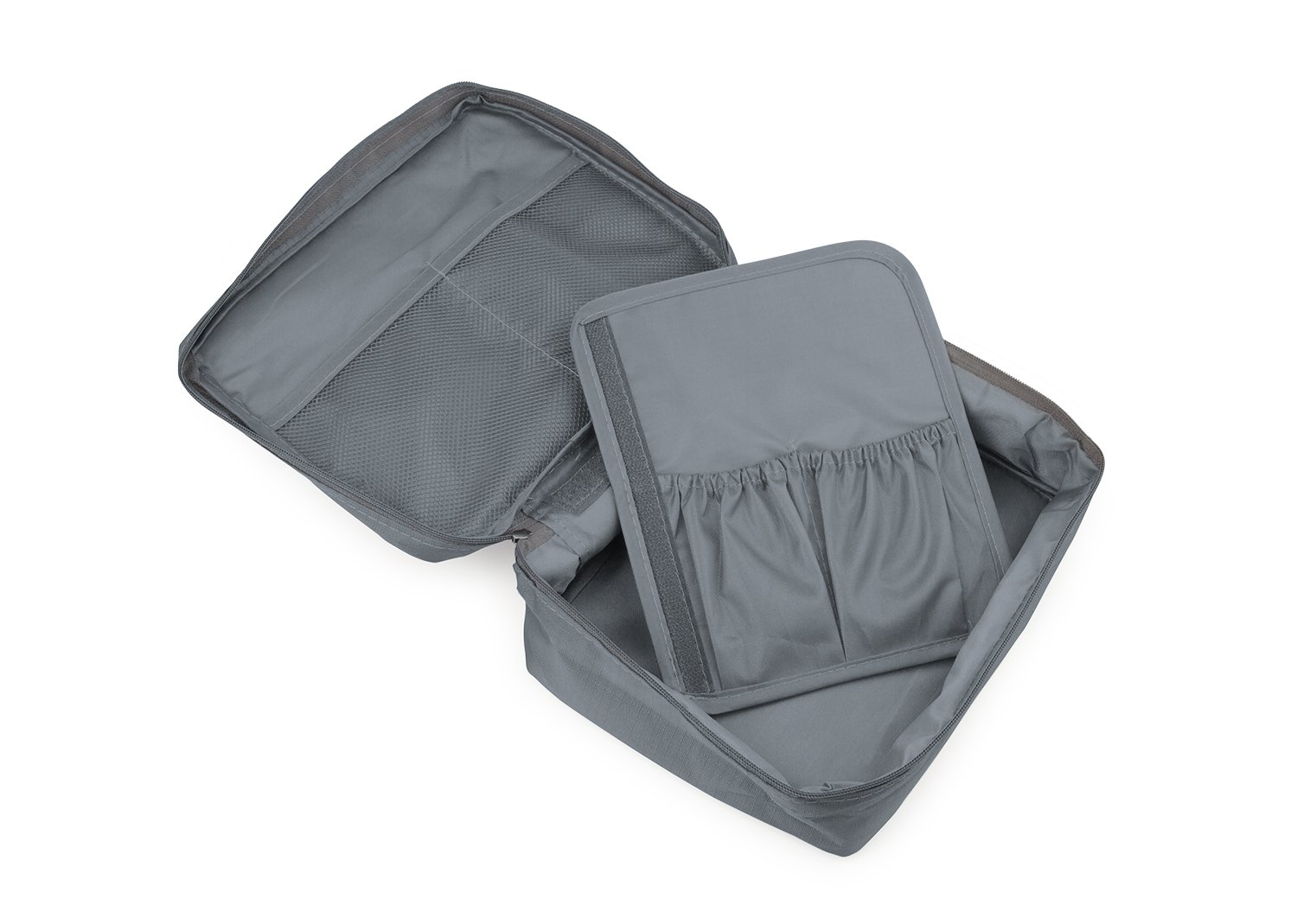 Maletas y Estuches de ViajeMaletín de viaje con agarradera, tiene 2 bolsillos tipo malla en la tapa, separador interno removible, velcro y dos compartimientos ideales para llevar frascos de aseo personal.