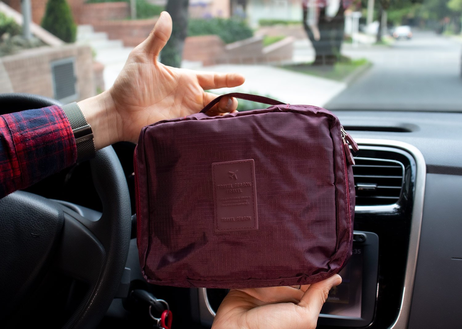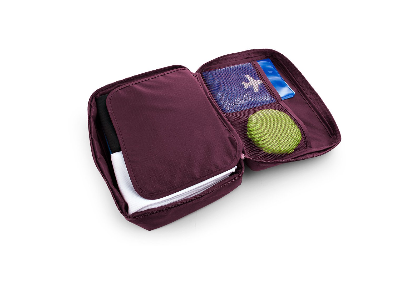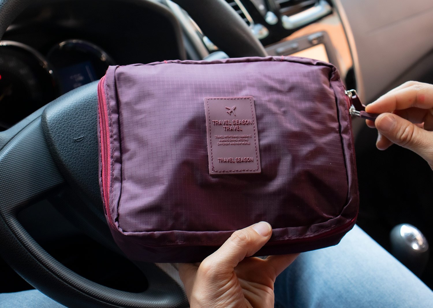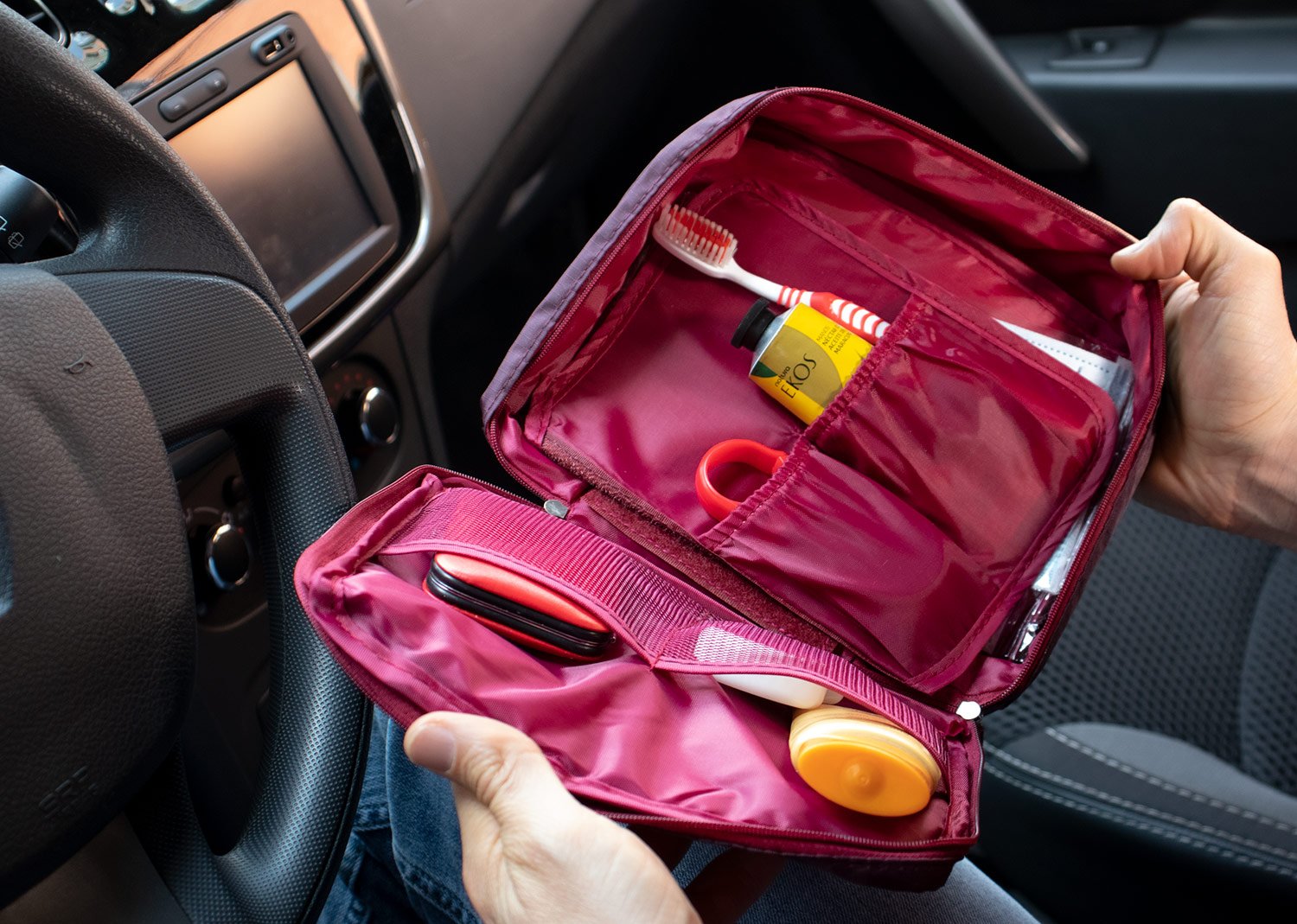Maletas y Estuches de ViajeMaletín de viaje con agarradera, tiene 2 bolsillos tipo malla en la tapa, separador interno removible, velcro y dos compartimientos ideales para llevar frascos de aseo personal.