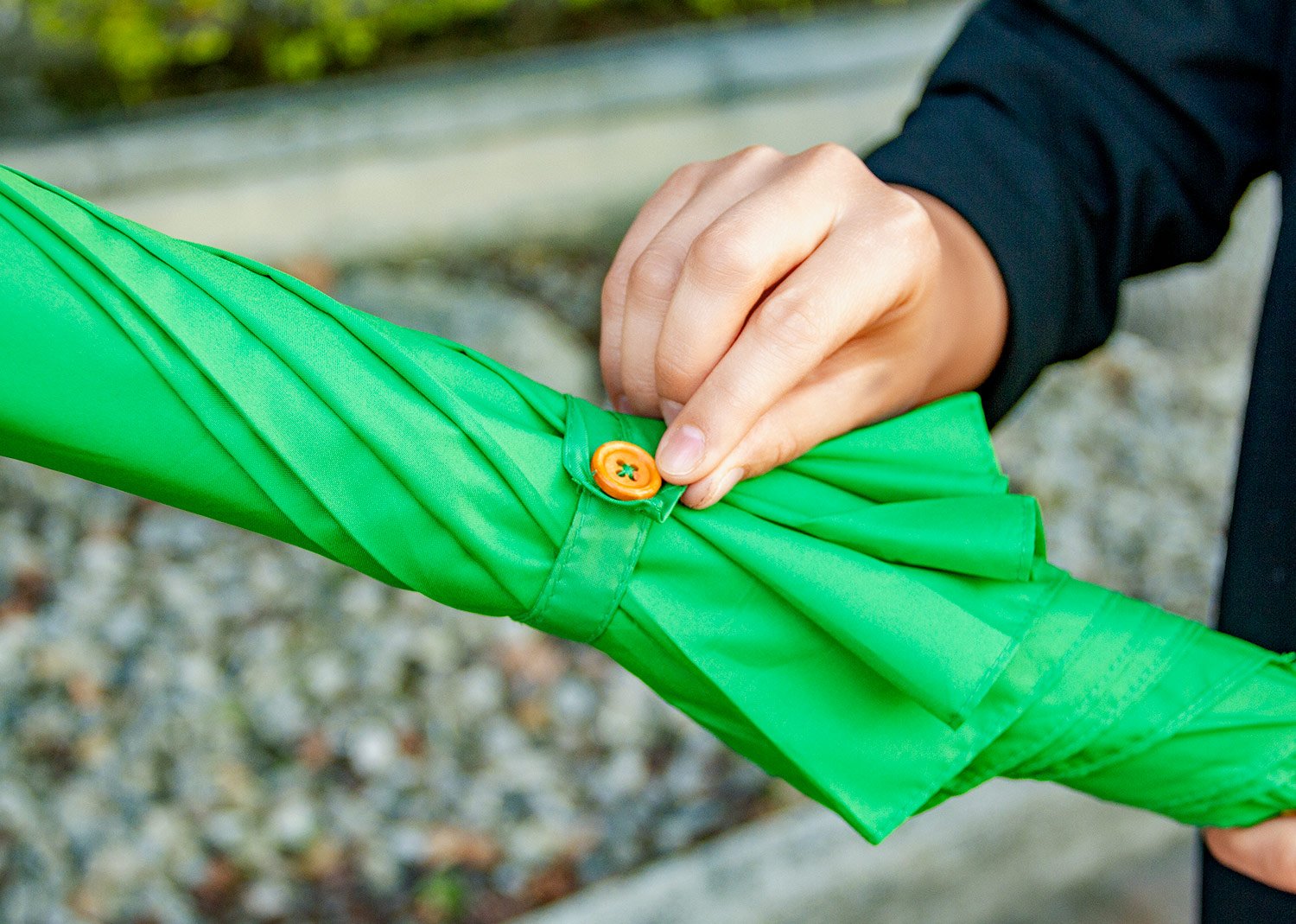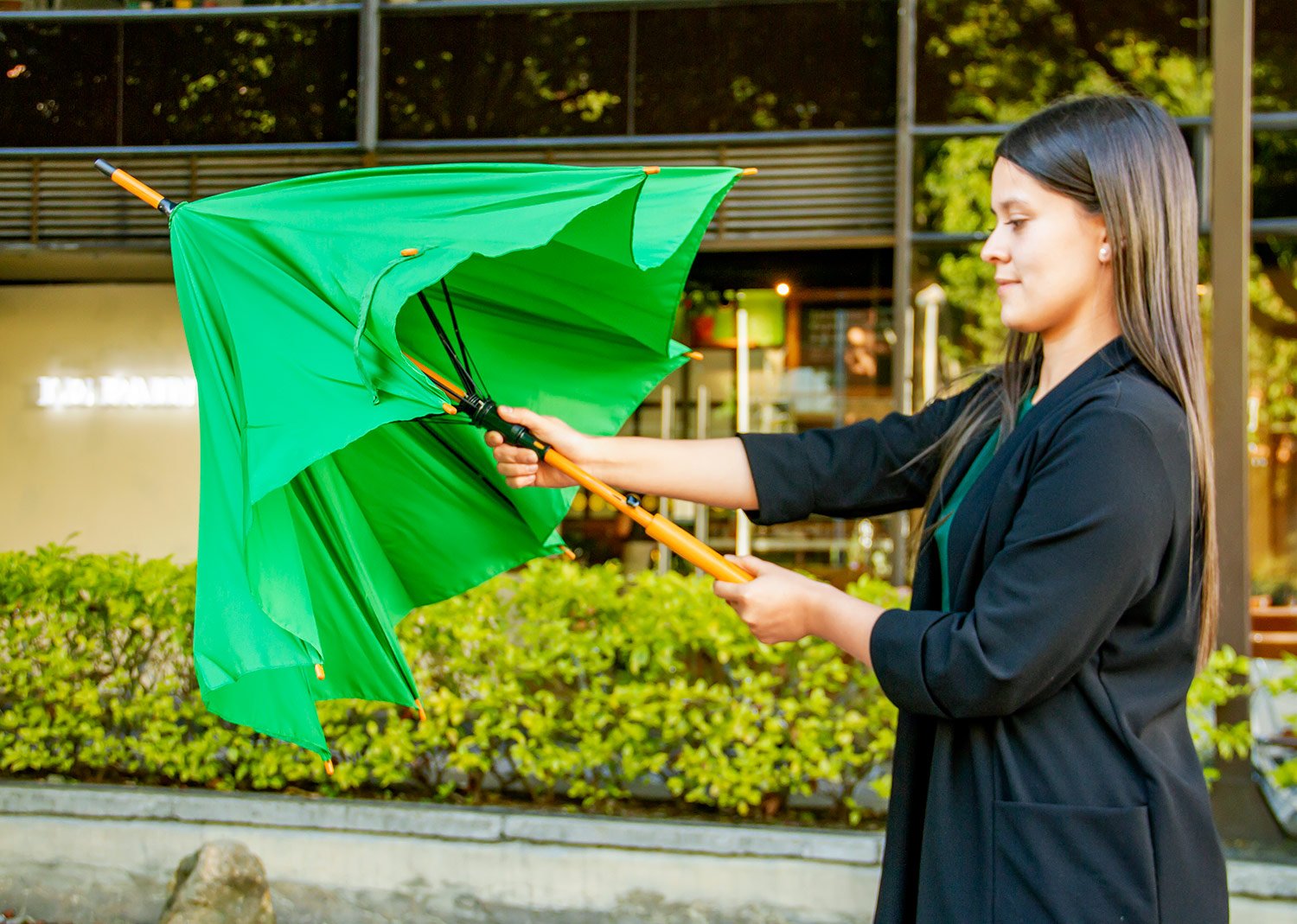 Paraguas FashionParaguas mango curvo, de apertura automática y cierre manual. Varillas y eje metálico de acabado negro. Cierre con botón de madera. (Paraguas/Sombrilla)