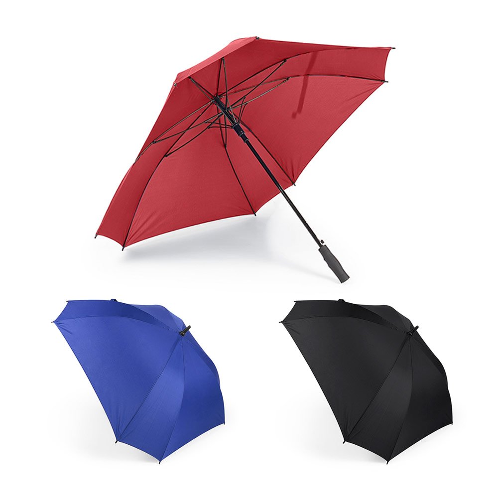 Paraguas GolfParaguas cuadrado tipo Golf de 27 con sistema de apertura automática, 8 cascos, eje y varillas en fibra de vidrio, mango en ABS con acabado de caucho, pongee 190t. (Paraguas/Sombrilla)
