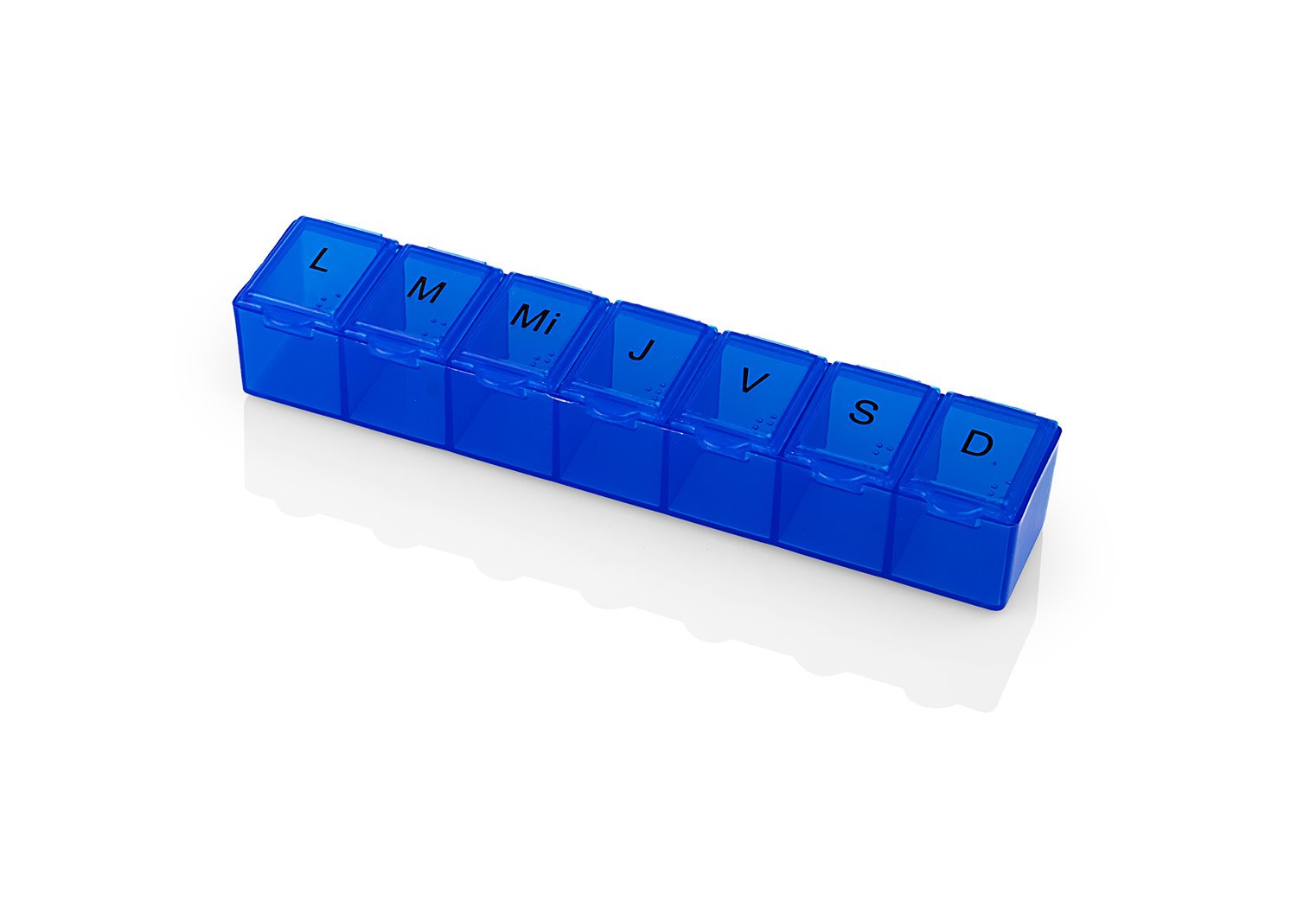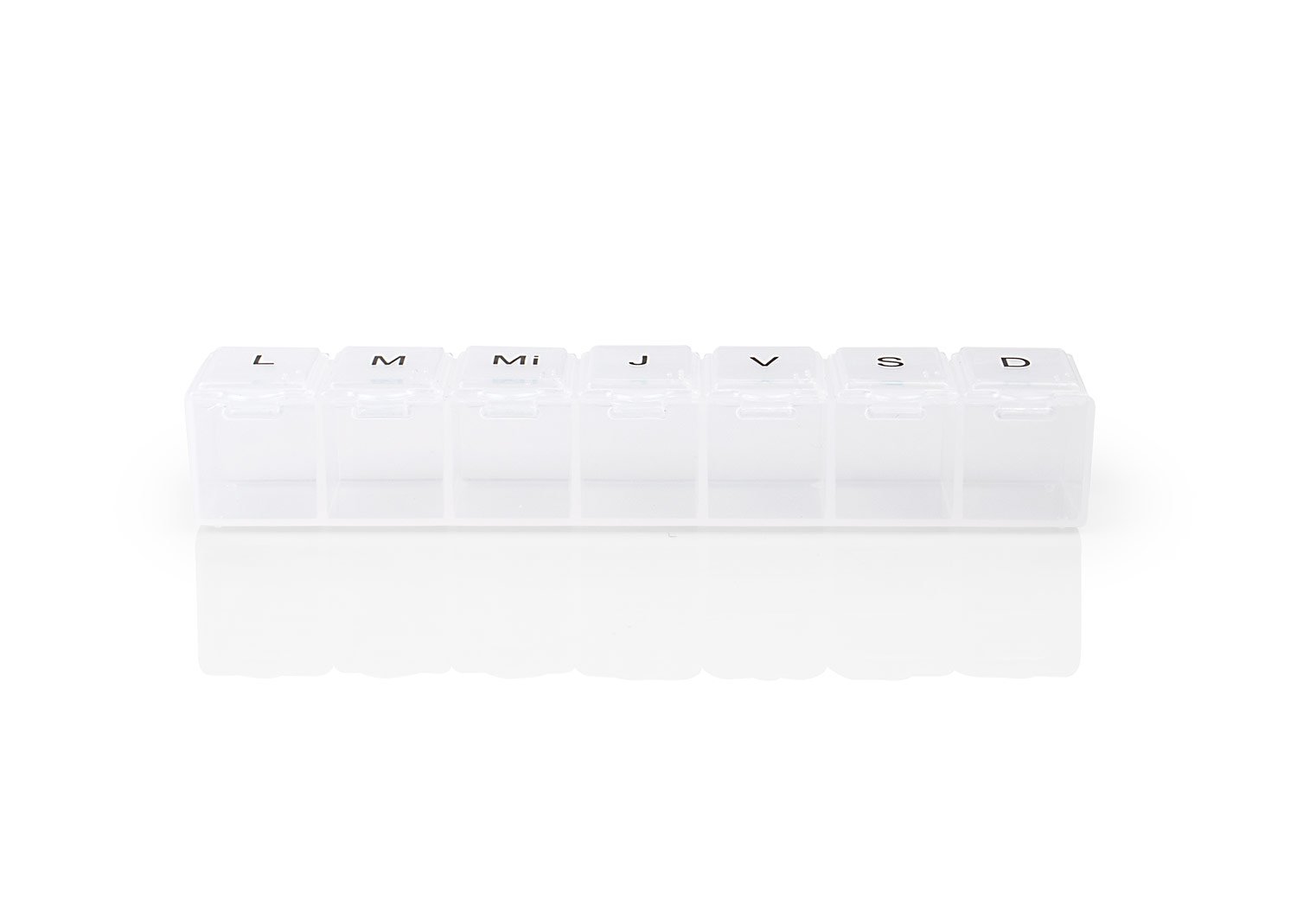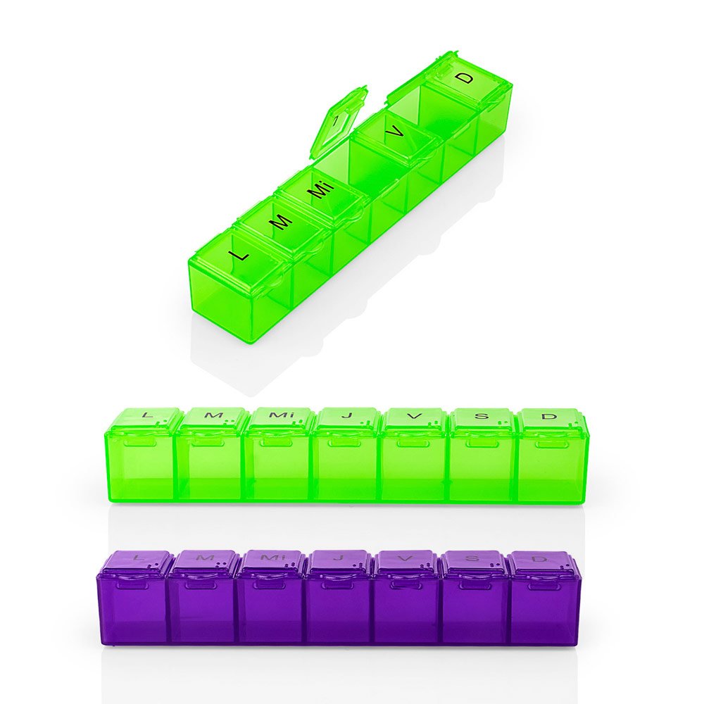 Pastillero semanal con 7 compartimientos asignados para cada día de la semana. Cierre a presión.