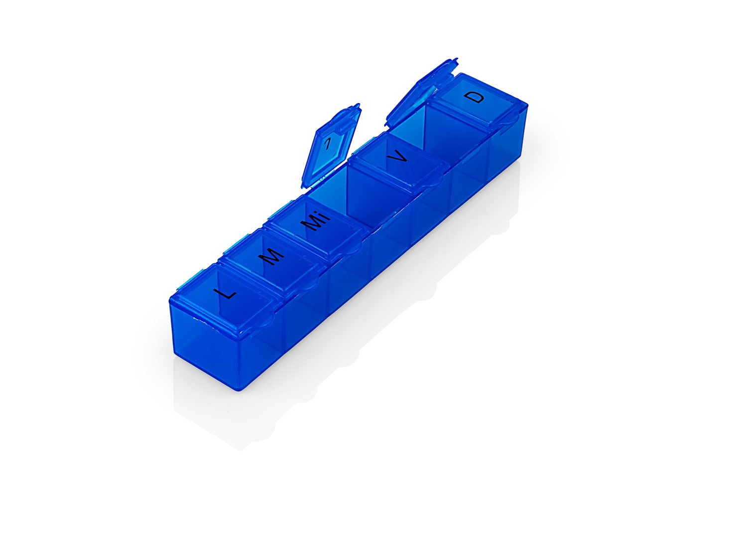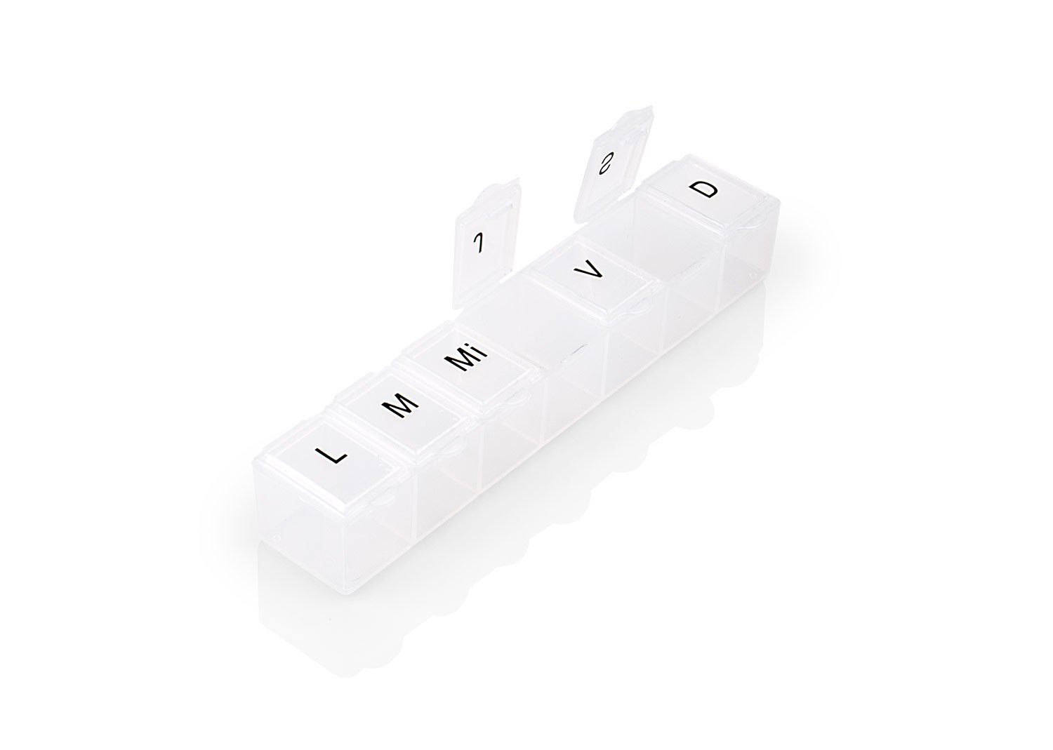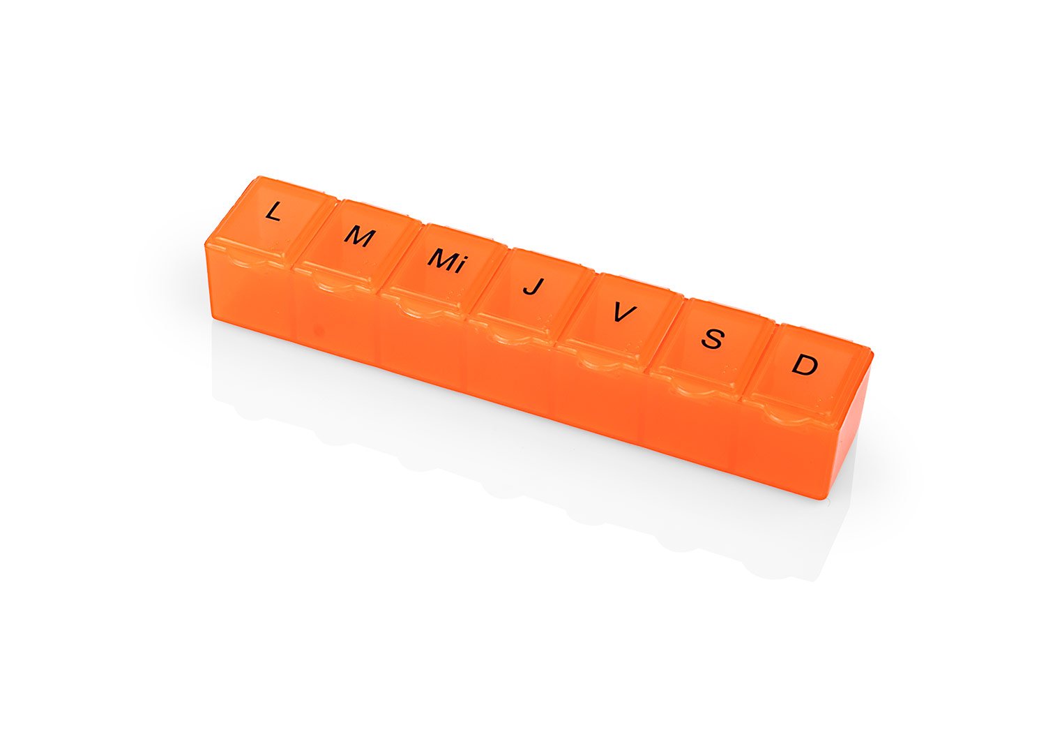 Pastillero semanal con 7 compartimientos asignados para cada día de la semana. Cierre a presión.
