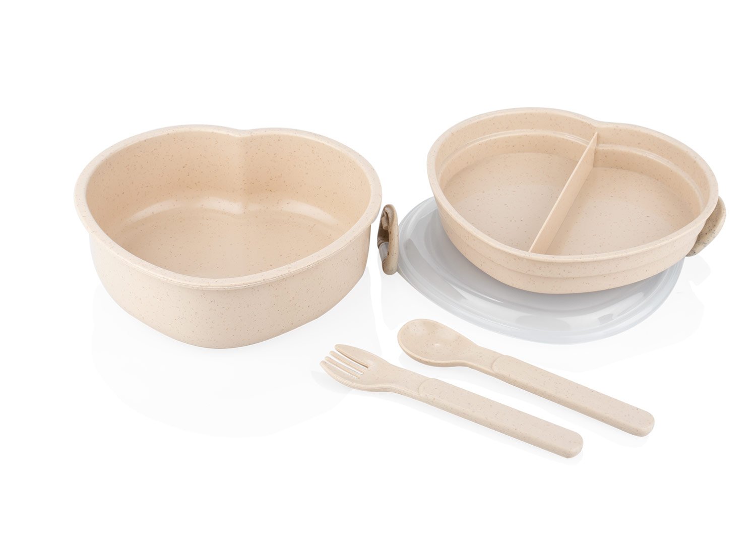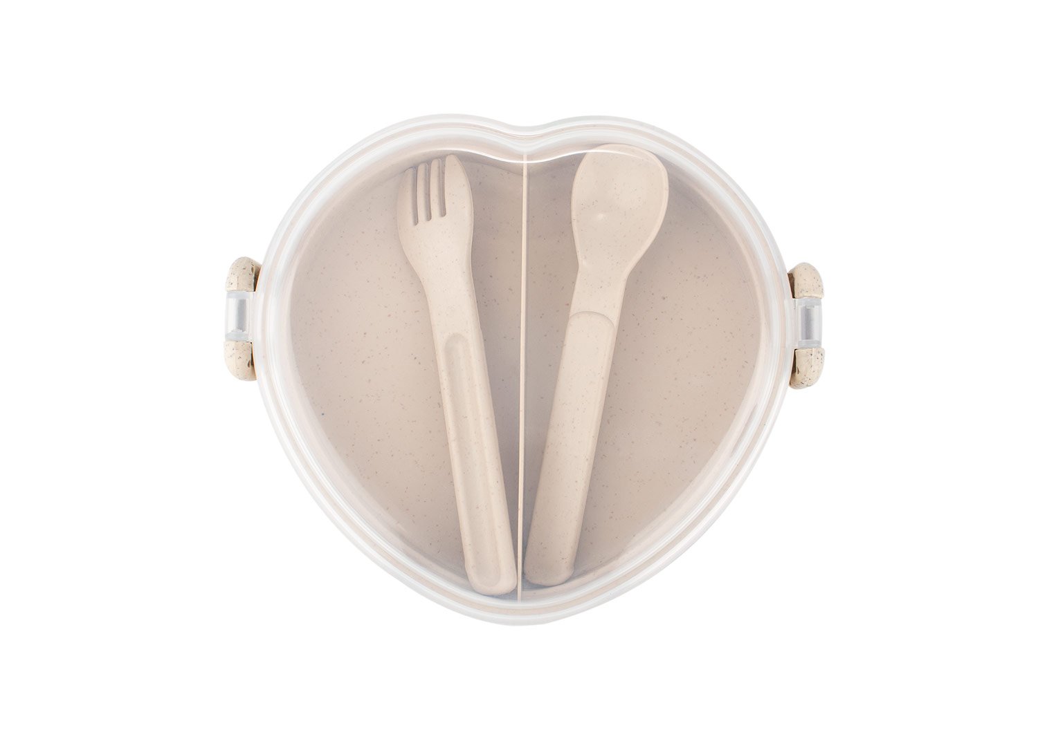 Accesorios de CocinaDiseño con forma de corazón, fabricada en material de paja de trigo con tapa de PP transparente. Incluye cuchara (2,7 X 12,2) y tenedor (2,3 X 12,2) del mismo material y color que la base, ubicados en un compartimiento adicional (14,2 X 13) para mayor organización. La tapa cuenta con cierres laterales que aseguran un cierre firme. Una opción ecológica y funcional para transportar tus comidas con estilo.