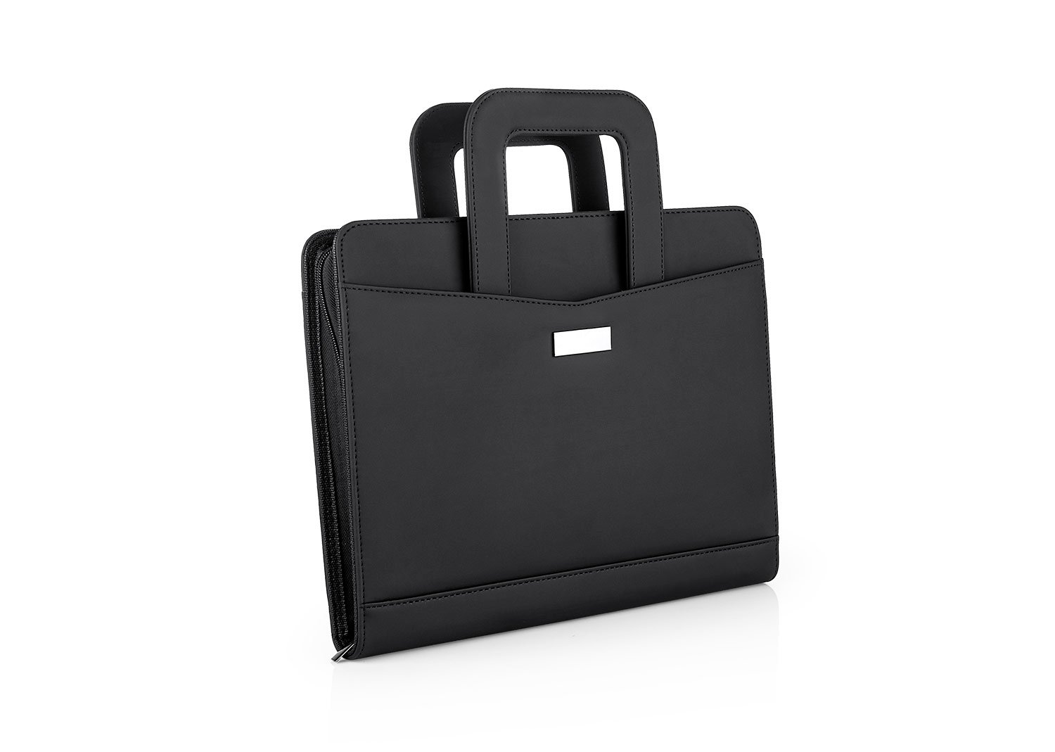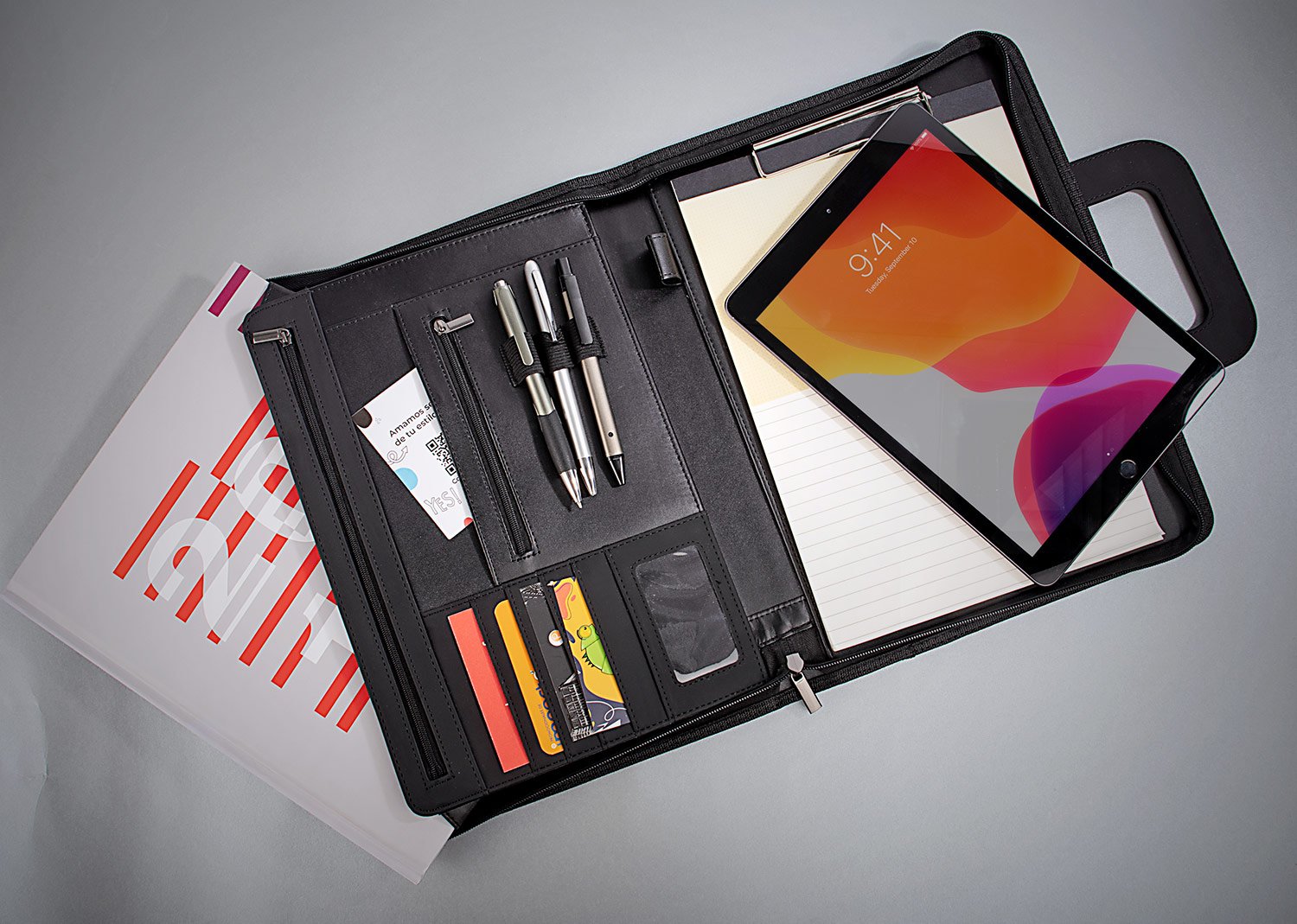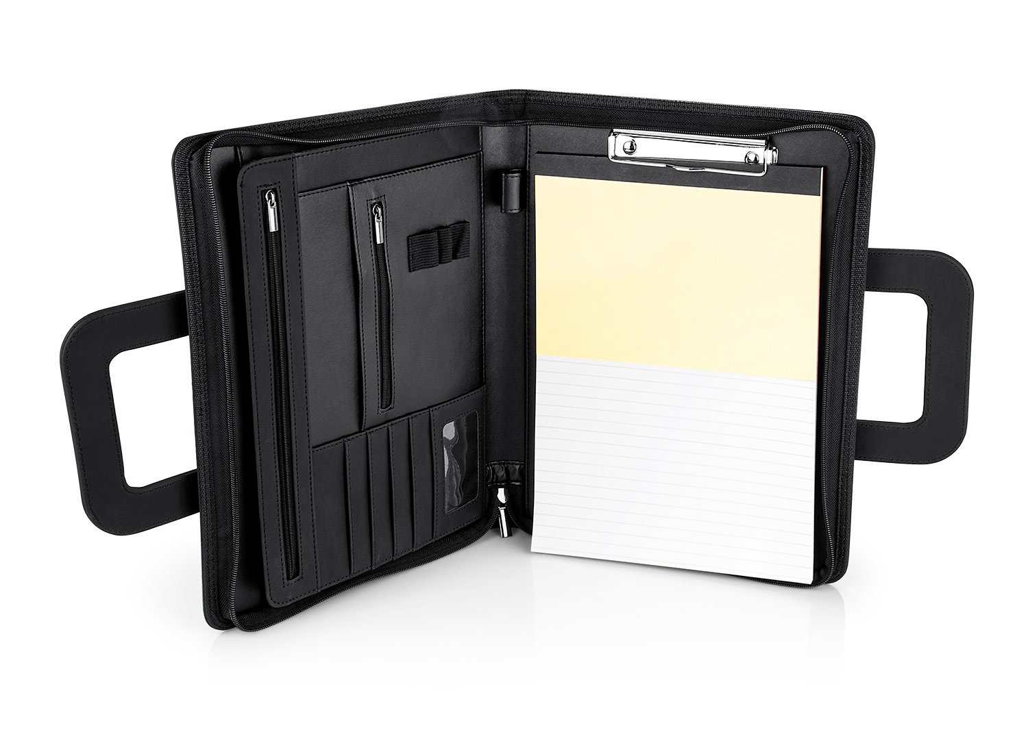Accesorios de EscritorioPortafolio en PU, con bloc de notas papel blanco con 30 hojas rayadas, gancho legajador metálico, dos agarrraderas que se ocultan y permiten transportar facilmente, multiples bolsillos para organizar tarjetas de presentación, bolígrafos, calculadoras, bolsillo prinicipal para guardar portatil o tablets de 12″